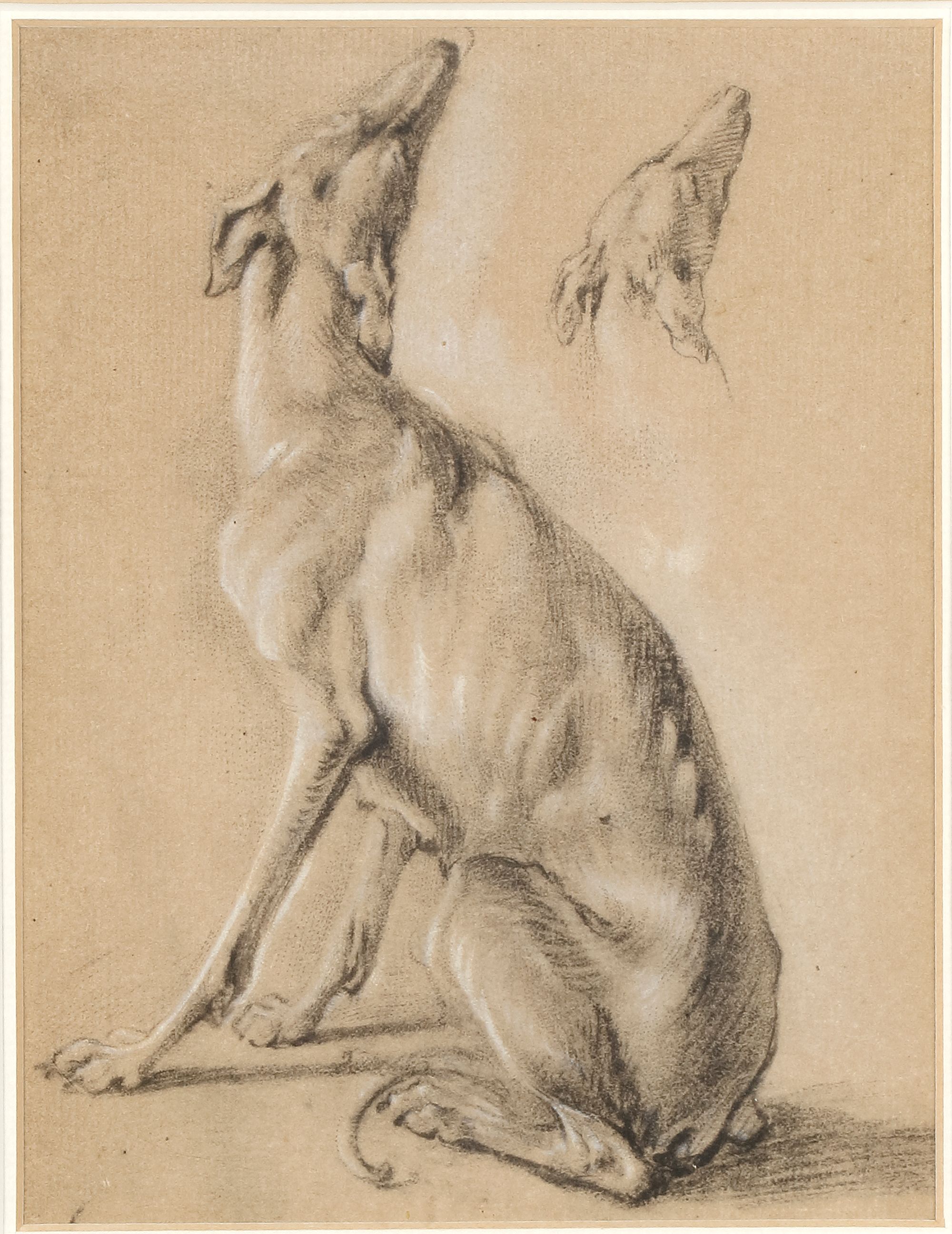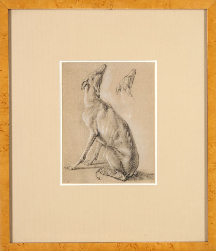 This beautifully rendered charcoal drawing captures the elegance and anatomy of a greyhound, with a secondary sketch of the dog’s head in profile. The detailed shading and soft textures emphasize the dog’s lean, muscular form.