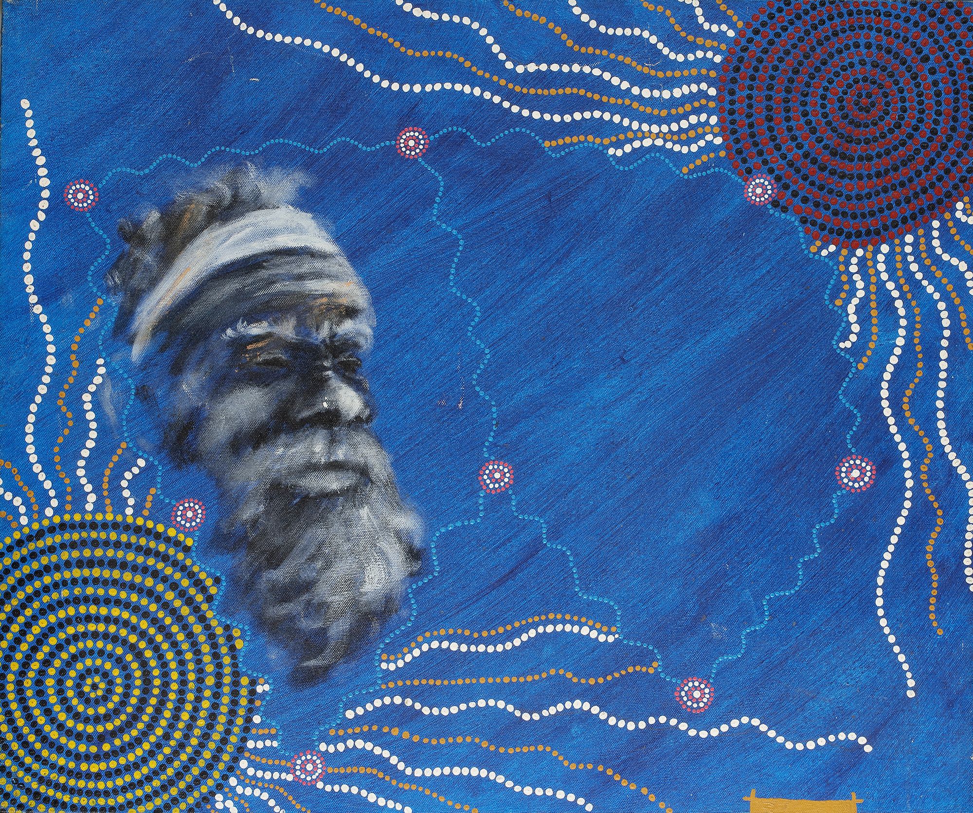 A wise Elder’s face emerges from a vibrant blue backdrop, framed by radiating patterns, sacred meeting circles, and a symbolic map-like outline.