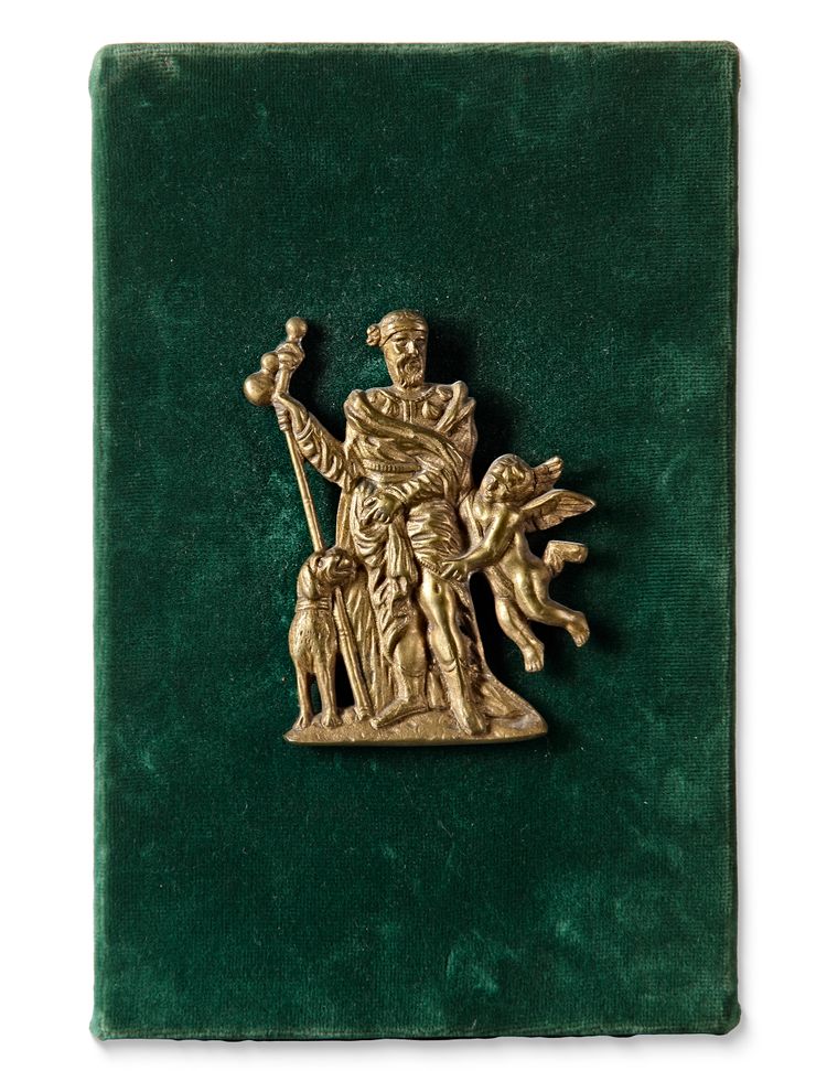 Elegant bronze relief depicting a robed man with a staff, accompanied by a dog and winged cherub. Mounted on green velvet, likely of European origin with classical or religious symbolism.