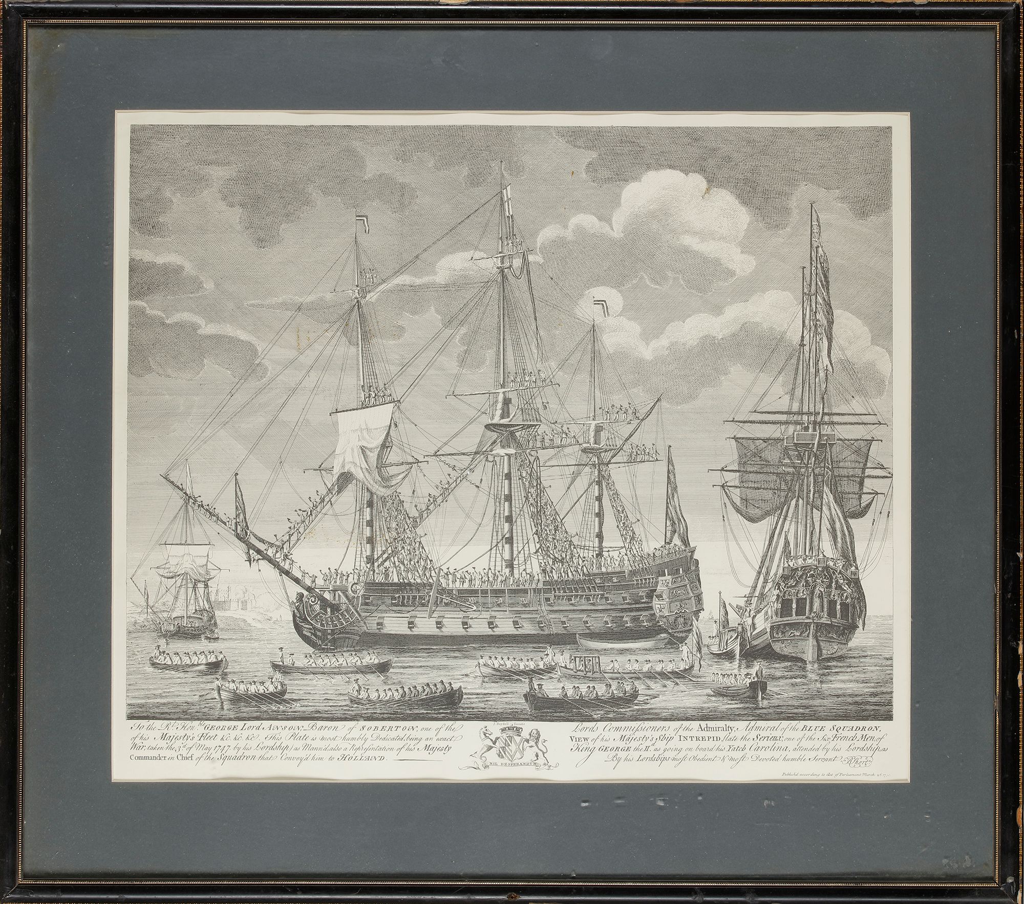 A finely detailed 18th-century maritime engraving depicting His Majesty’s Ship Intrepid and accompanying vessels, with numerous rowing boats ferrying officers and crew.