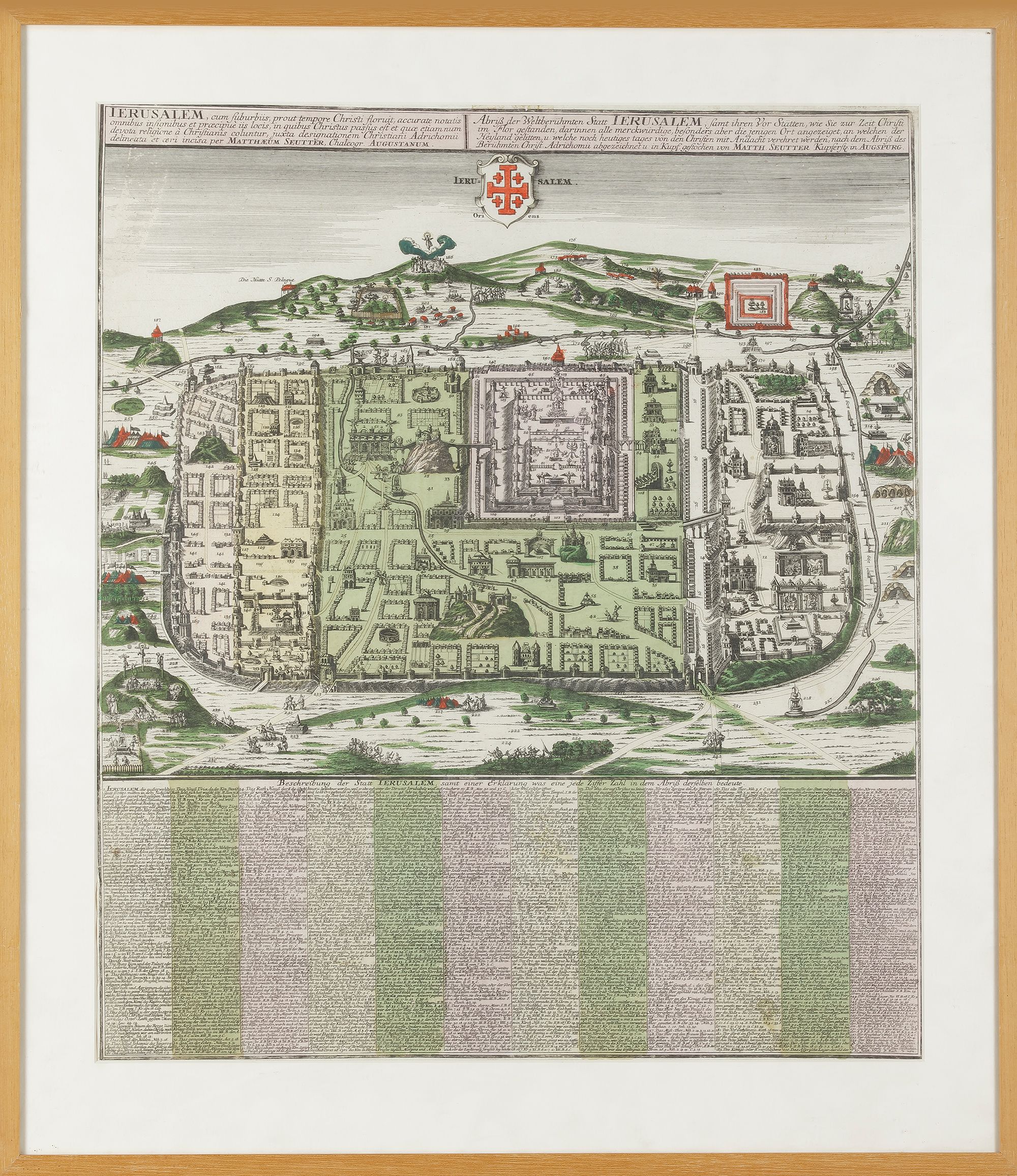 A beautifully engraved and hand-colored historic plan of Jerusalem, depicting the ancient city with detailed landmarks, surrounding hills, and an extensive key identifying important biblical and historical sites. Rich in topographical and architectural detail, it reflects classic European cartographic artistry. 70 by 61 cm.