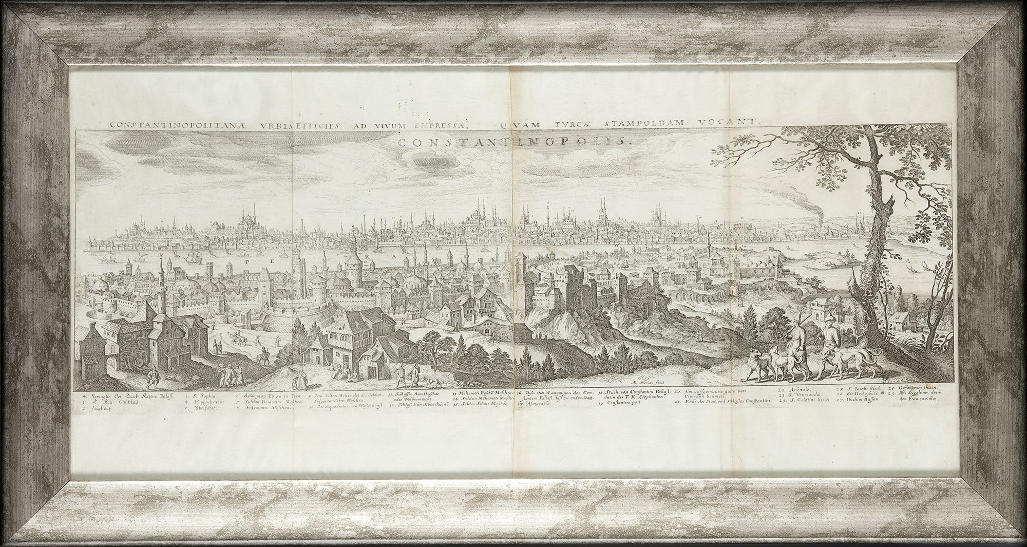 A grand early engraved panorama of Constantinople, capturing the city’s skyline with its dense array of domes, minarets, fortifications, and bustling harbor. Rich architectural detail and lively foreground scenes create a vivid depiction of the Ottoman capital’s magnificence.