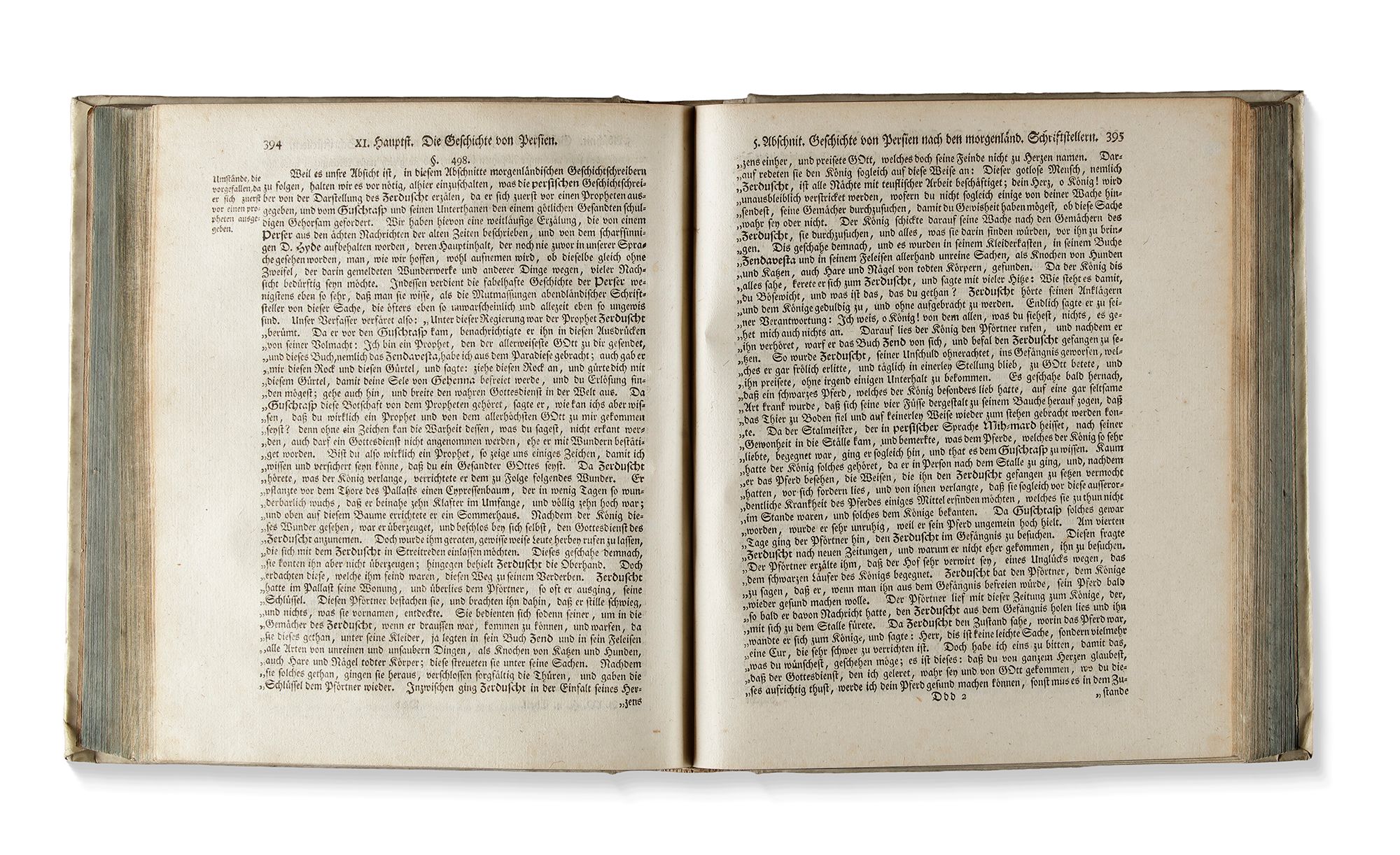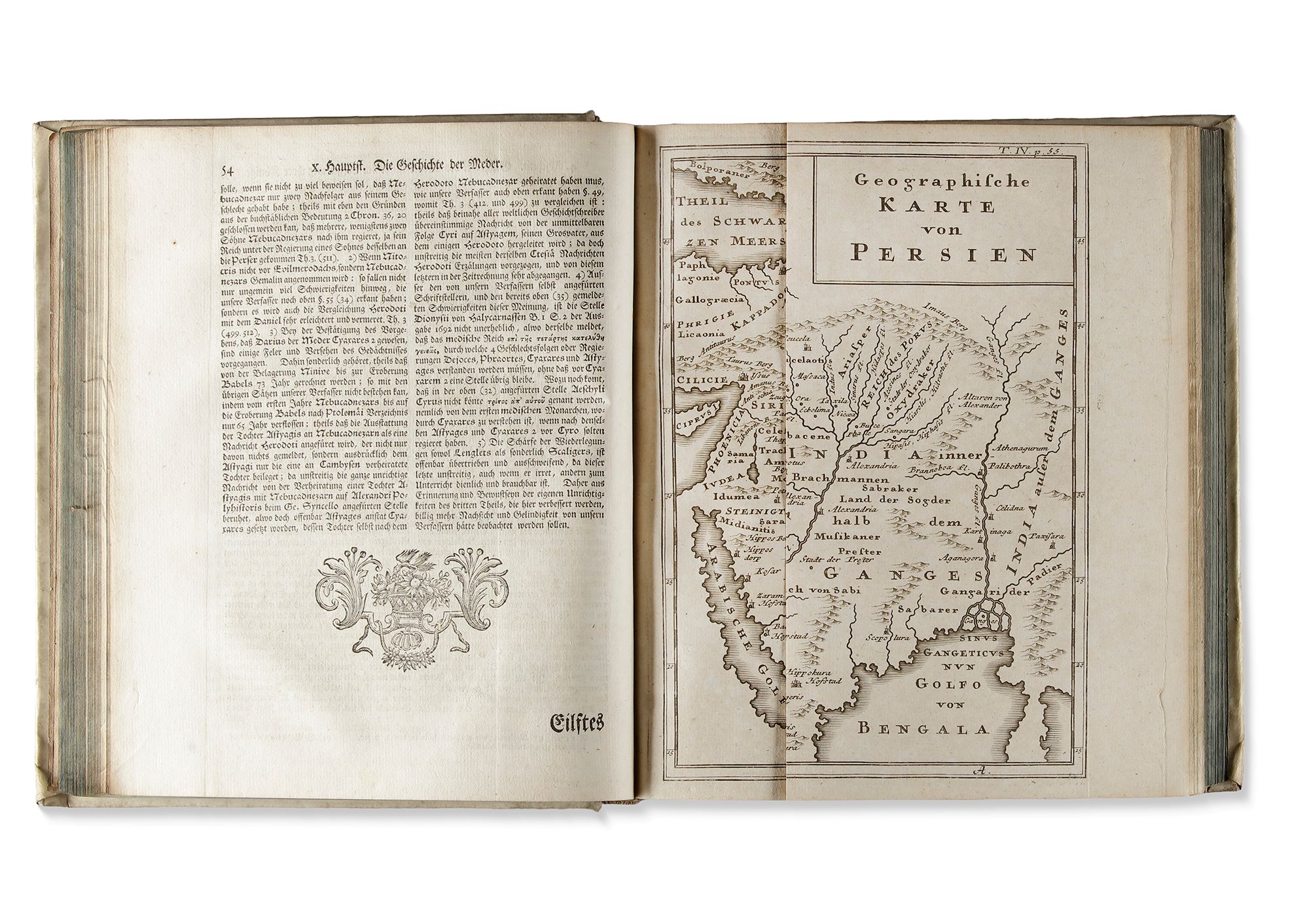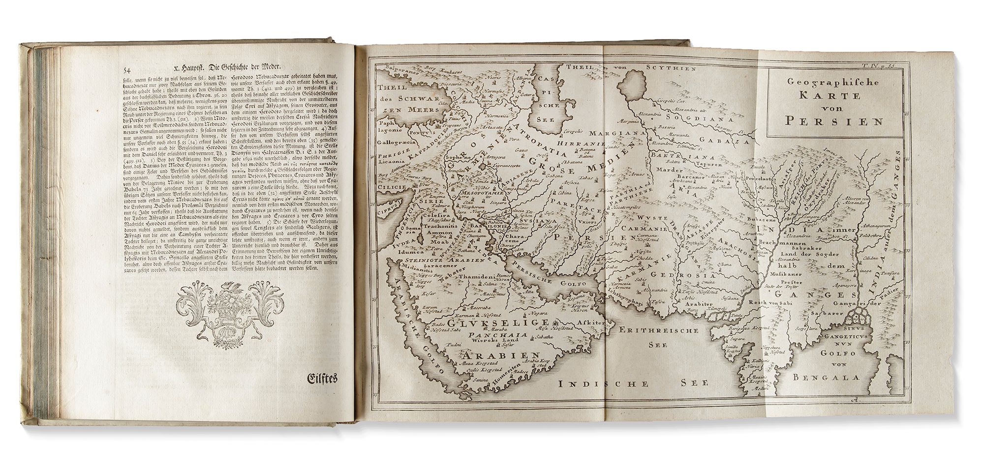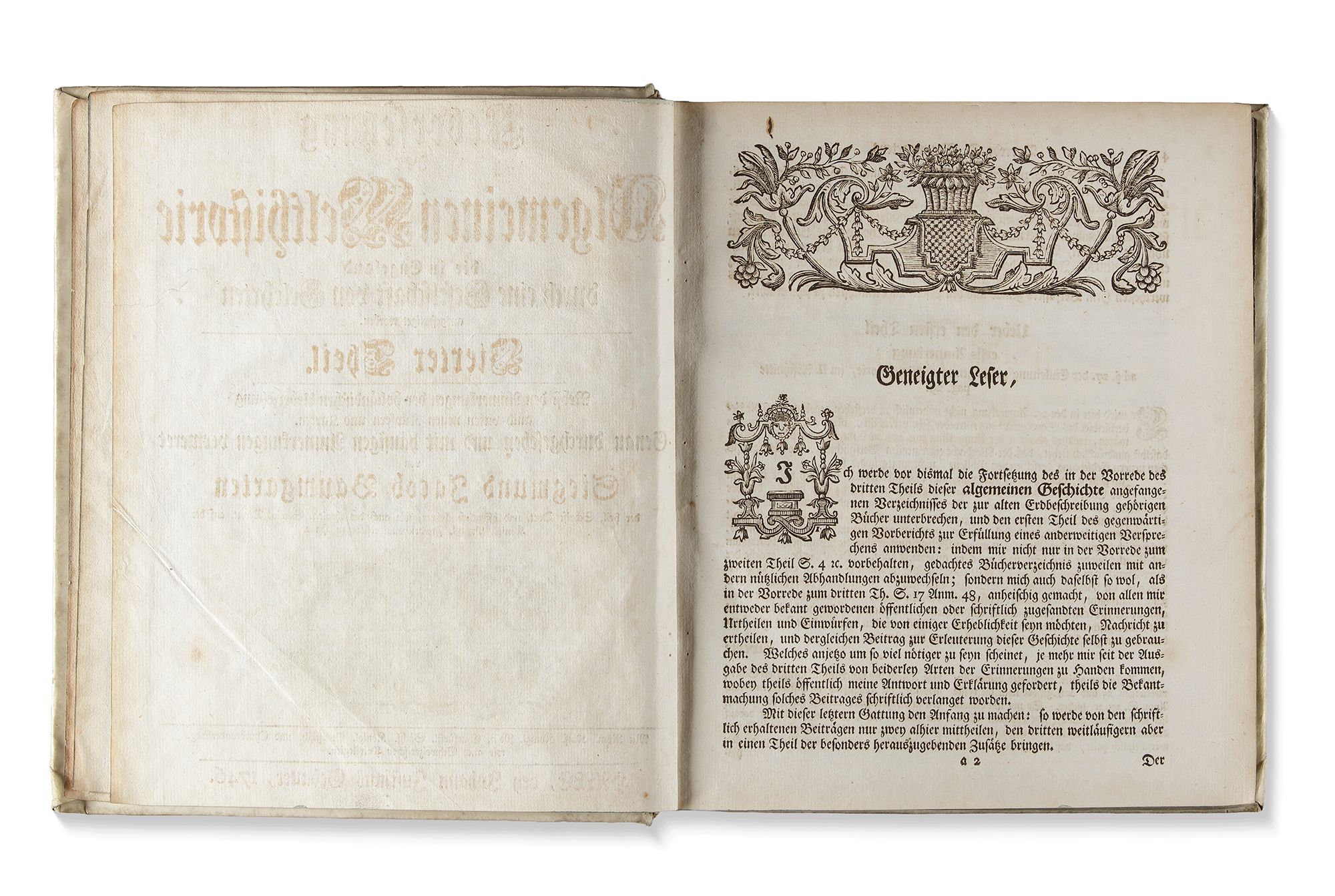This is a 1746 German edition of Allgemeine Welt-Historie (“General World History”), translated and expanded by Siegmund Jacob Baumgarten. It forms the fourth part of a large scholarly encyclopedic history originally compiled in England and further enriched with notes, copper engravings, and maps.
