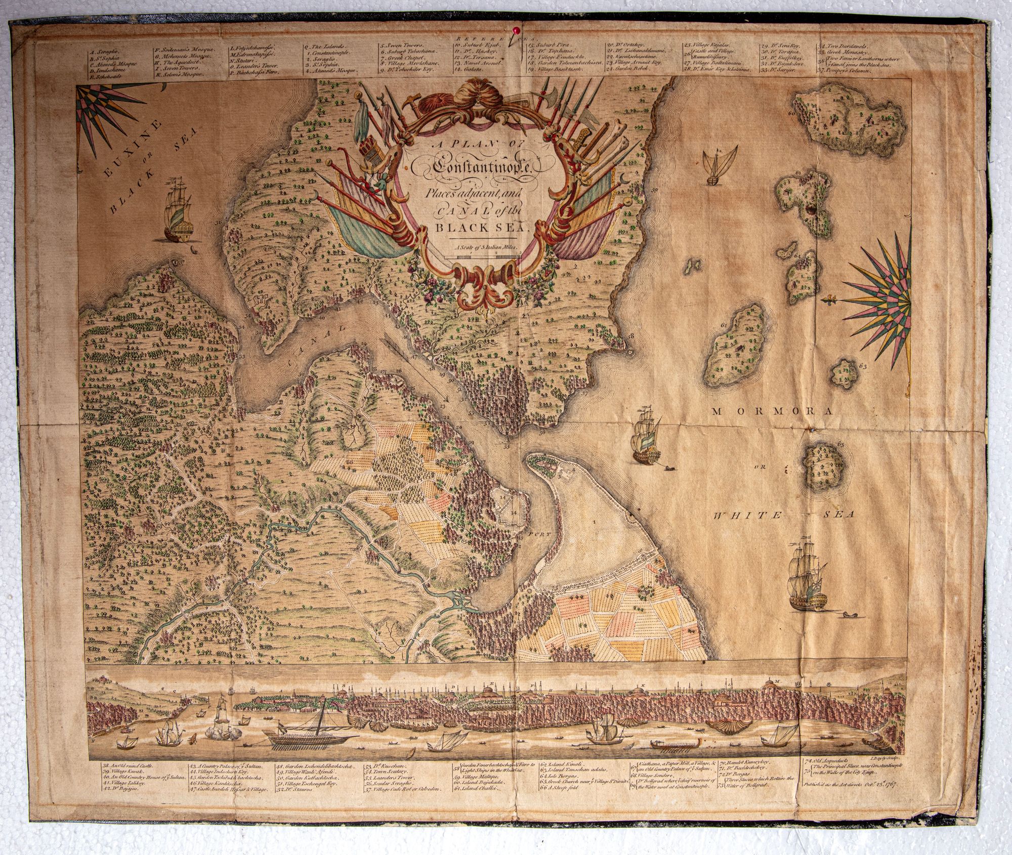 An ornate 18th-century map depicting Constantinople, its surrounding regions, and the canal linking the city to the Black Sea. Richly decorated with heraldic motifs, ships, and detailed landscapes, the map reflects European cartographic artistry and strategic interest in the city’s geography, waterways, and imperial importance 50 by 41 cm