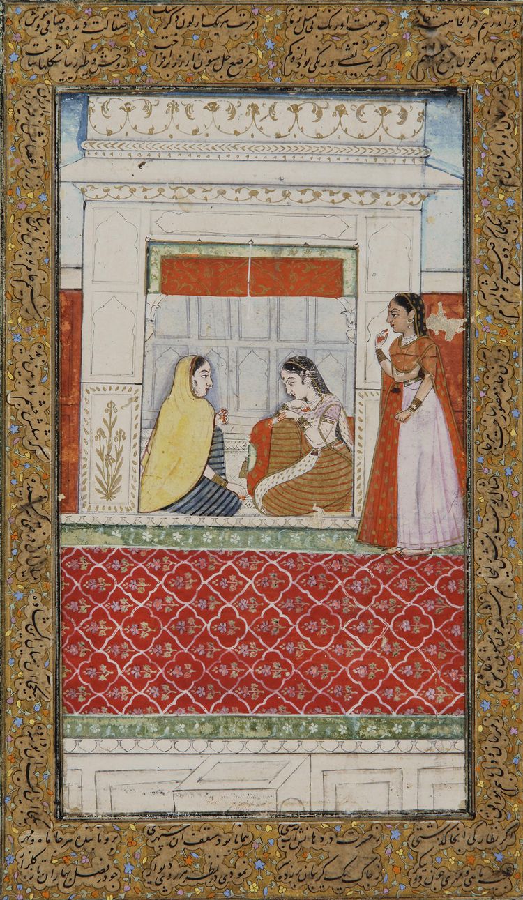 Gouache pigments heightened with gold on paper, laid down on an album page with outer polychrome borders, depicting a Hindu woman seated with a Mughal lady and her servant in a temple. The later outer margin is decorated with Persian inscriptions in nastaliq script reserved in clouds on a cream-colored ground, further stylized with polychrome flower sprays on a gilt ground.