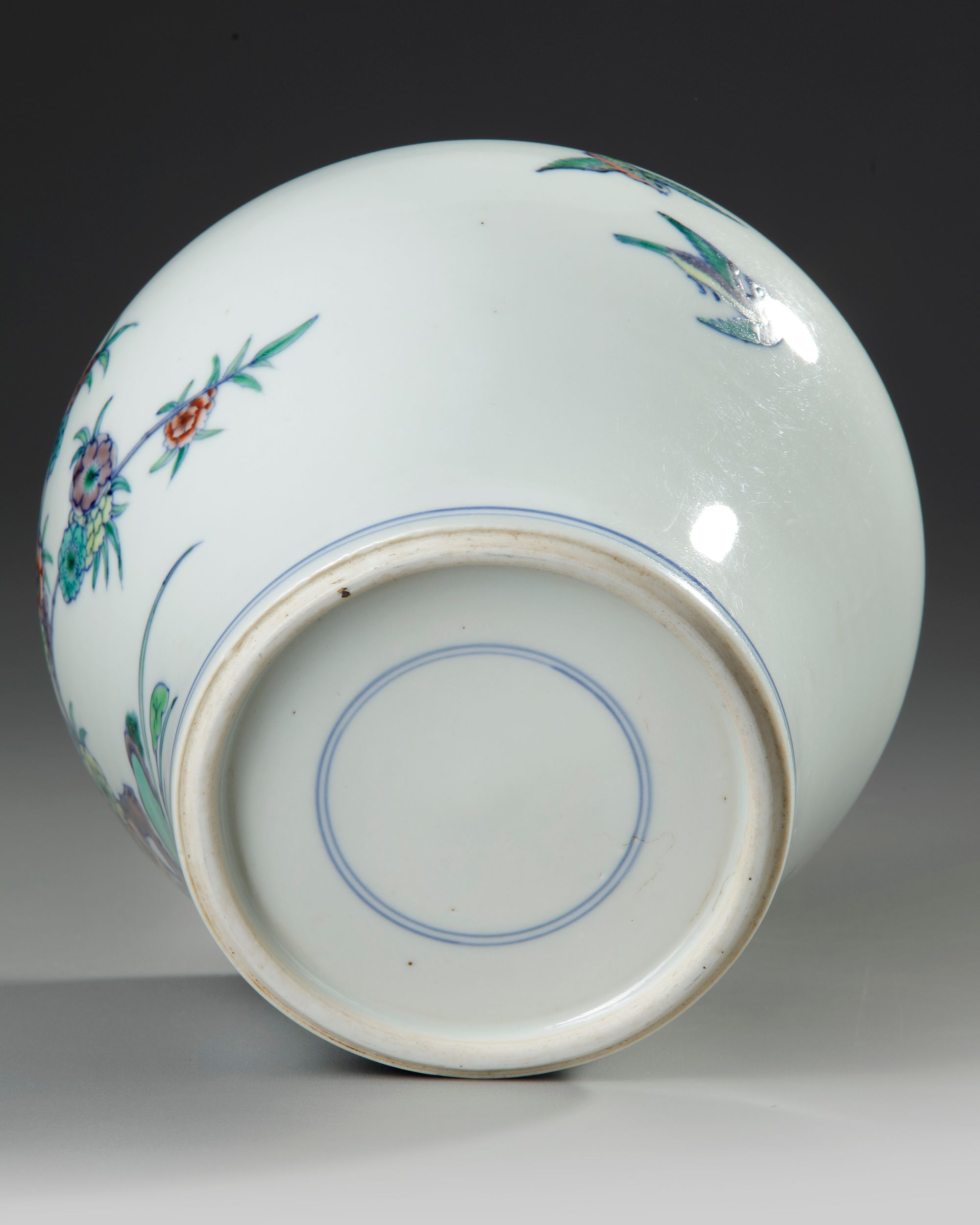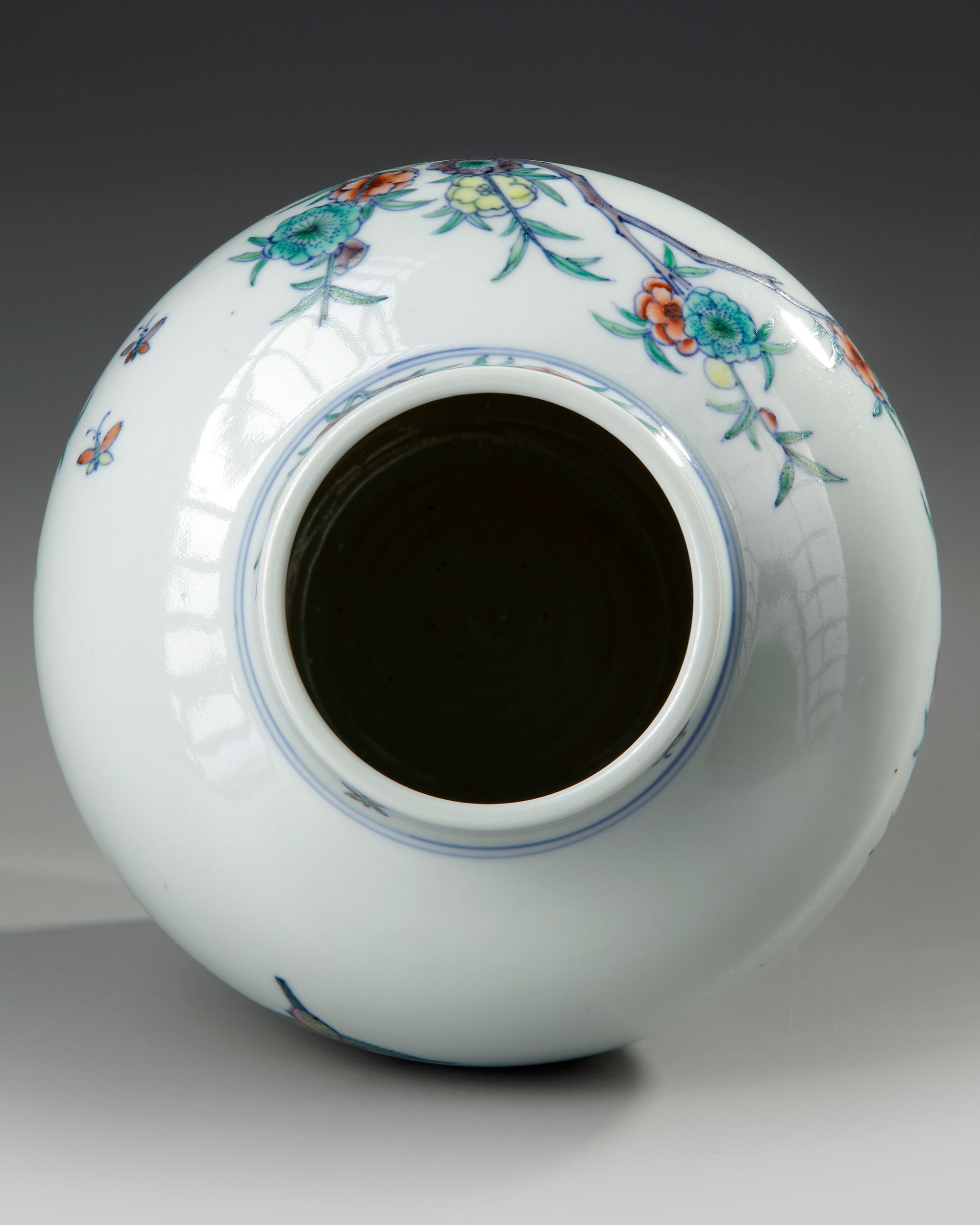A Chinese porcelain vase, enameled with butterflies flying over blossoming trees growing from ornamental rocks. Height: 18 cm.