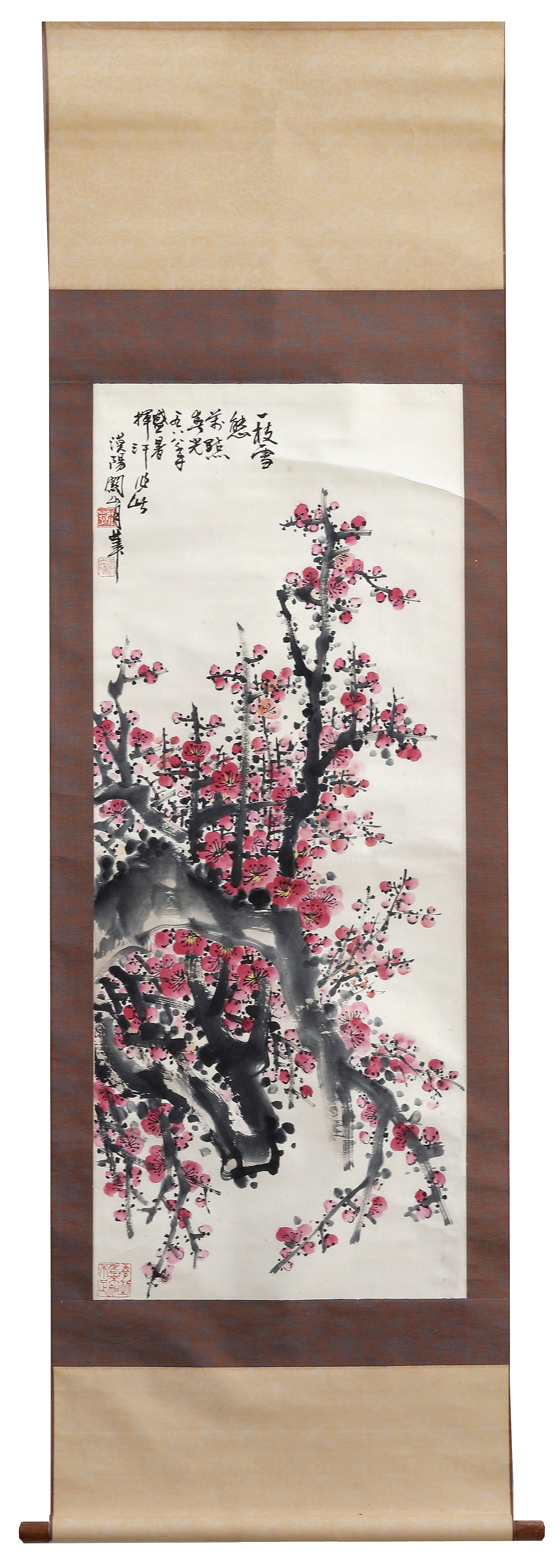 A Chinese scroll decorated with a cherry blossoming tree with Chinese poems. Painting : 42 by 105 cm.