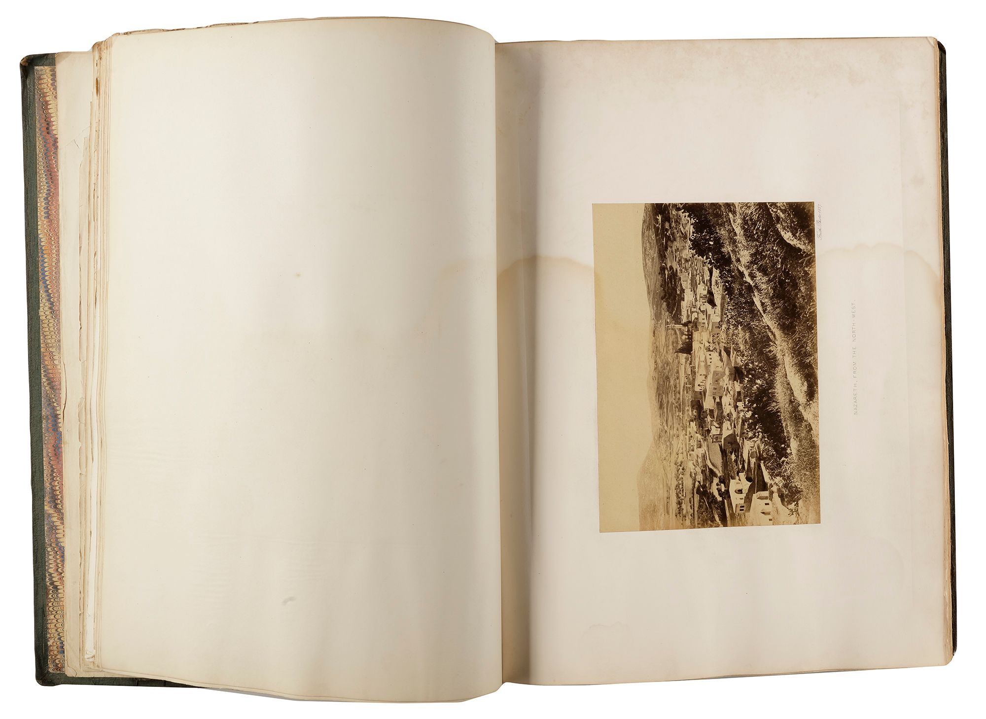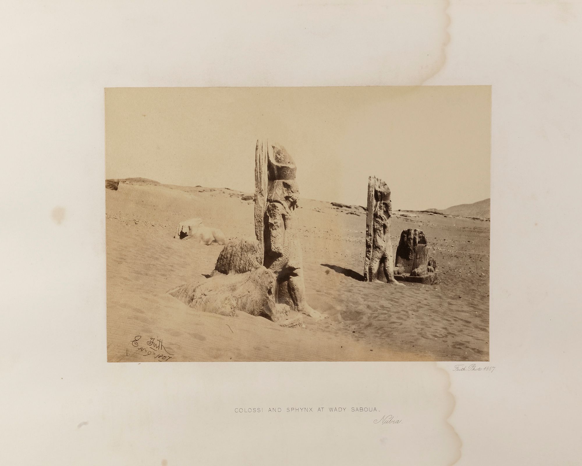 Before turning his attention to photography around 1850, Francis Frith was apprenticed to a cutlery firm and worked as a wholesale grocer. With a partner he opened the Frith & Hayward photography studio in Liverpool. In 1856 Frith made an extended trip to Egypt, traveling up the Nile from Cairo to Abu Simbel. He photographed along the entire way, using three different cameras: a stereoscopic one and large format cameras using negatives of 8 by 10 and 16 by 20 inches. Negretti & Zambra, one of the major photographic publishers in Great Britain, published a hundred of Frith's stereo views the following year, and the firm of Thomas Agnew and Sons offered the larger prints.