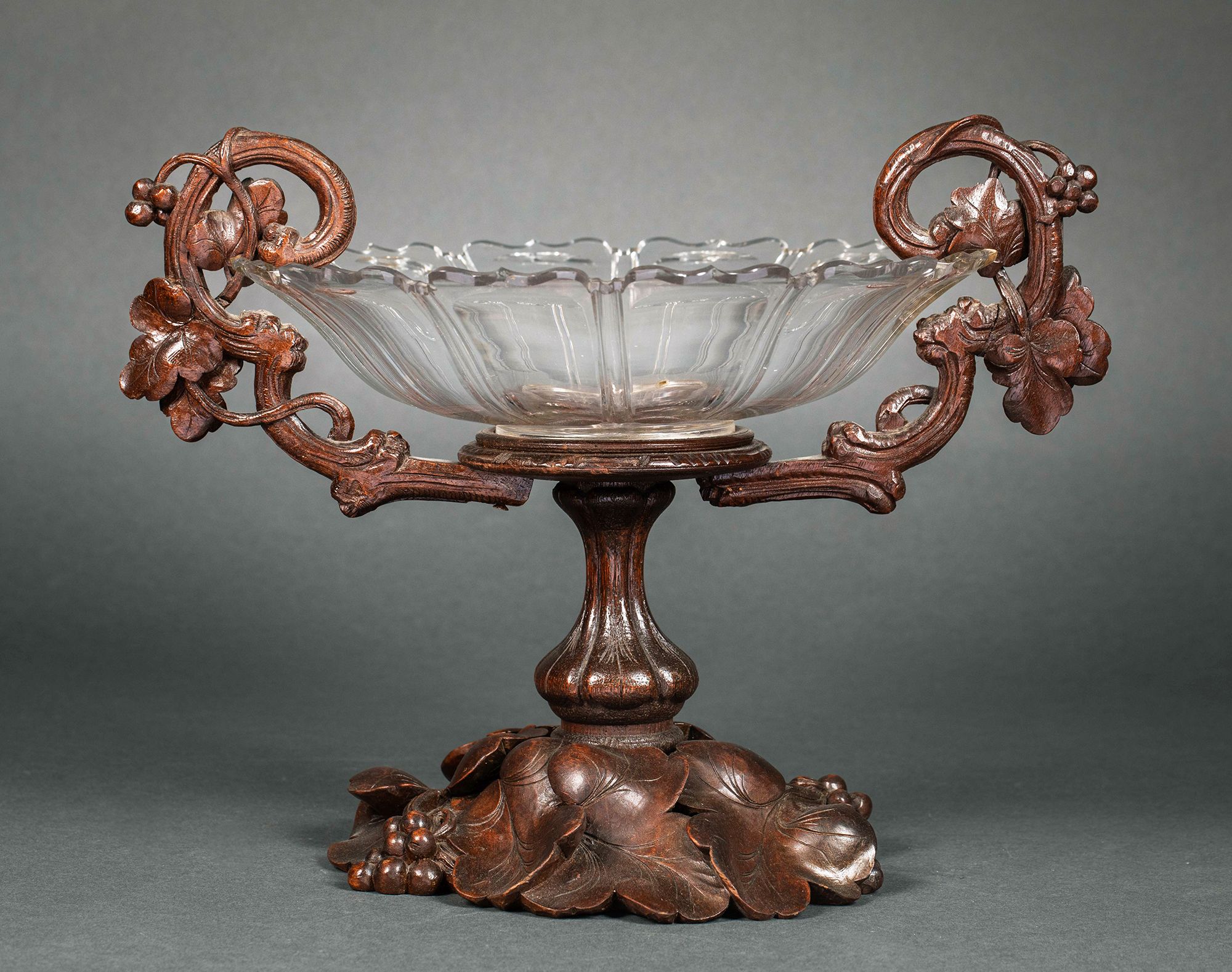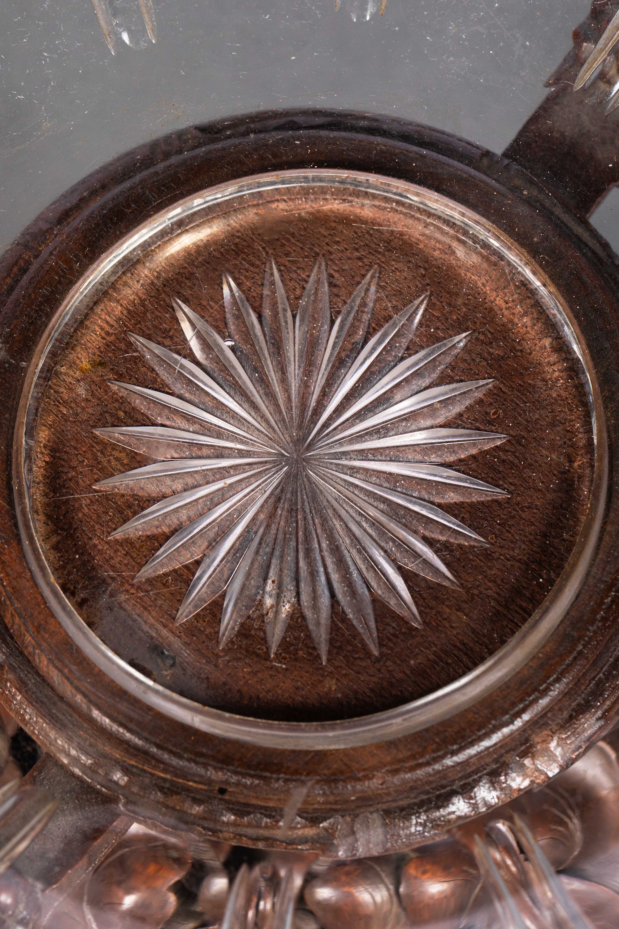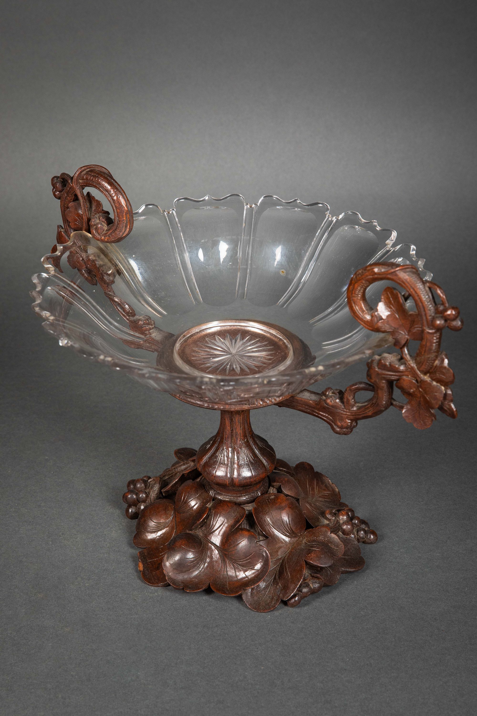 Decorated with vine leaves and bunches of grapes. A little shock on the crystal. Height 27 cm / L 35.5 cm. Base: 20 cm / 18 cm / cut diameter 27 cm.