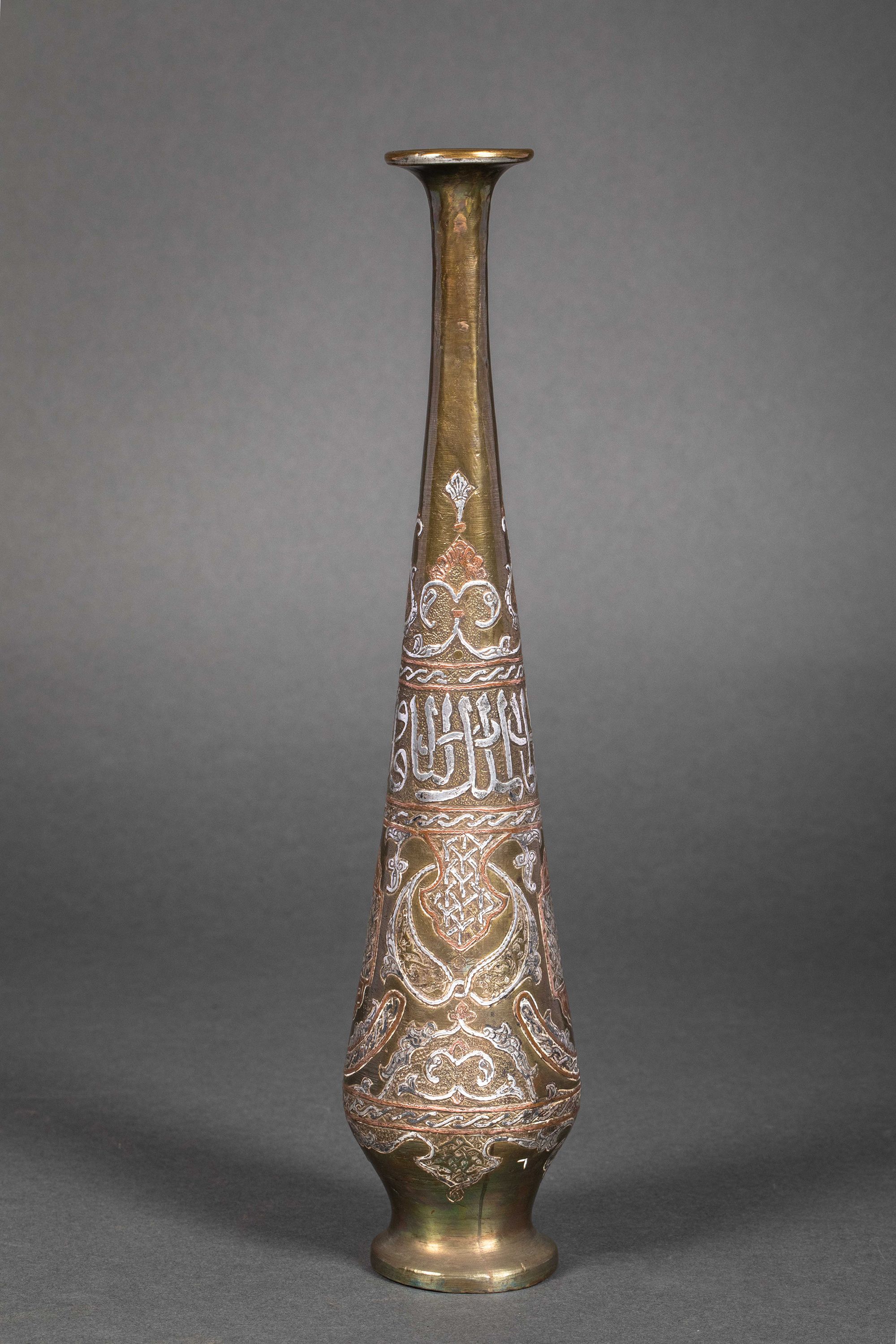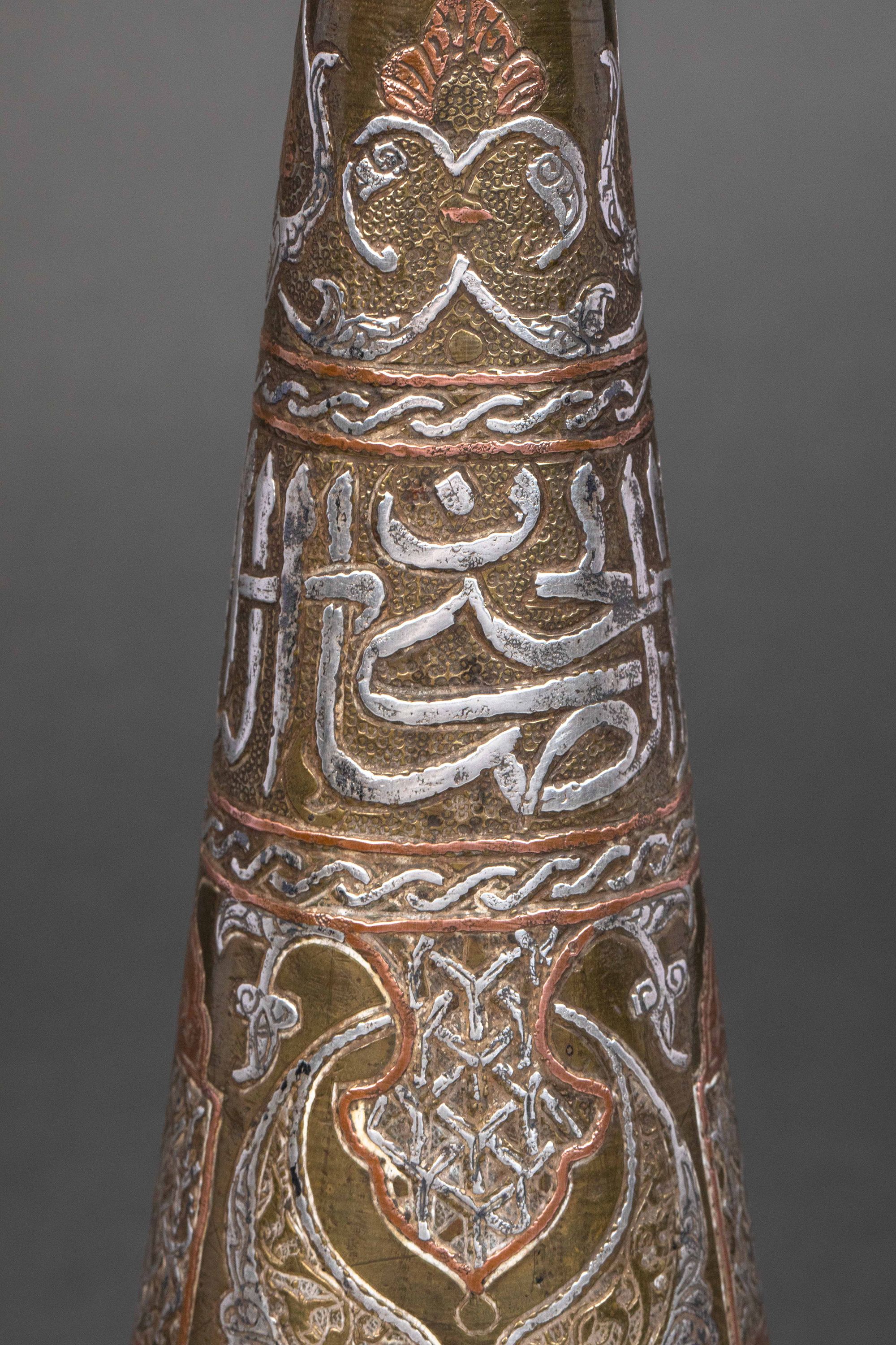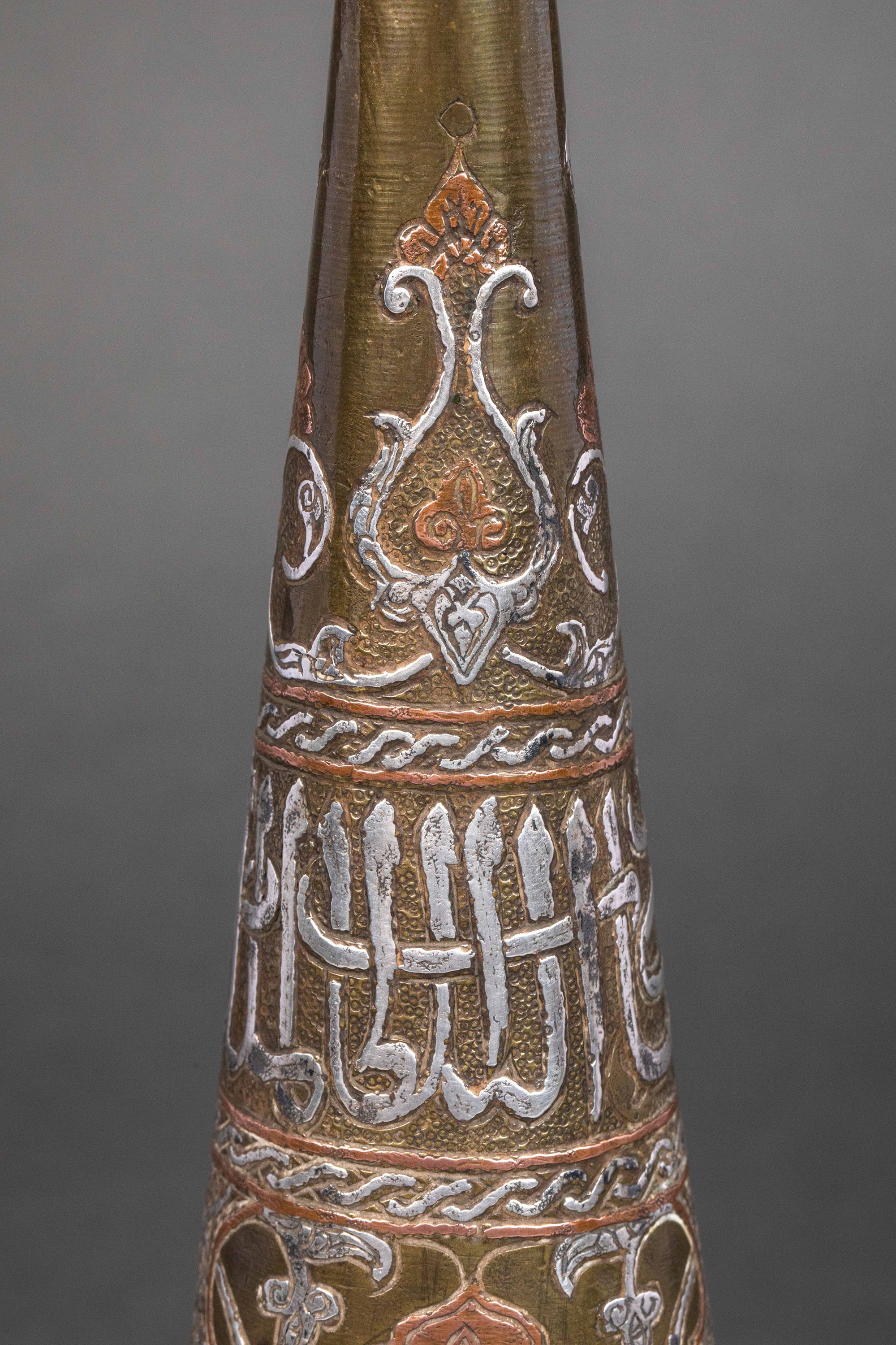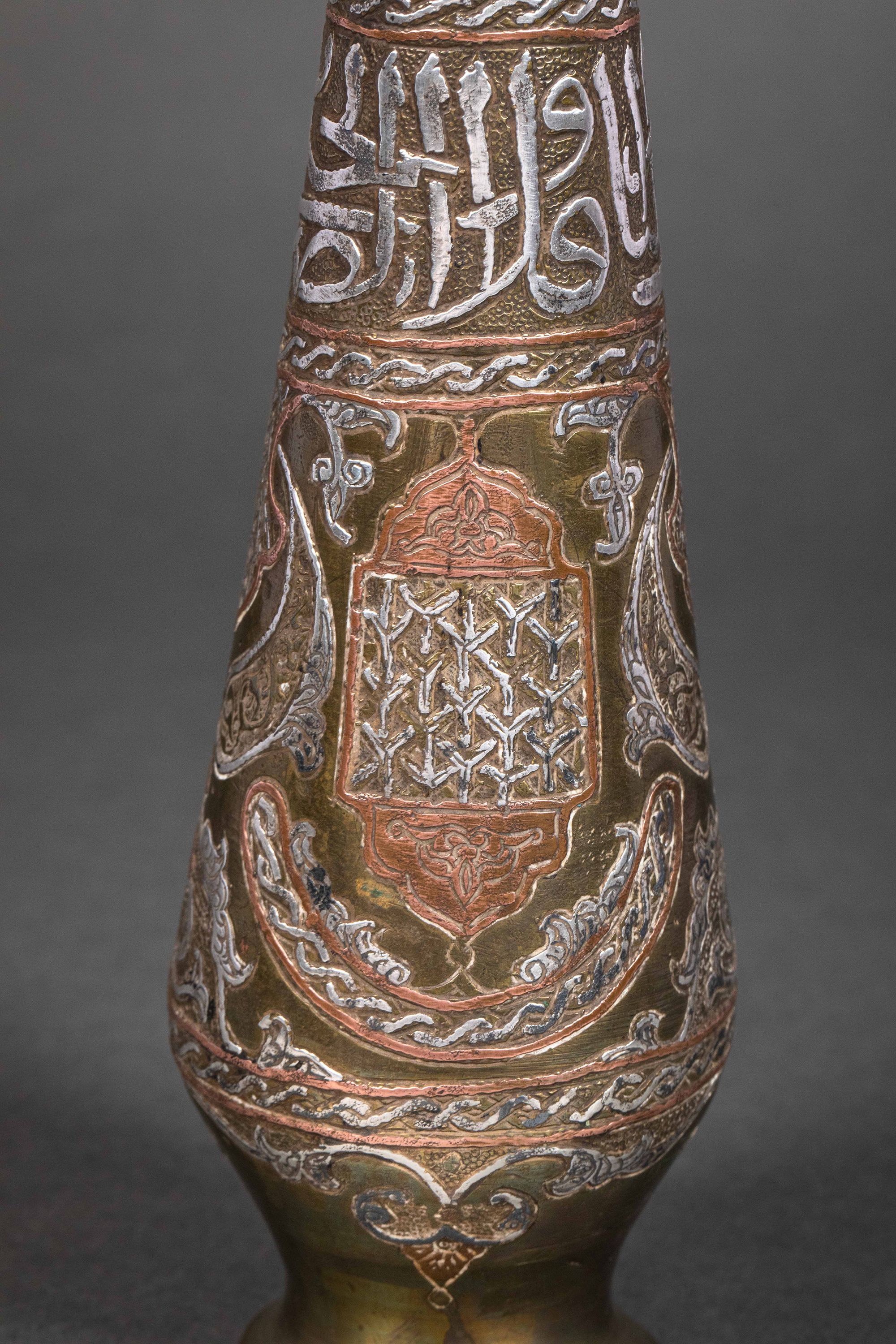 With silver and copper inlay and Arabic calligraphy. Height 30 cm. Diameter base:5 cm. Diameter height 4 cm.