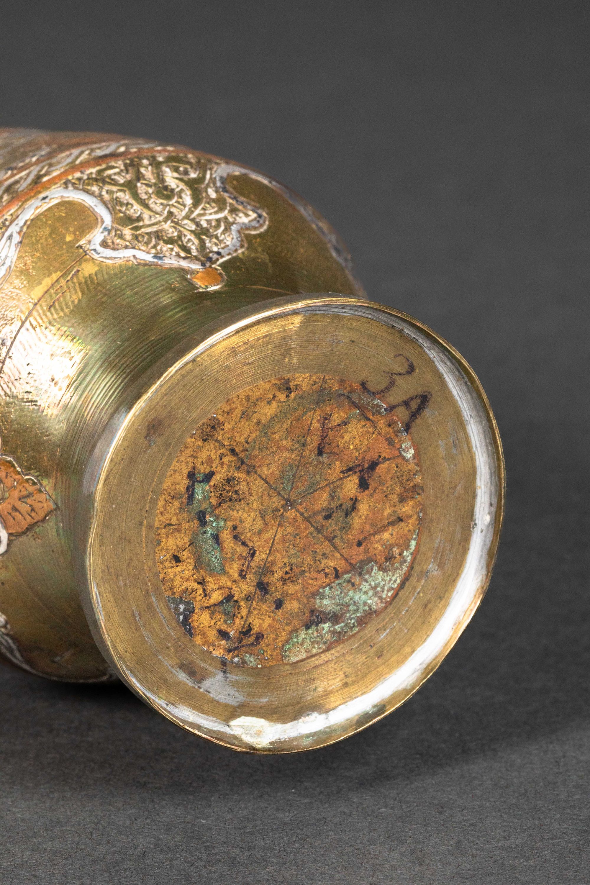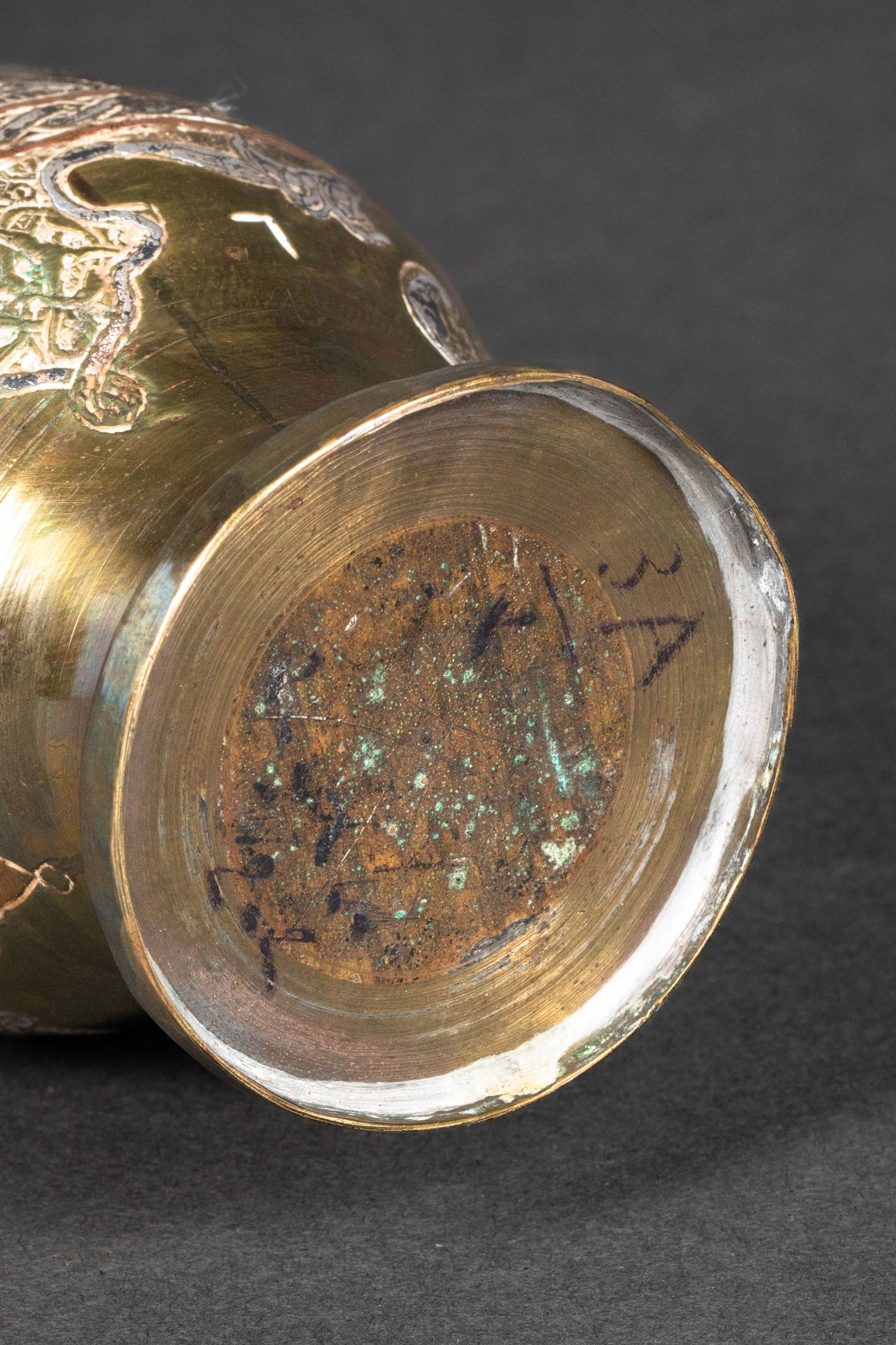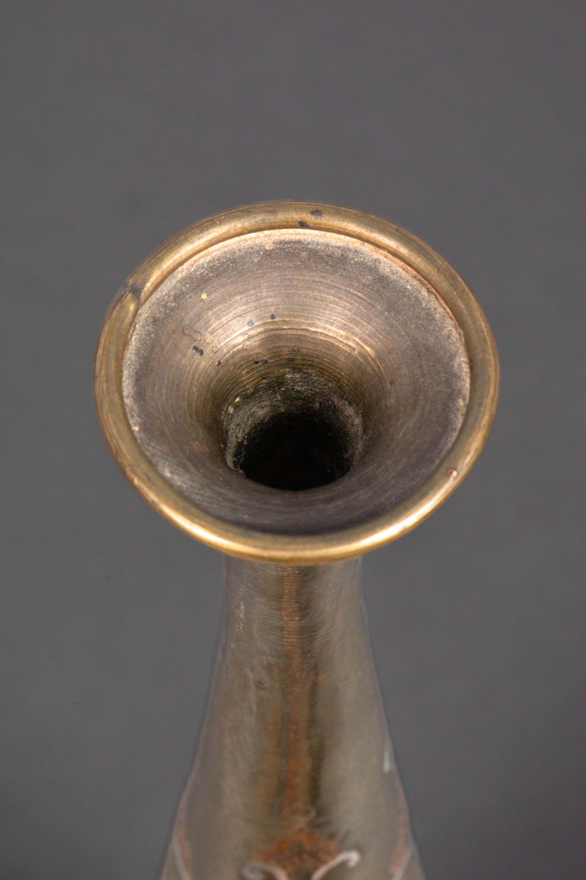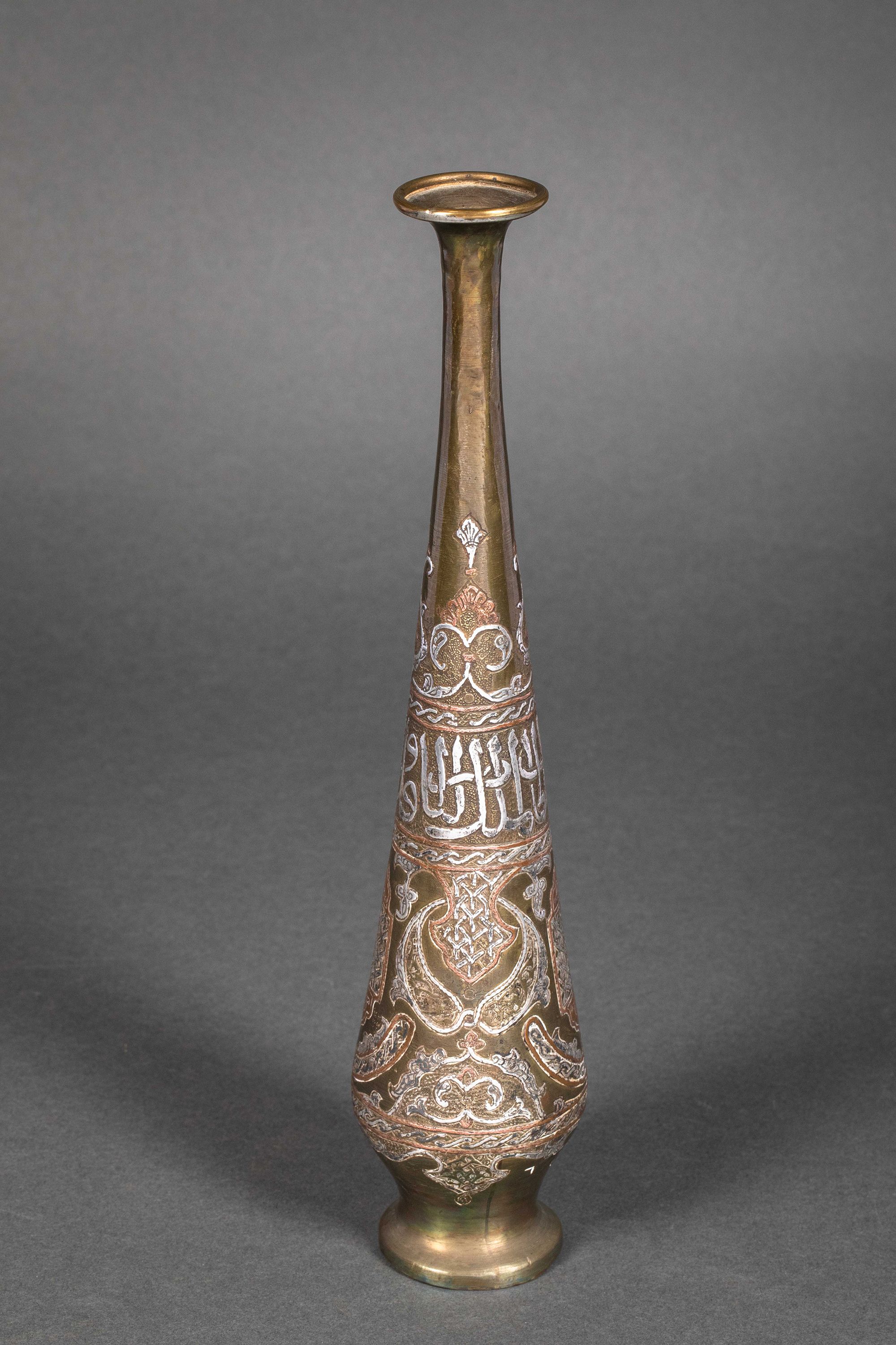 With silver and copper inlay and Arabic calligraphy. Height 30 cm. Diameter base:5 cm. Diameter height 4 cm.