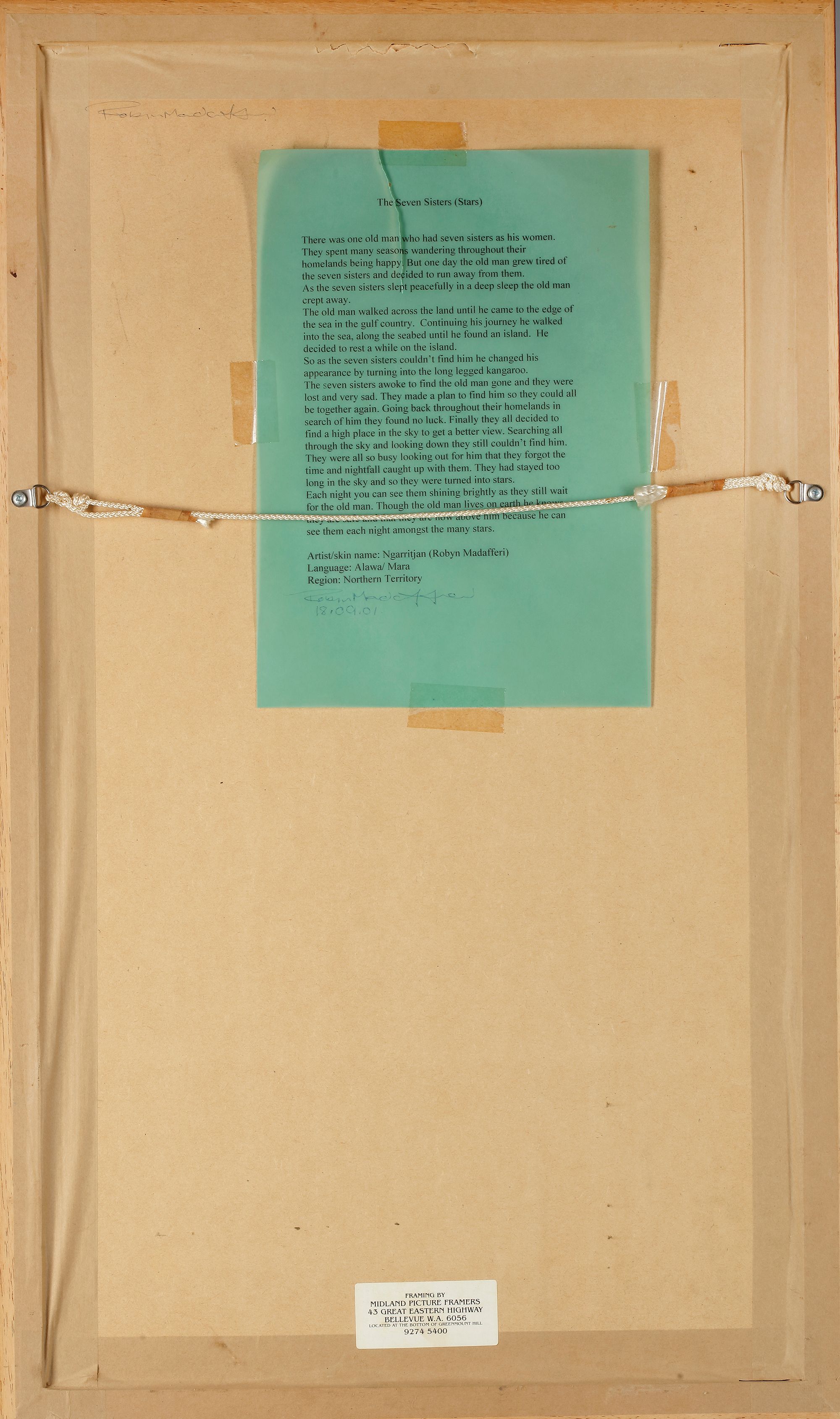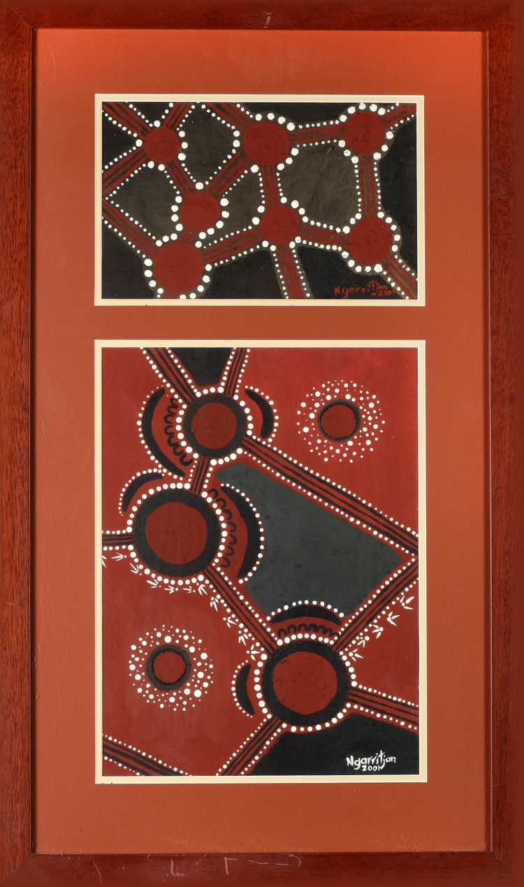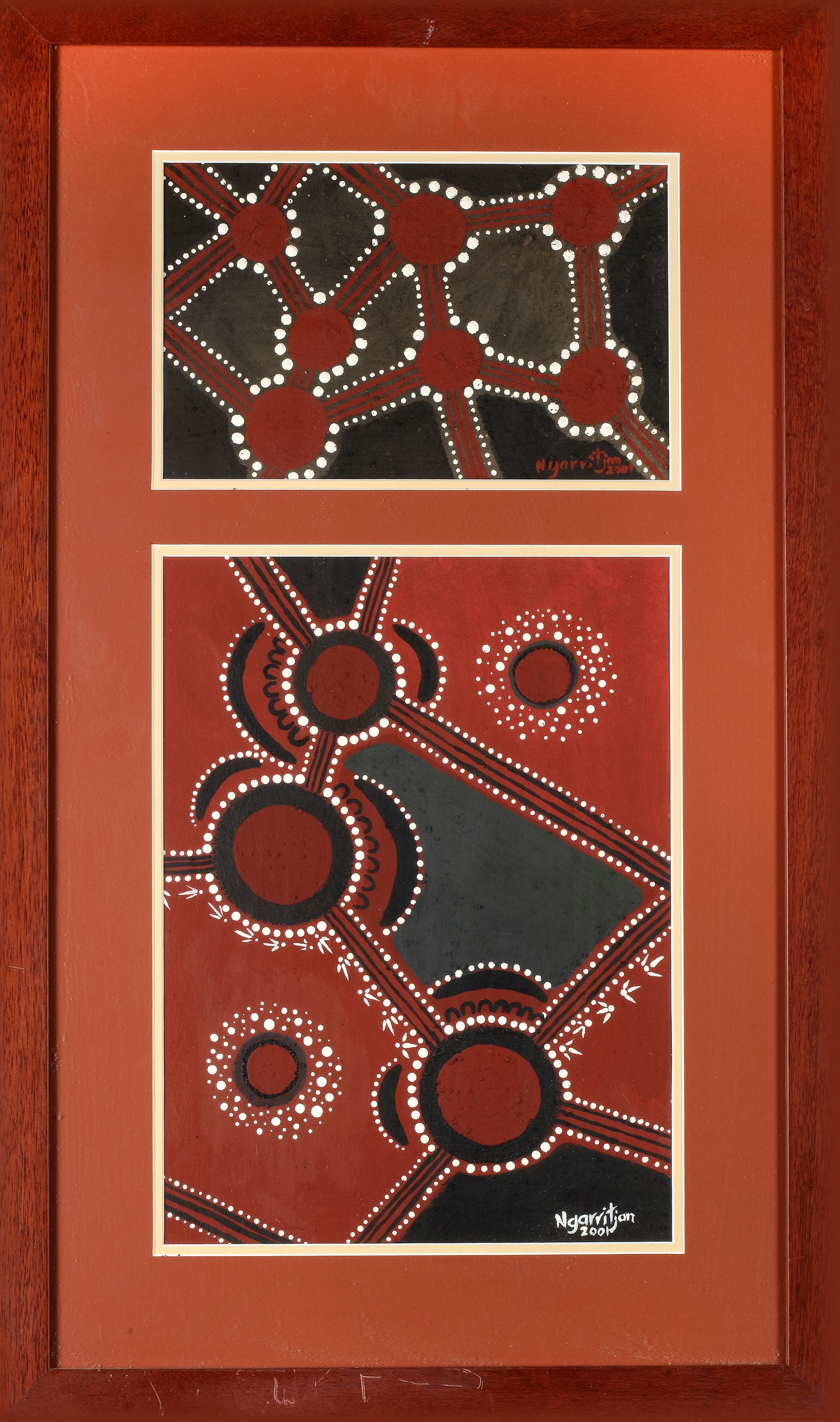 Two powerful works in traditional Aboriginal style, showcasing interconnected circles and radiating dot patterns in earthy reds, blacks, and whites. These geometric compositions symbolize community, journey, and gathering. Both signed Ngarutjan, dated 2000 and 2001.