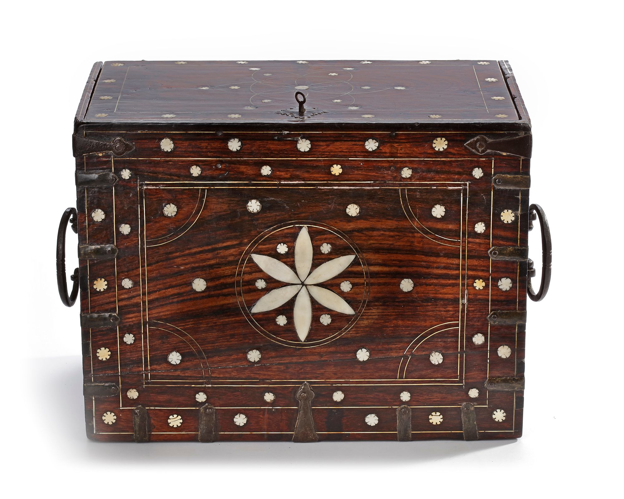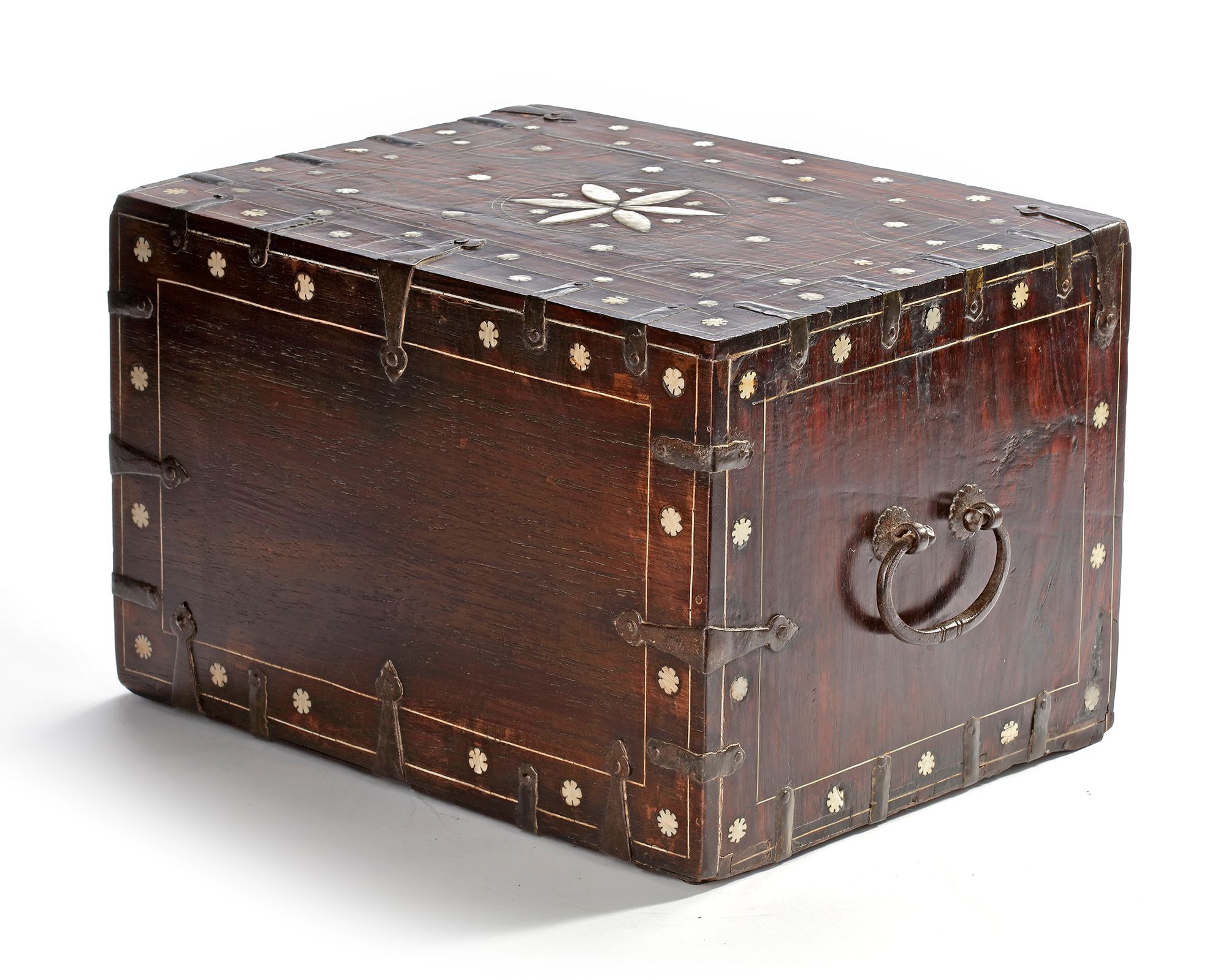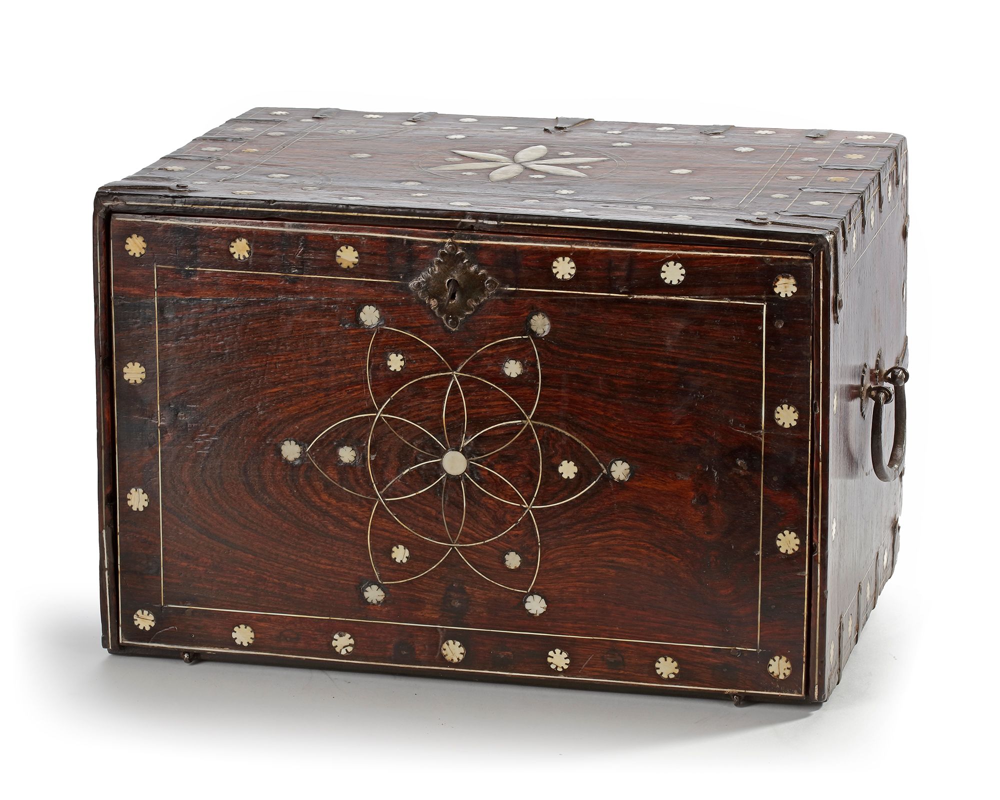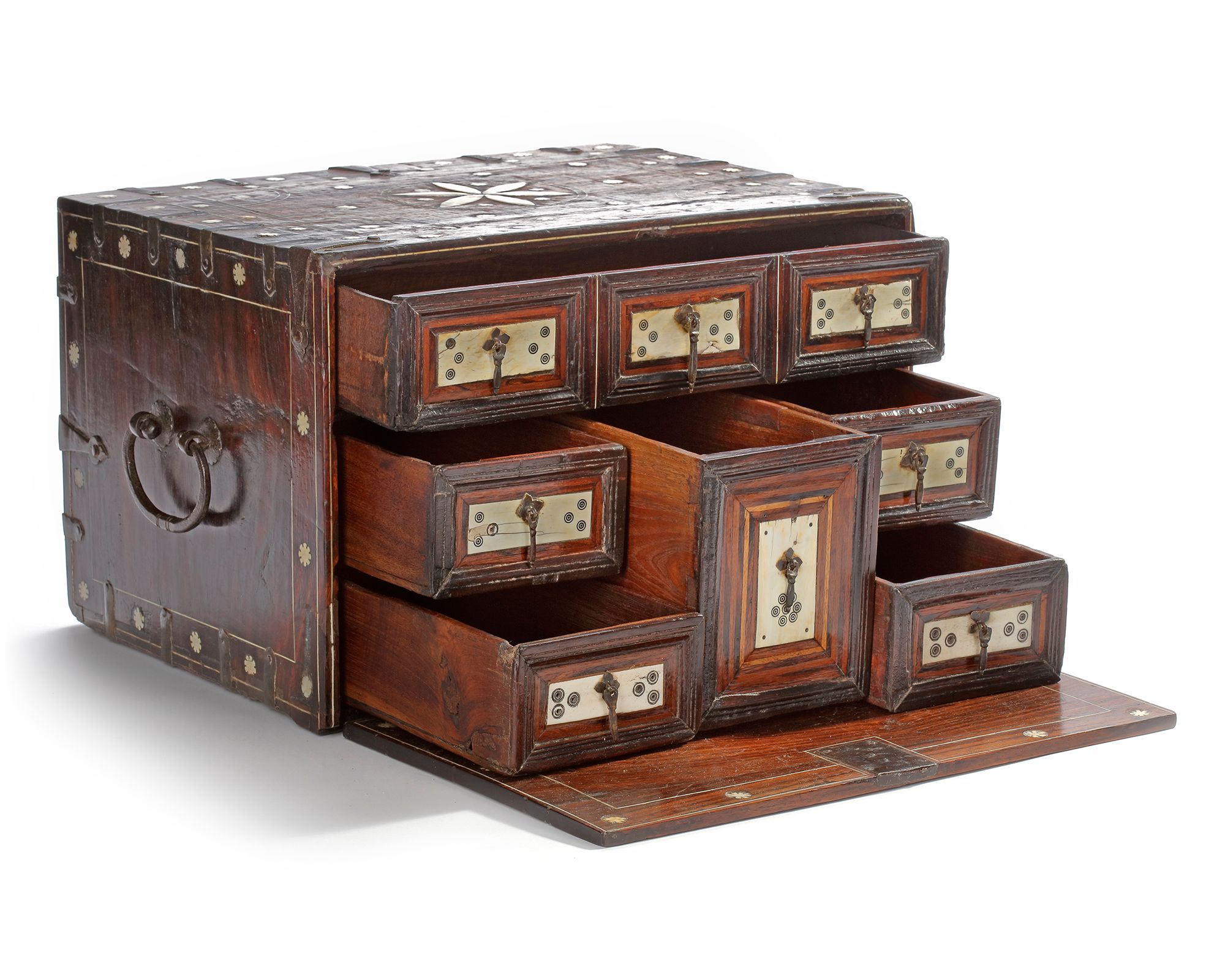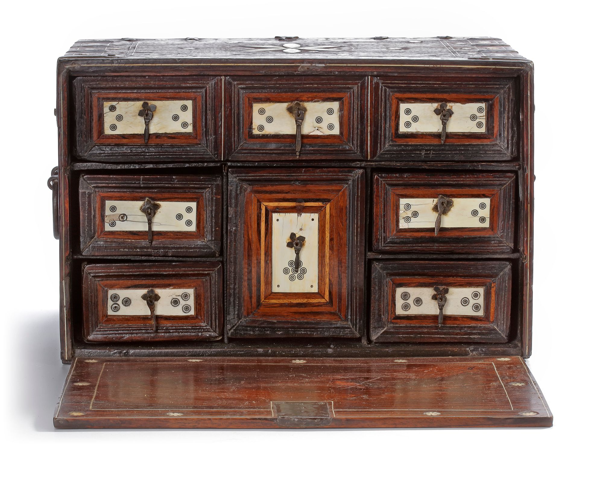 Rosewood and bone table cabinet from circa 1680, featuring a hinged front, eight drawers with brass knobs, and elegant geometric inlays. Beautiful patina, excellent condition with minor wear.