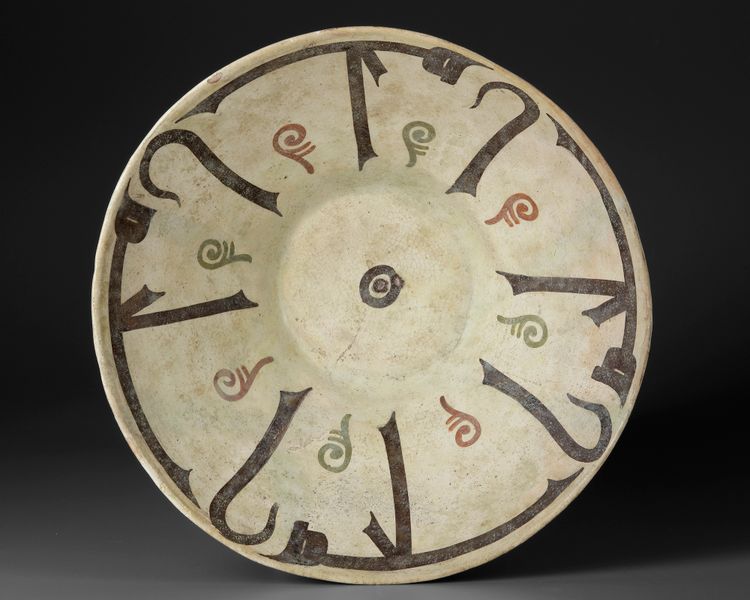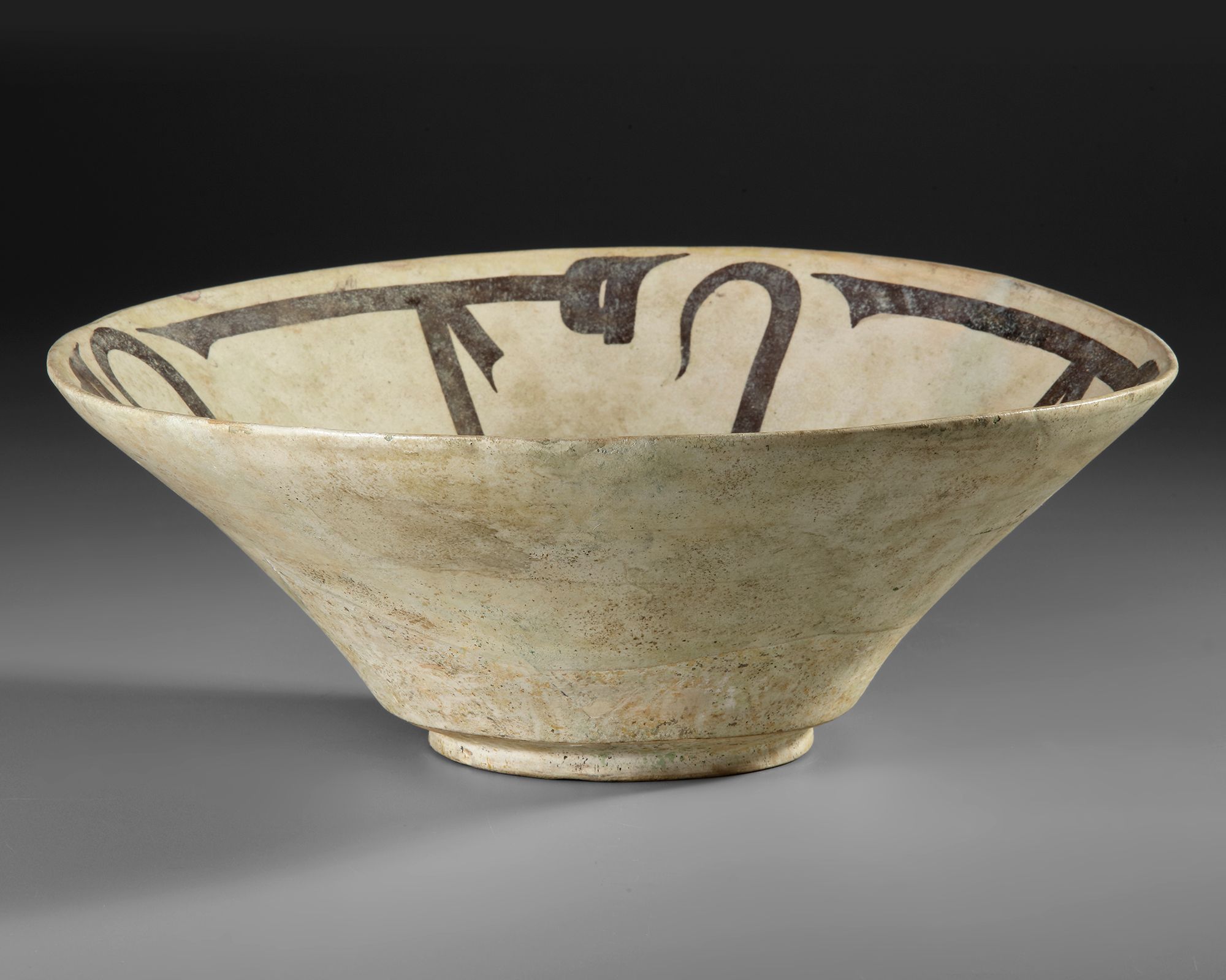 A bowl of truncated conical form with steep flaring walls set on a low, slightly everted foot. The interior is decorated in black with a radial band of Kufic script running below the rim, arranged in evenly spaced segments that radiate toward the center. At the center of the bowl is a single dot motif, serving as the focal point of the composition, with red and green maller spiral-like motifs.