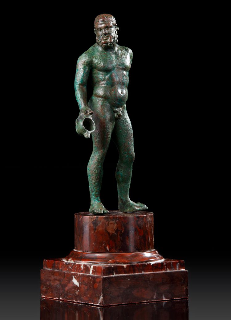 There are rare depictions of Herakles in which he holds a kantharos in addition to his usual attributes of which this an example. The composition of this exquisite statuette presents the apotheosis of Herakles: after his superhuman deeds, the hero was accepted to the eternal feast of the Olympians. He wears a fillet in the hair, a sign of divinization, and he holds a drinking cup in his right hand. Although the expression of weariness appears on his finely modeled face, his trained body is still in excellent shape. The exaggerated muscular forms and proportions are those of a professional mature athlete reminding us also of the famous Farnese Herakles statue from the Palazzo Farnese in Rome. In his left hand he would have held a club and held it upwards resting on or near his shoulder. Accompanied by an old red marble stand.