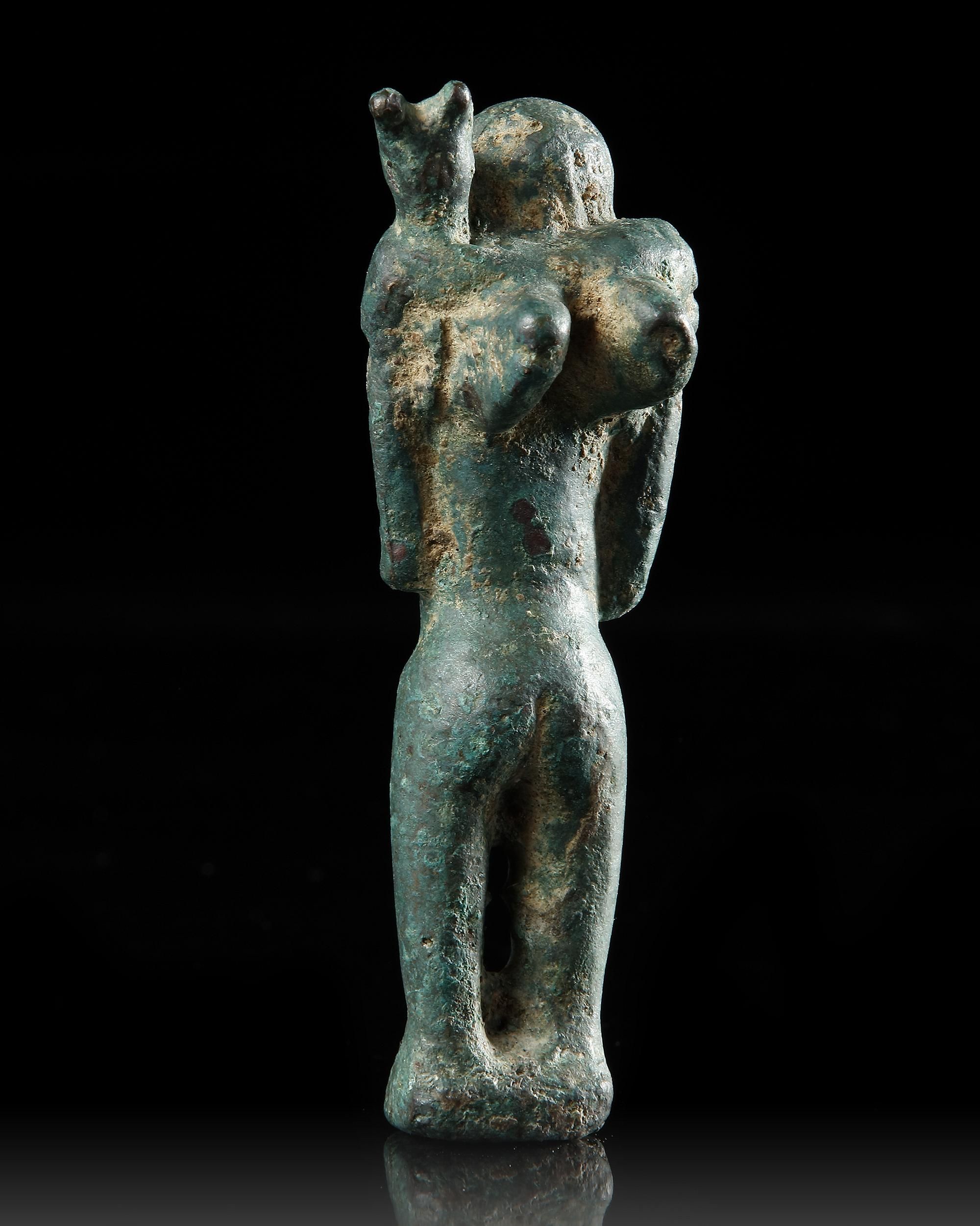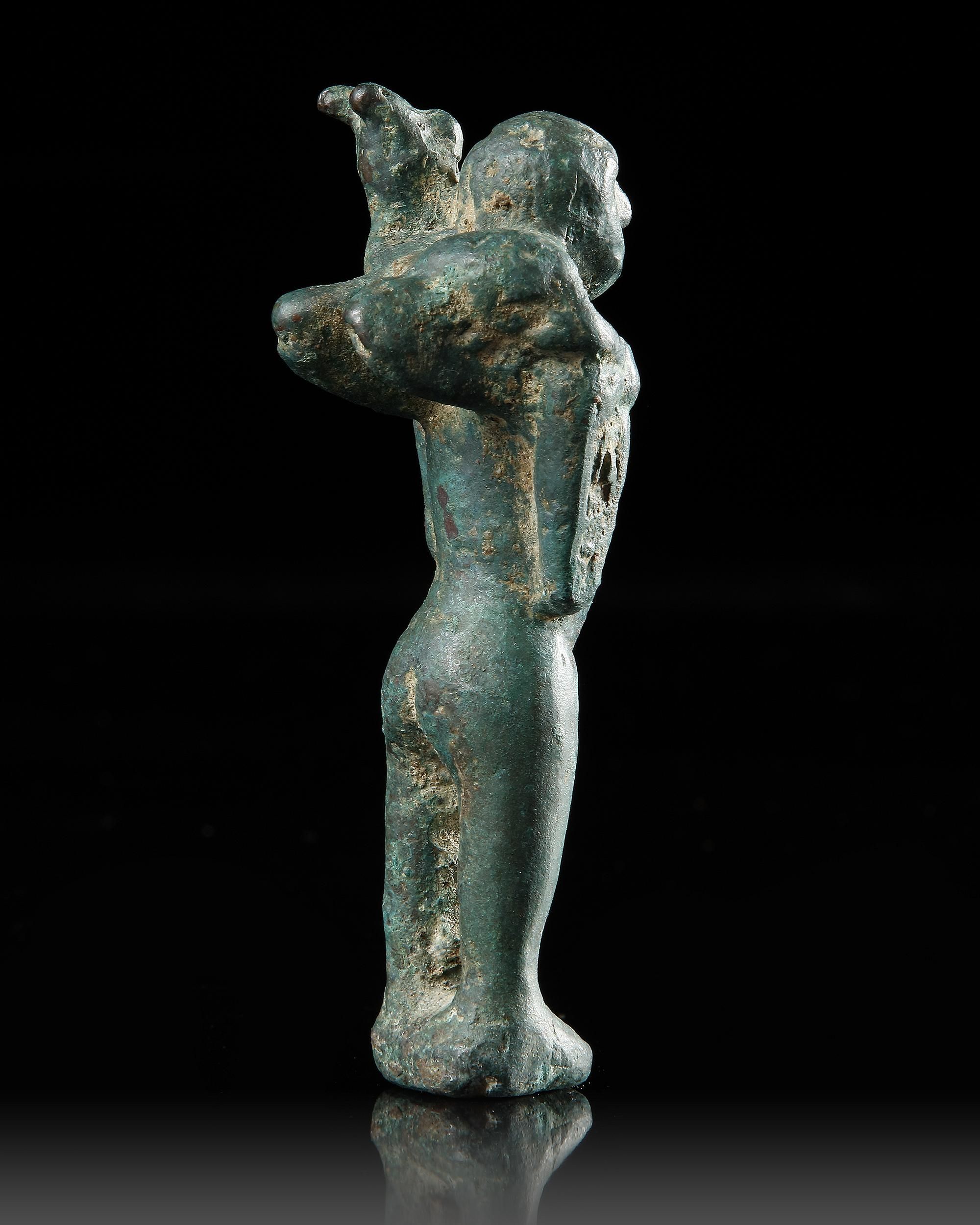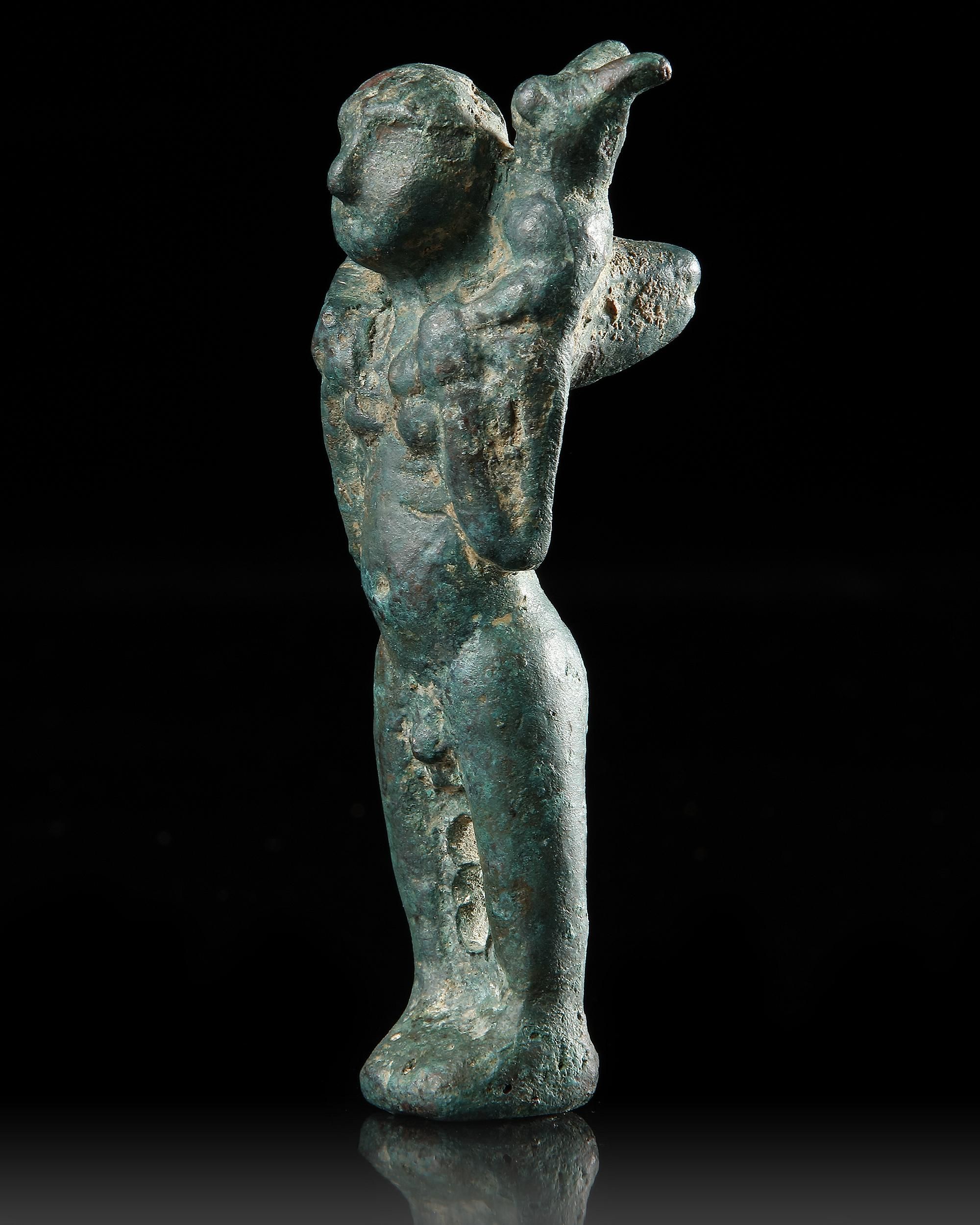 A bronze cast figure of a man carrying an animal. The stylised naked figure with eyes and oversized nose with a goat on his back, and holding the bent arms cradle an animal for sacrificing(?).