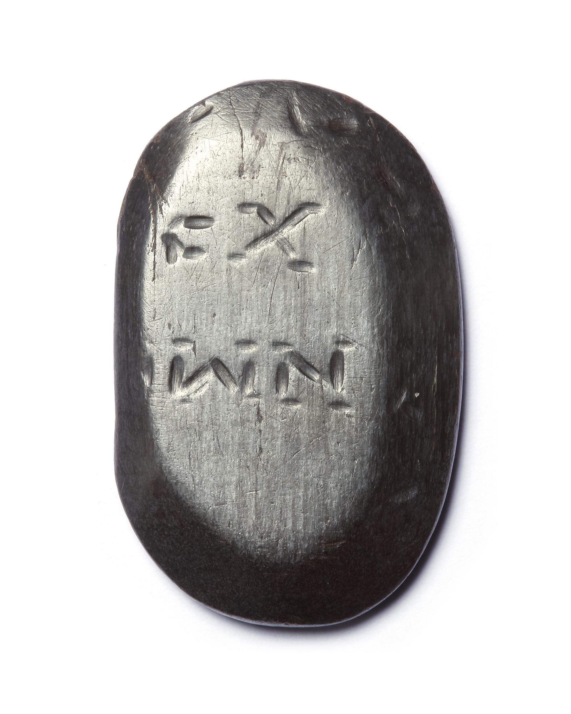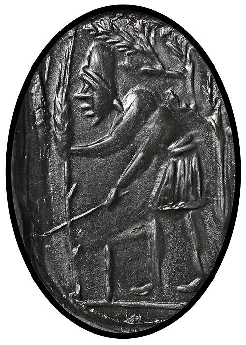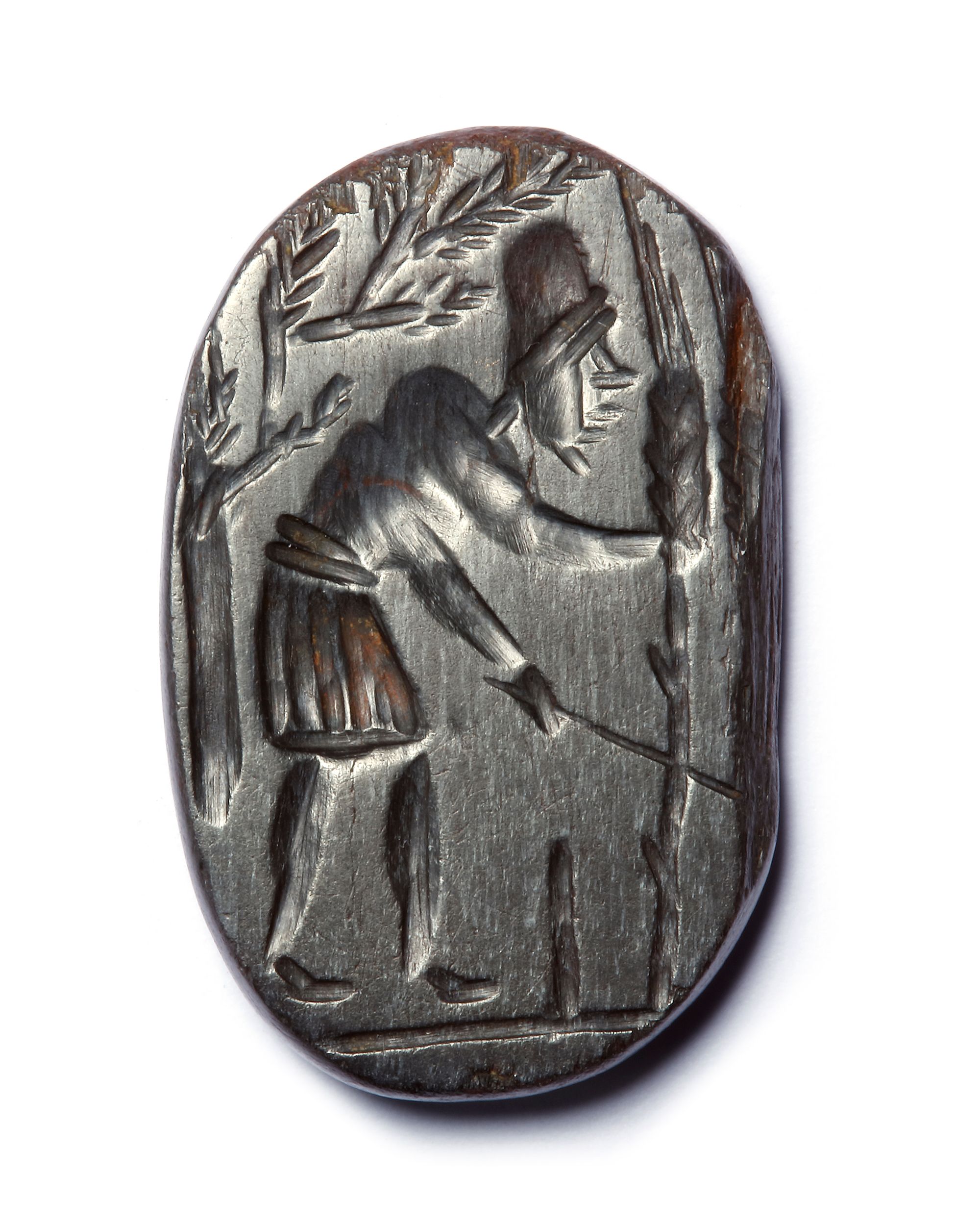 A hematite gnostic intaglio with the figure of a reaper stooping to cut two tall stalks of corn with a sickle, one already cut with a short stump remaining.