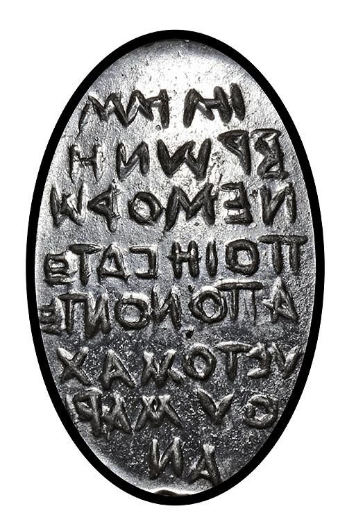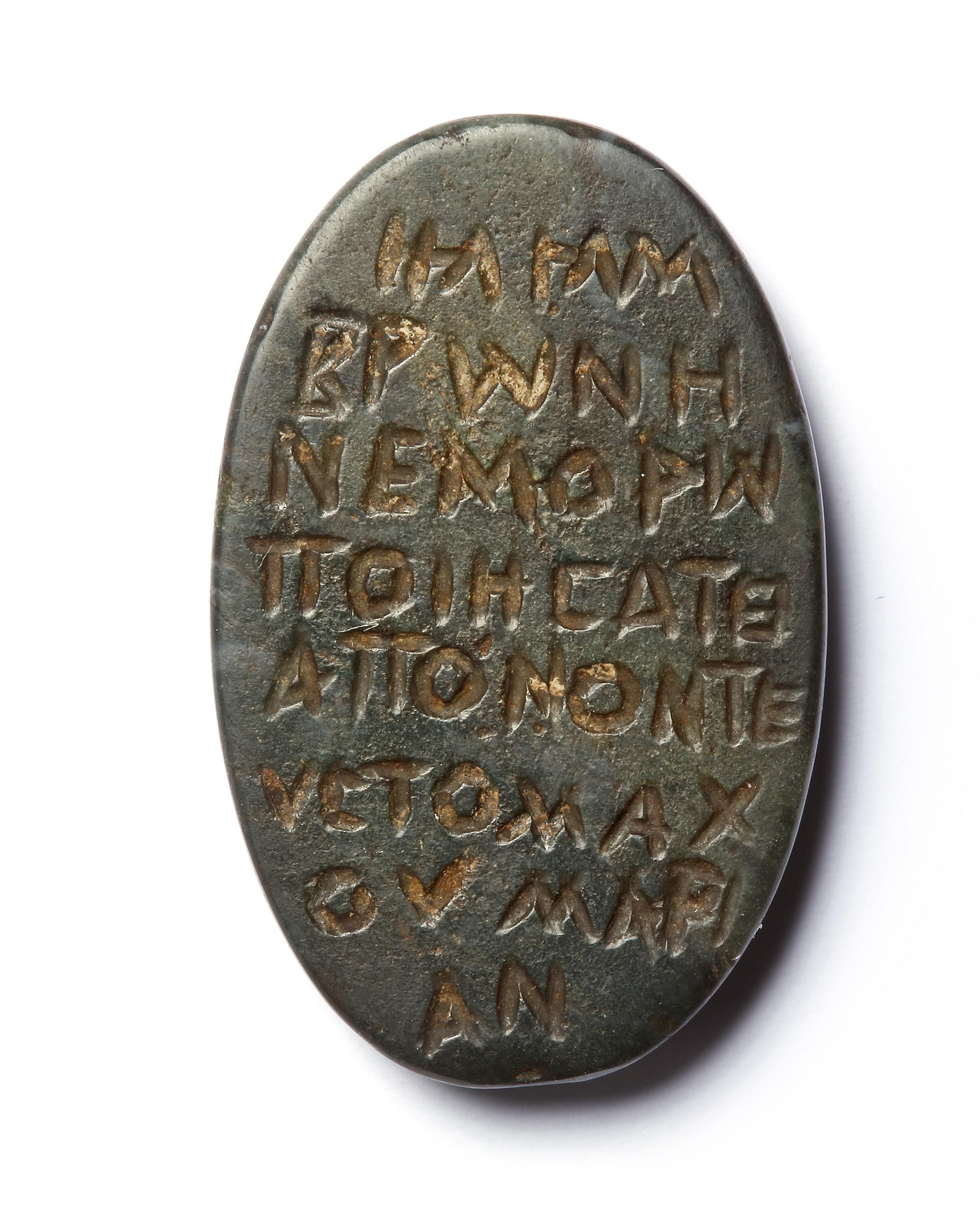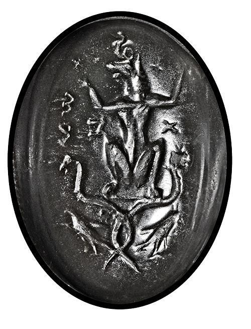 A Roman green mottled jasper cabochon intaglio with squatting Anubis on two entwined snakes with two falcons on each sides. Reverse eight lines magical inscription in Greek.