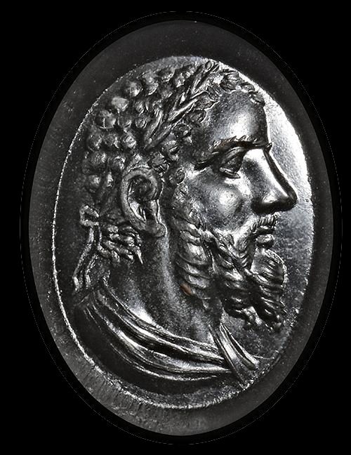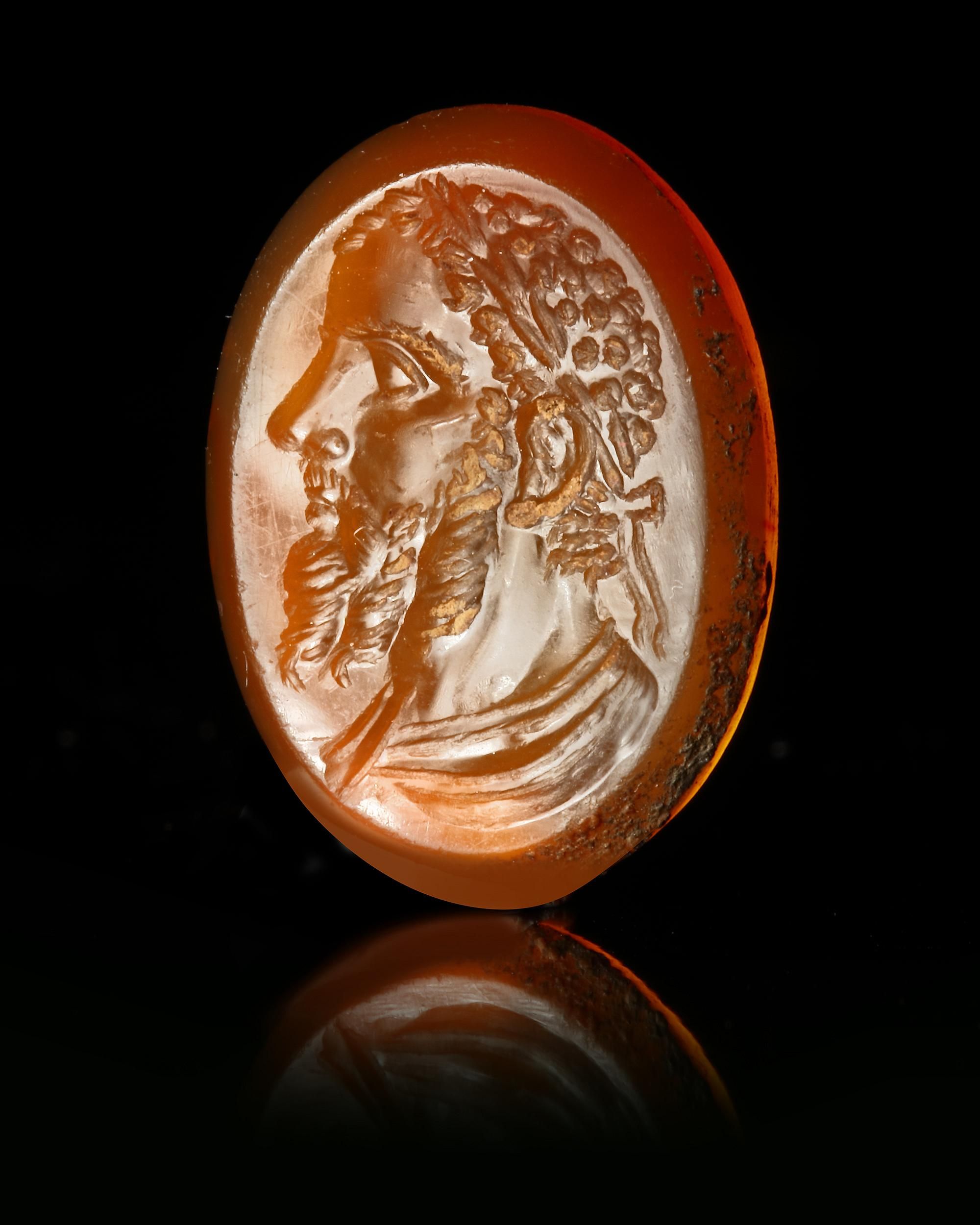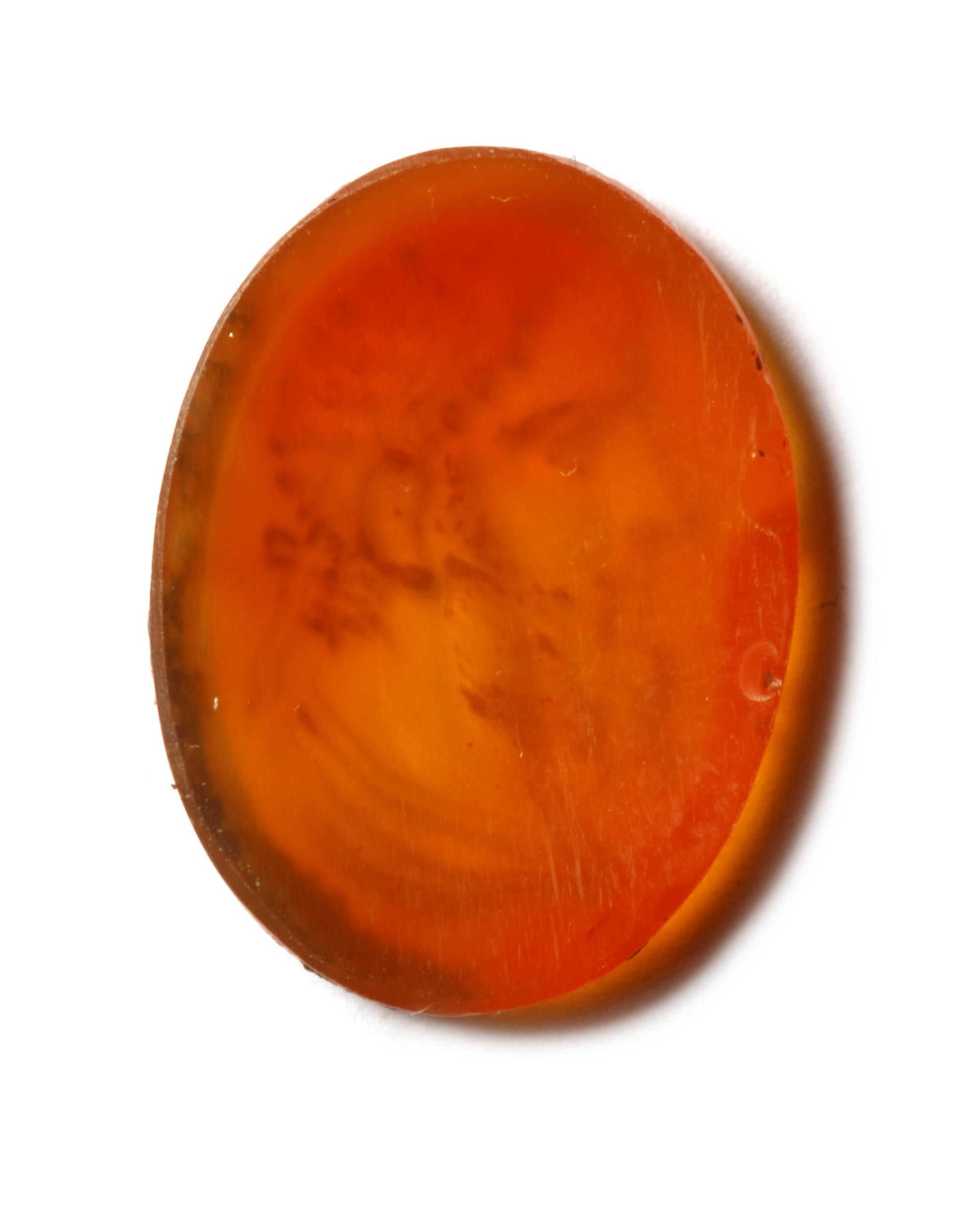 A roman carnelian oval shape intaglio with portrait of an emperor probably Septimius Severus(?) or Macrinus(?) and the reverse is convex. 17 by 12 mm.