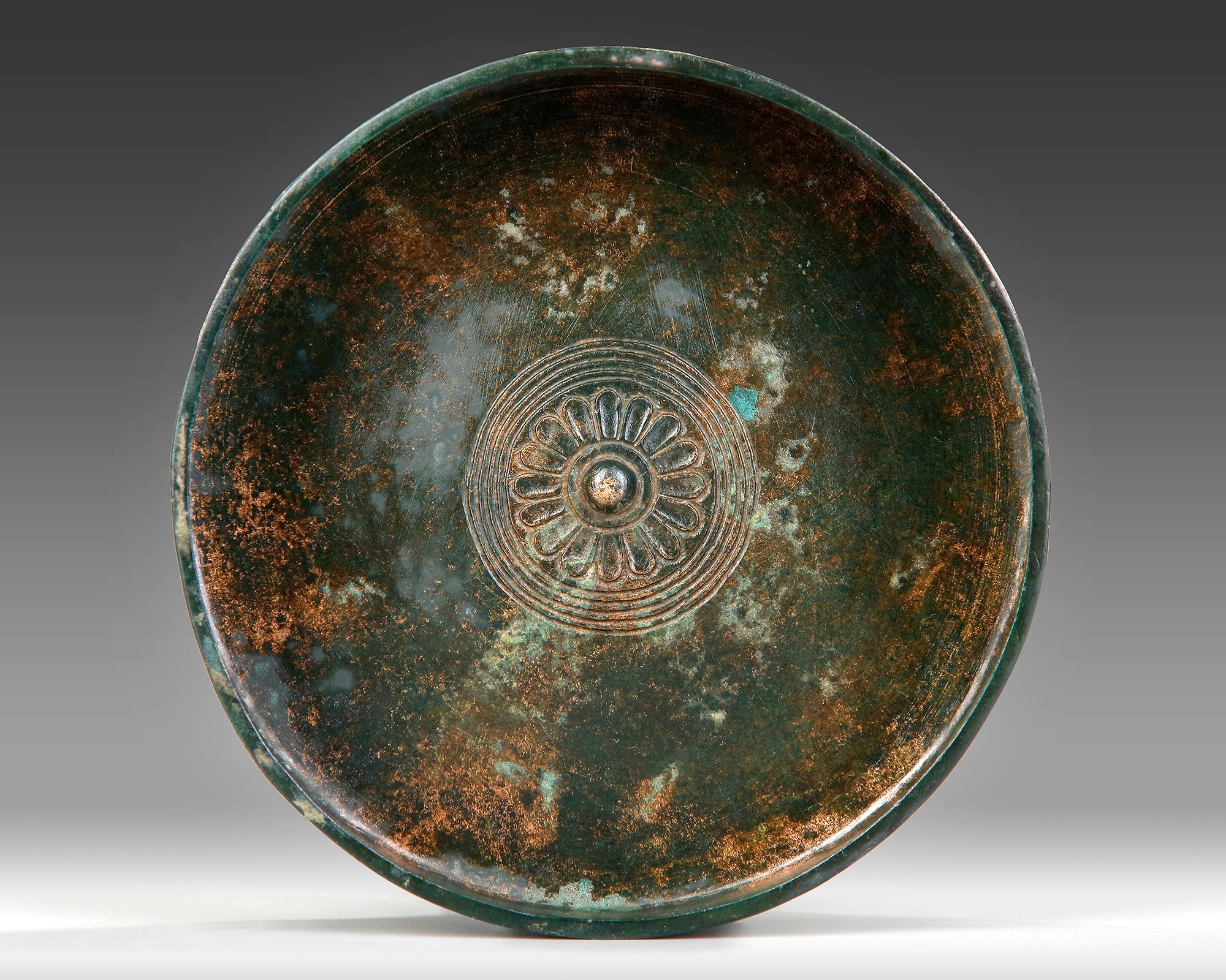 A cast bronze, decorated in relief with lotus pattern on the interior and incised round in the centre of the bowl. The thick-walled bowl with flat bottom.