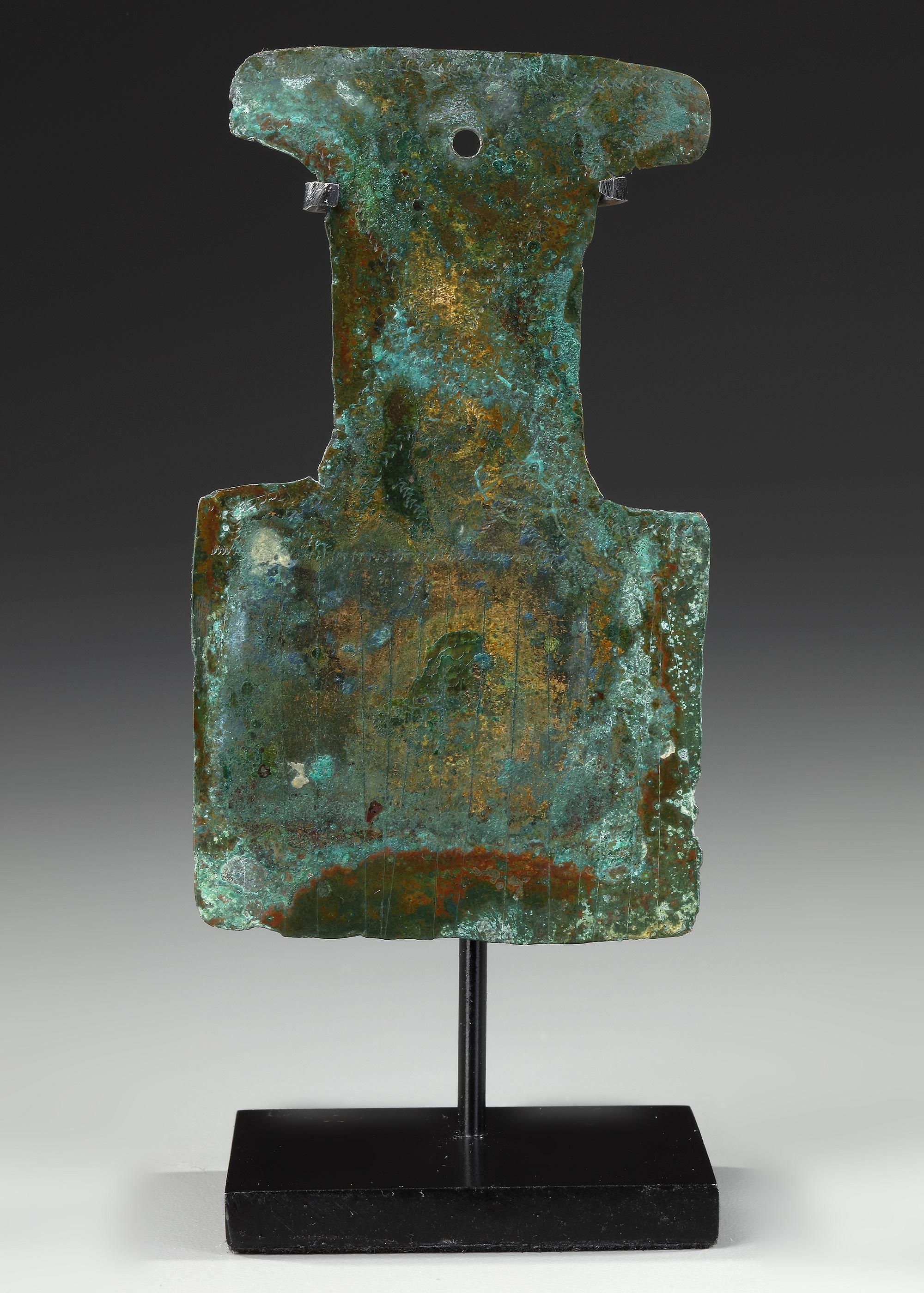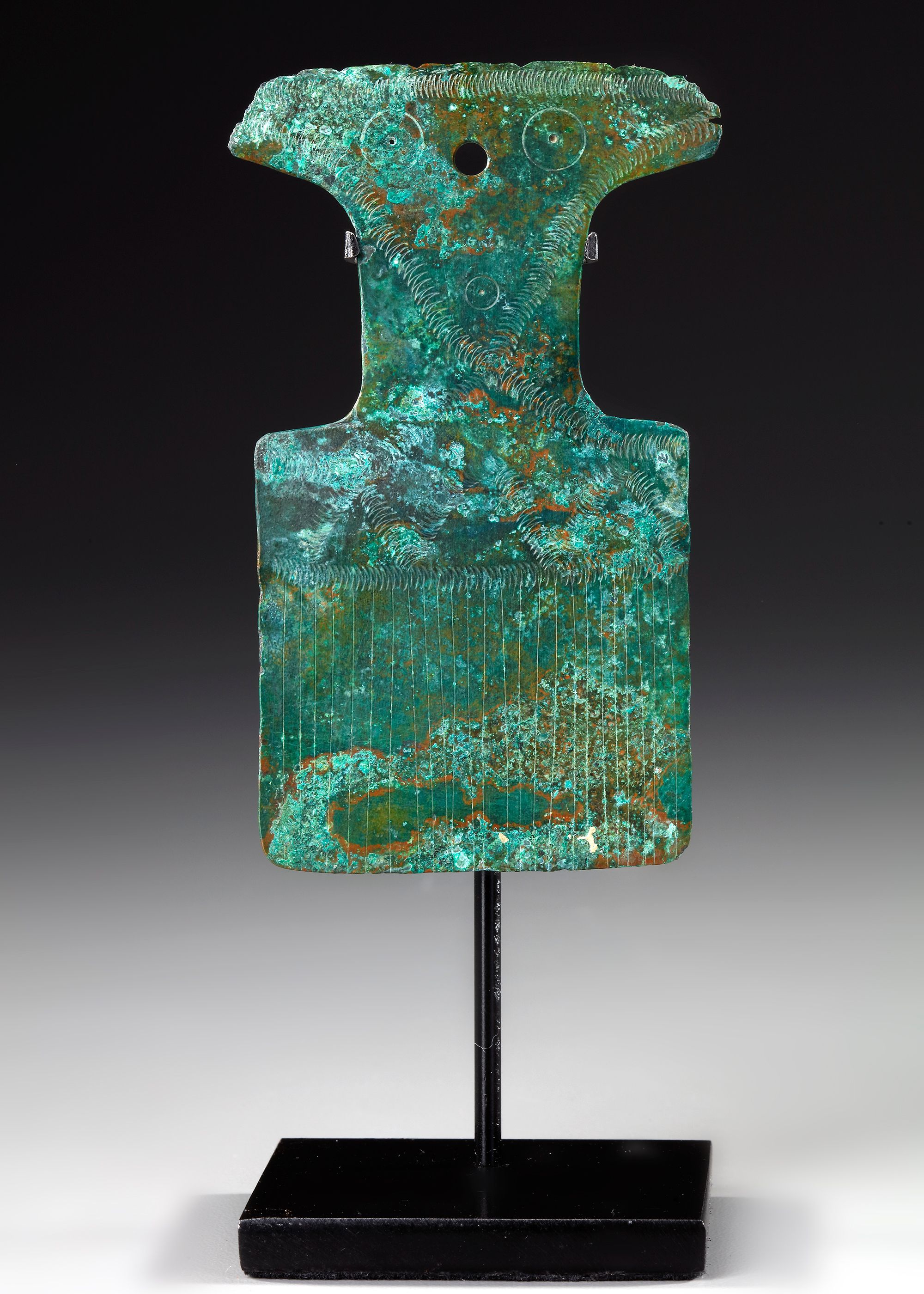 Flat, rectangular, plank shaped-body, female idol. Incised zig-zag lines in neck and head. Two impressed dots marking the eyes; round lines for the eyes; one hole piercing the nose, framed by vertical, parallel lines on lower body on both sides.