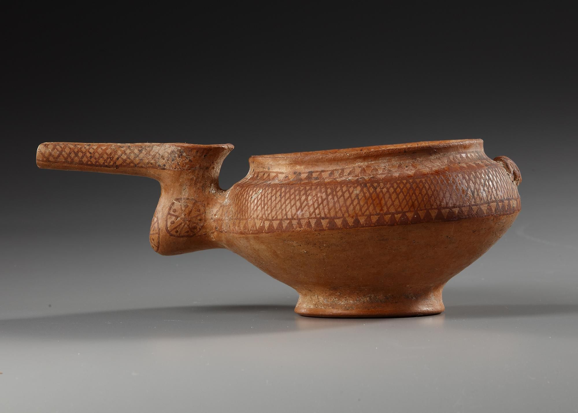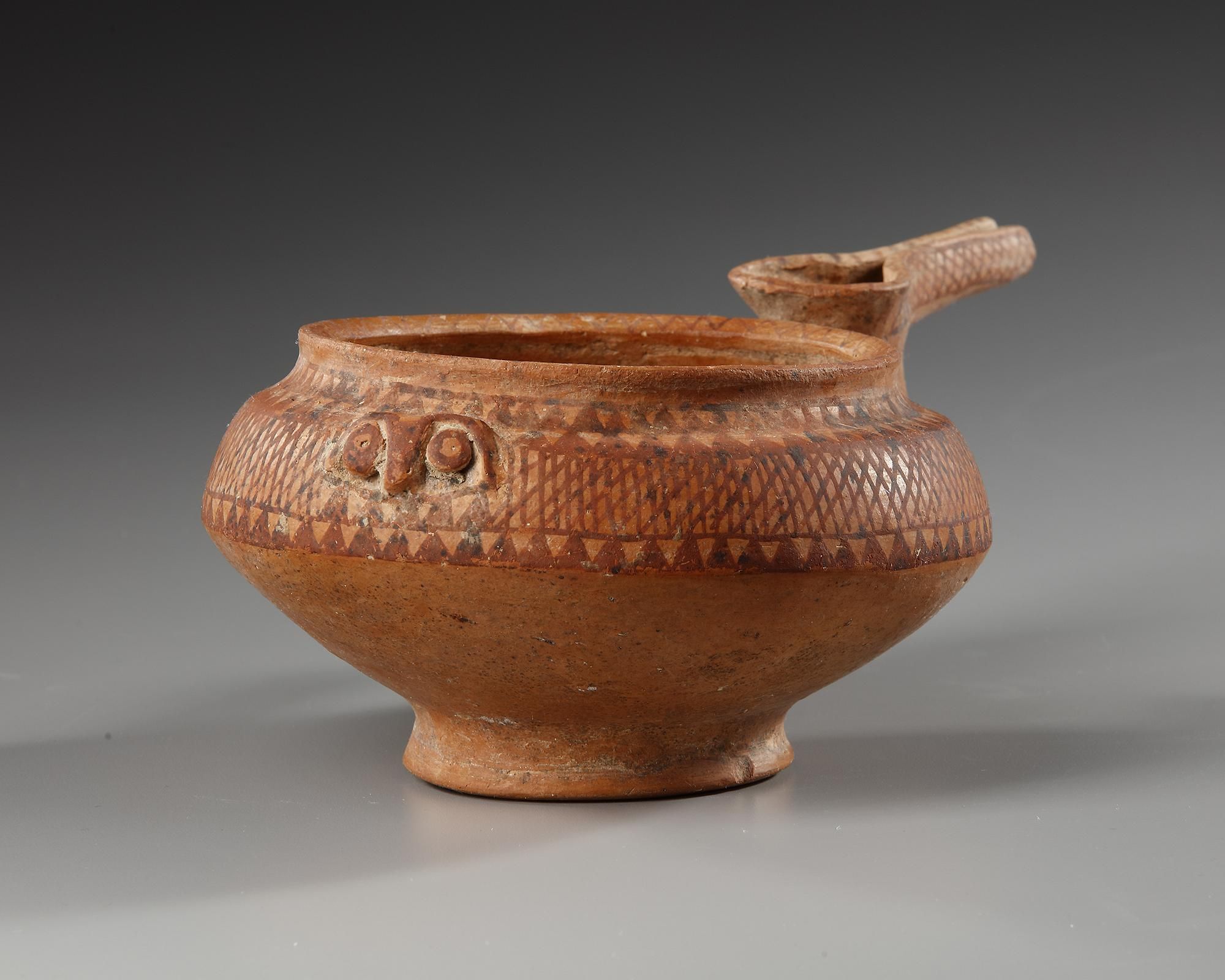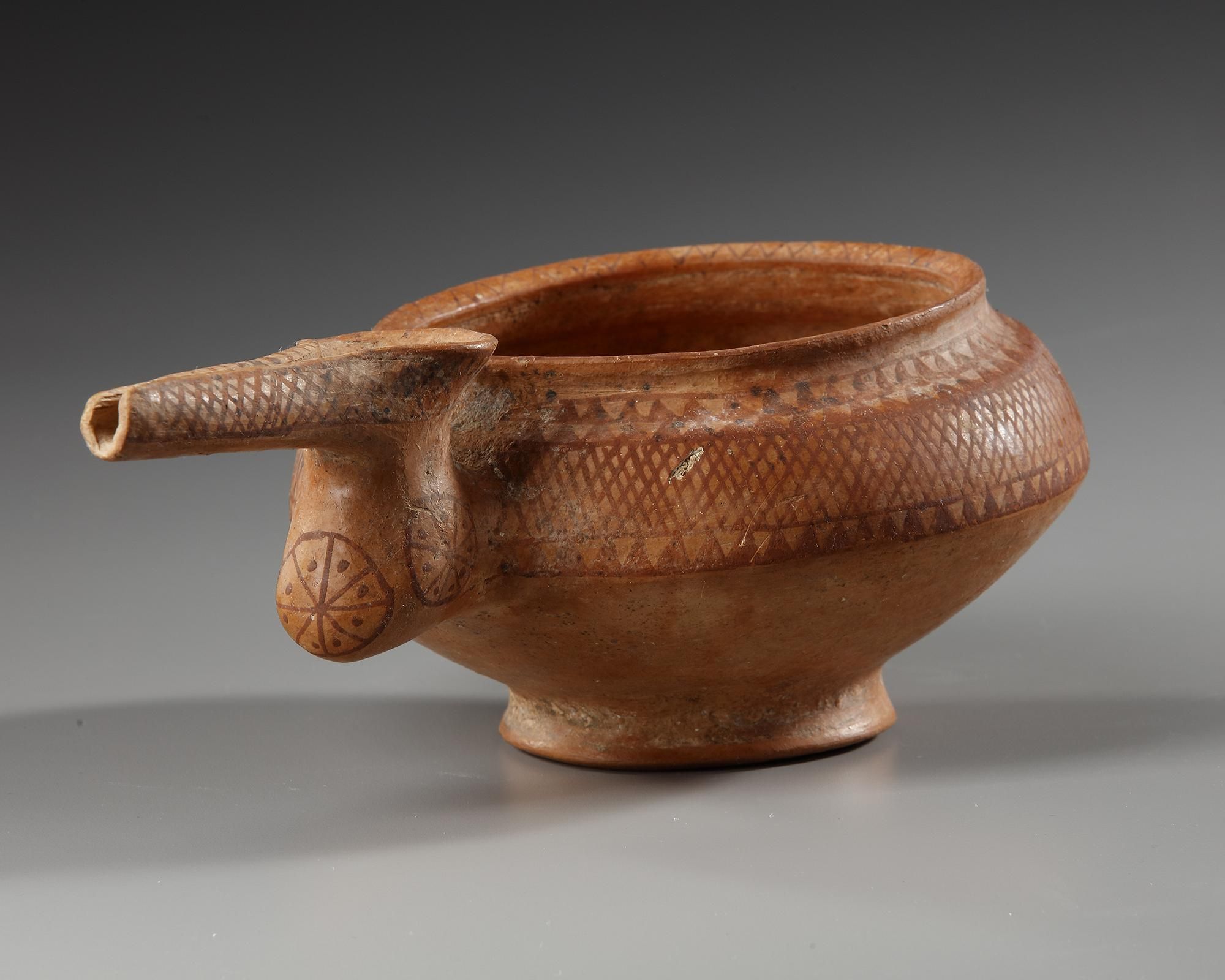 An Amlash terracotta vessel, having squat globular form and raised on circular foot, and inverted flared rim, beak spout attached to one side and raised double scroll design to opposite side. Upper body painted with geometric design within serrated borders and beak with a circle divided into triangles each with a central dot, 'beak' with criss cross border.