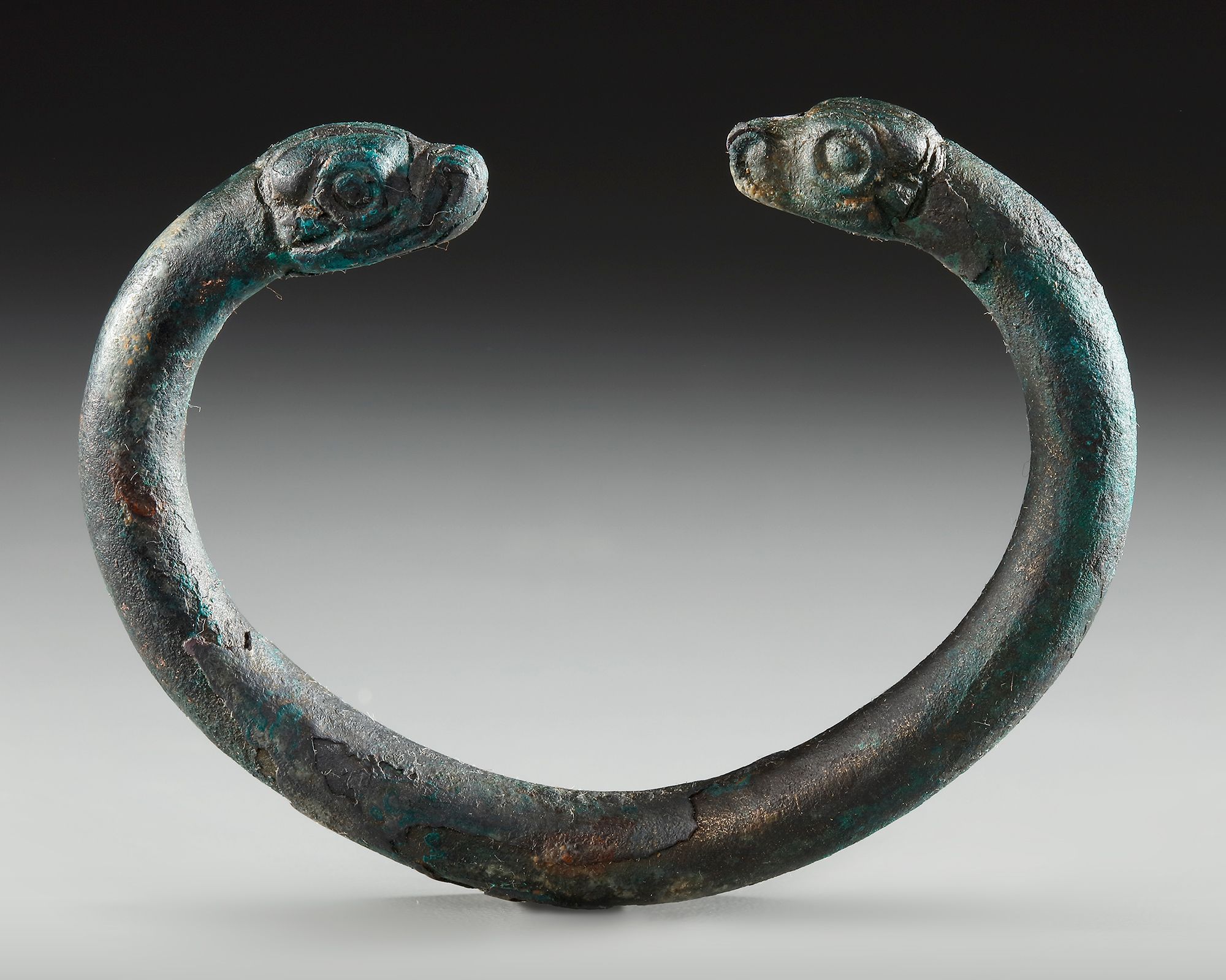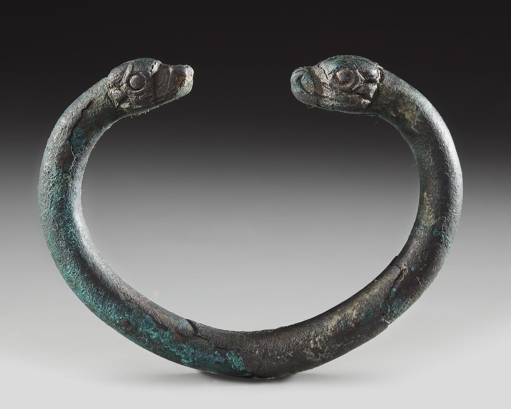 Bronze cast round-section penannular design with opposed dragon(?)-headed terminals bracelet. each head with stylised features, large pellet eyes and tendril nostrils.