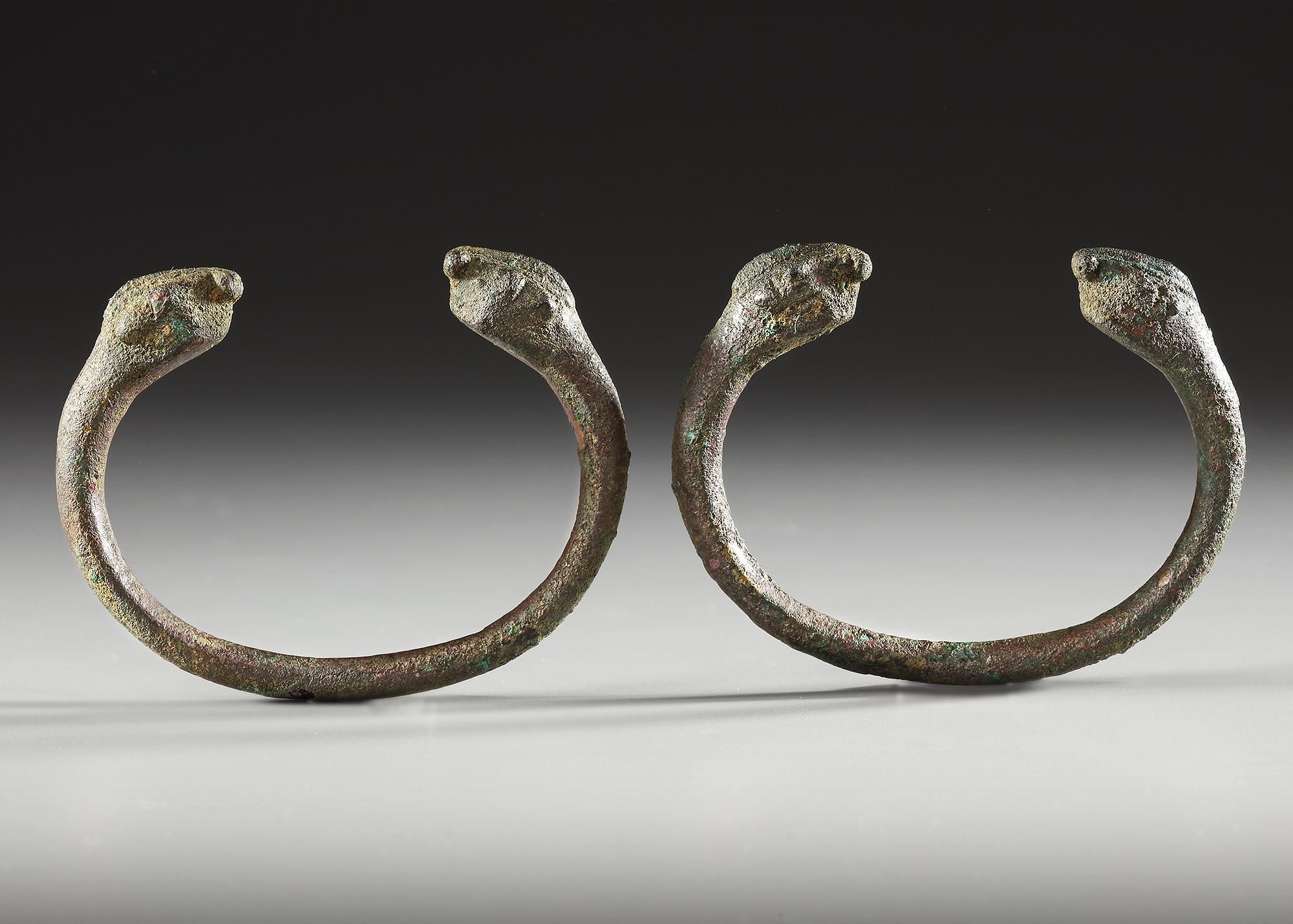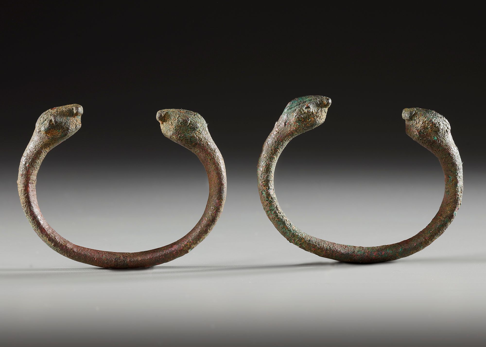 A pair of Urartian bracelet made from bronze round-section, each with penannular design and opposed zoomorphic terminals.