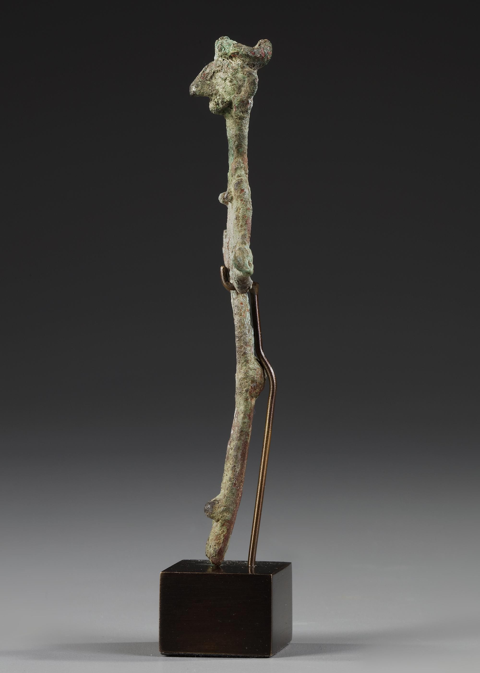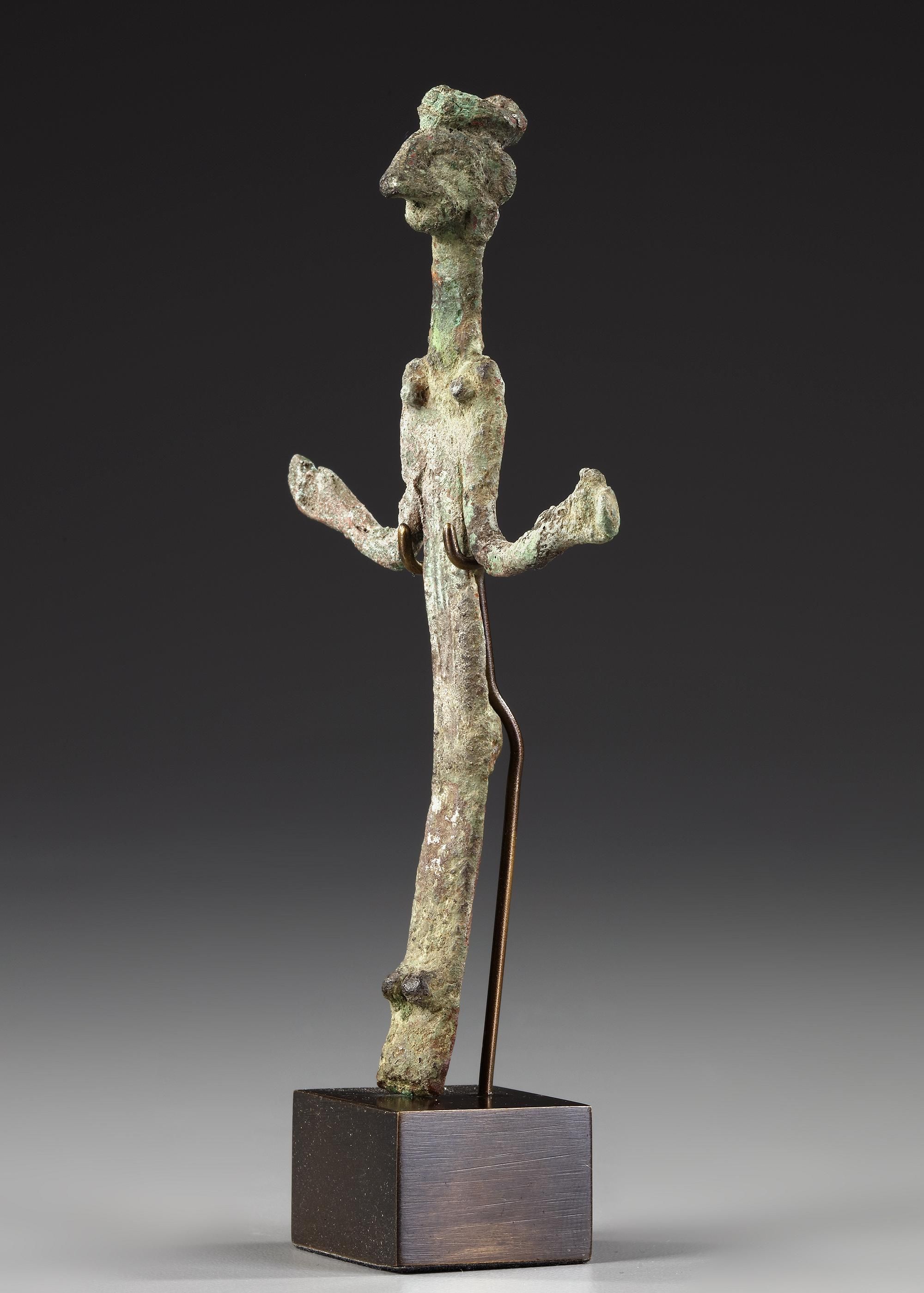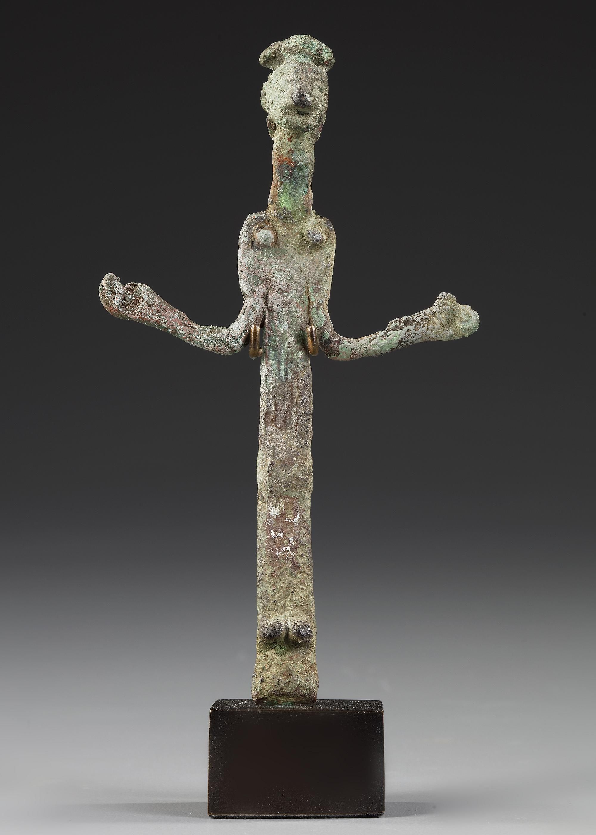 With stylized features of an elongated form, the body and limb flat in section, standing with the legs together, the slender arms held in to the side of the shoulders, with a long neck, a prominent aquiline nose and wearing a peaked headdress. Accompanied by custom-made stand.