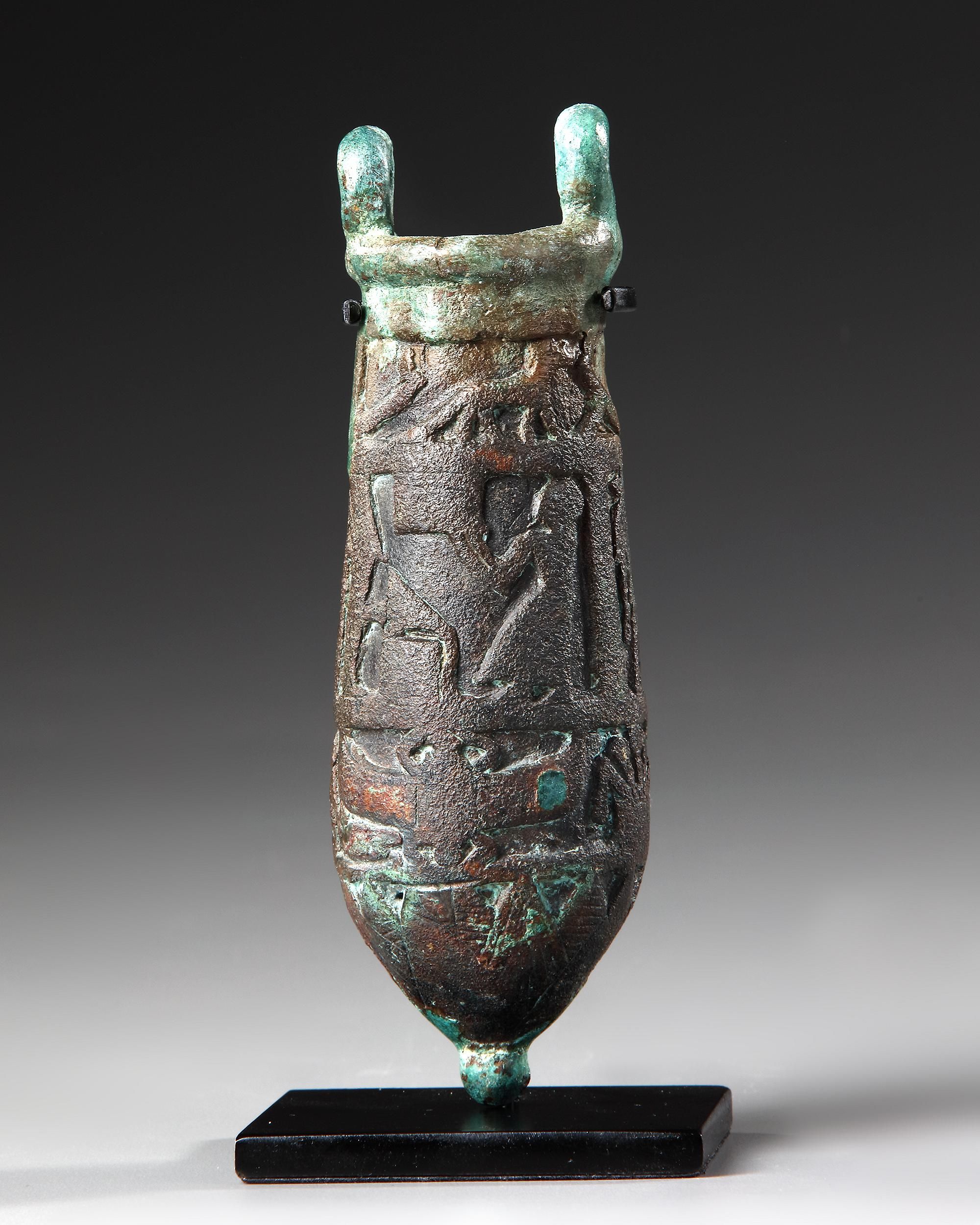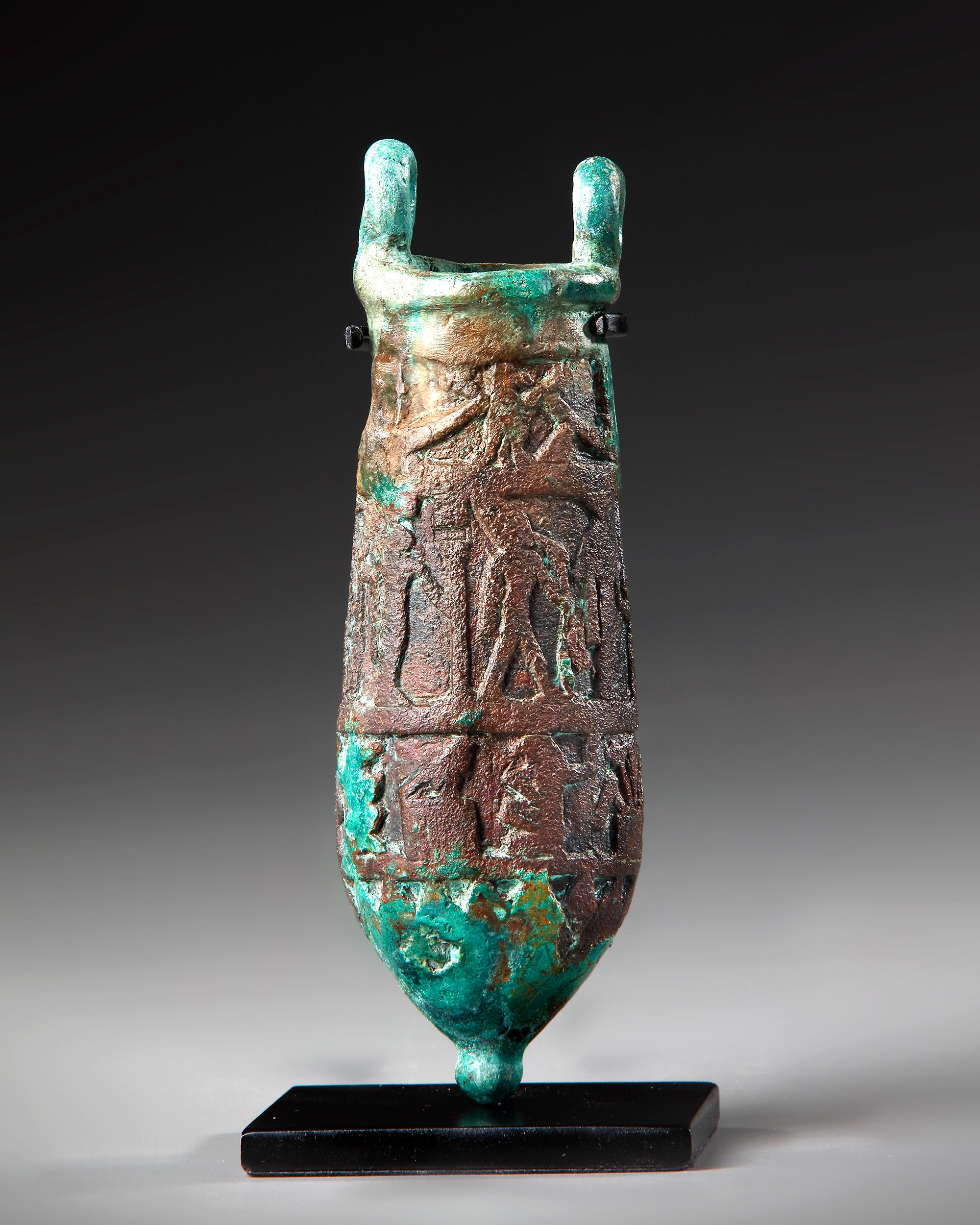With two distinct registers in raised relief depicting a procession of deities to the right, the mammiform base in the form of a lotus flower, with two loop-handles above the rim, possibly a band of hieroglyphs below, reading: Lord of...Winged Scarab/Winged Sun-disk(?).