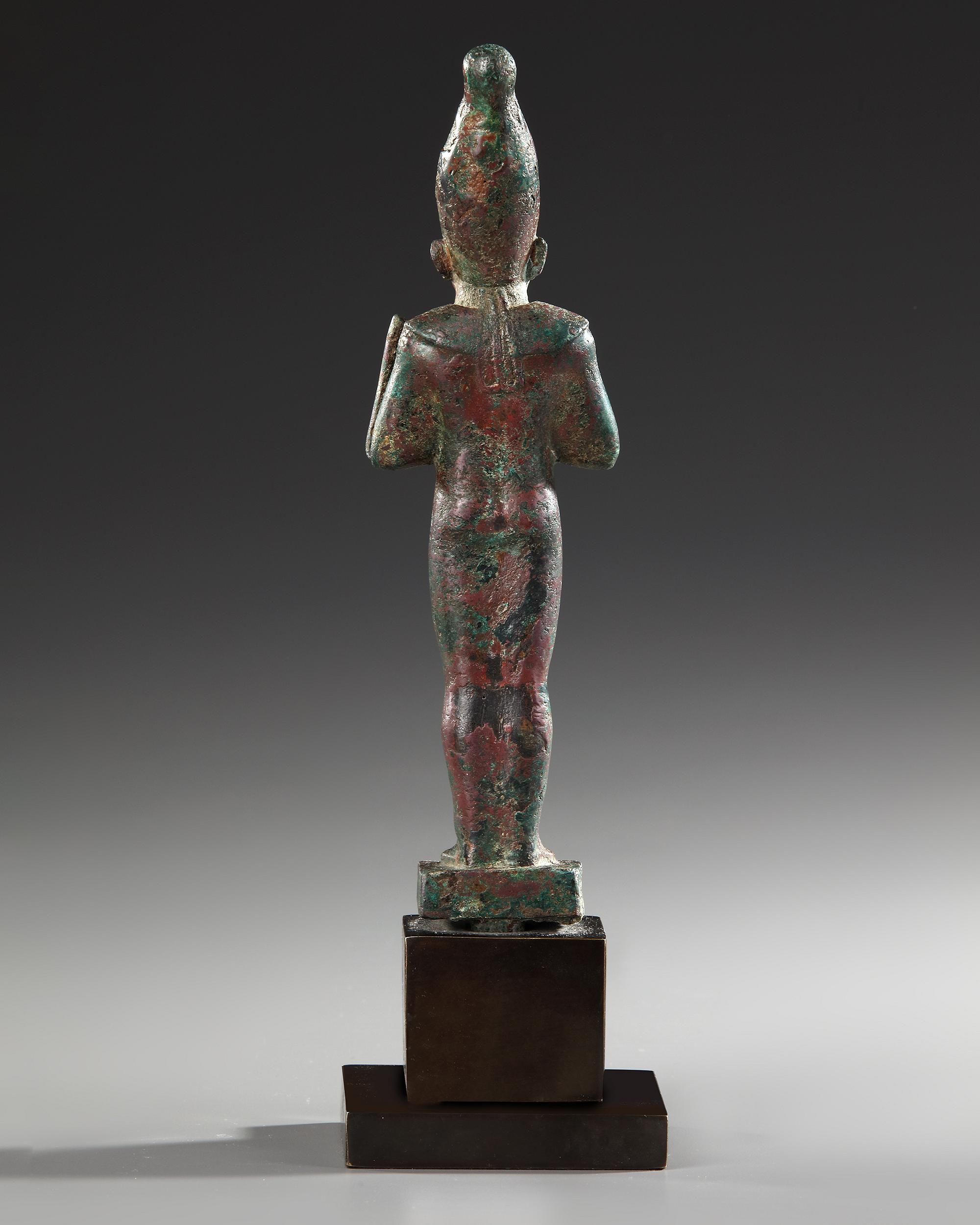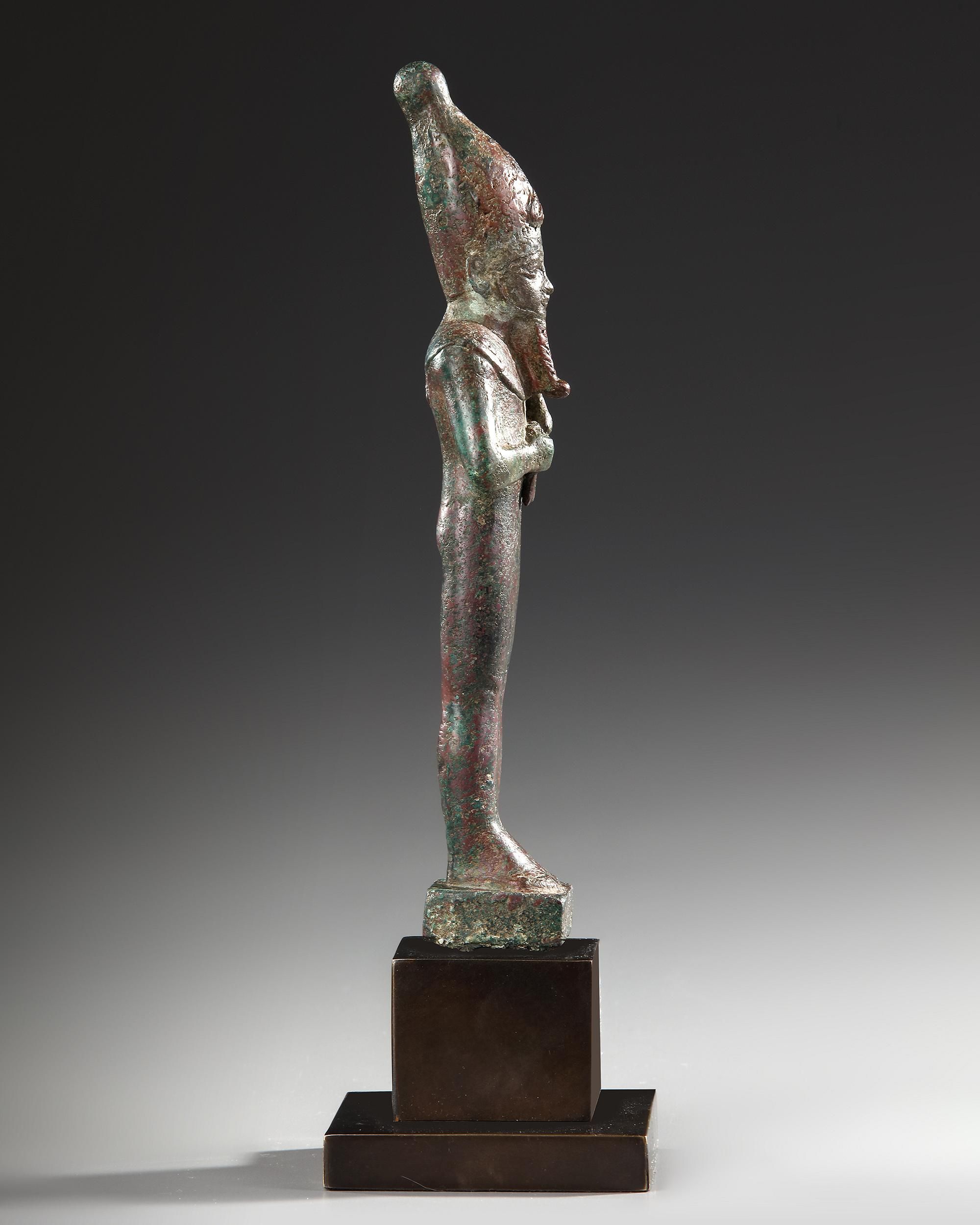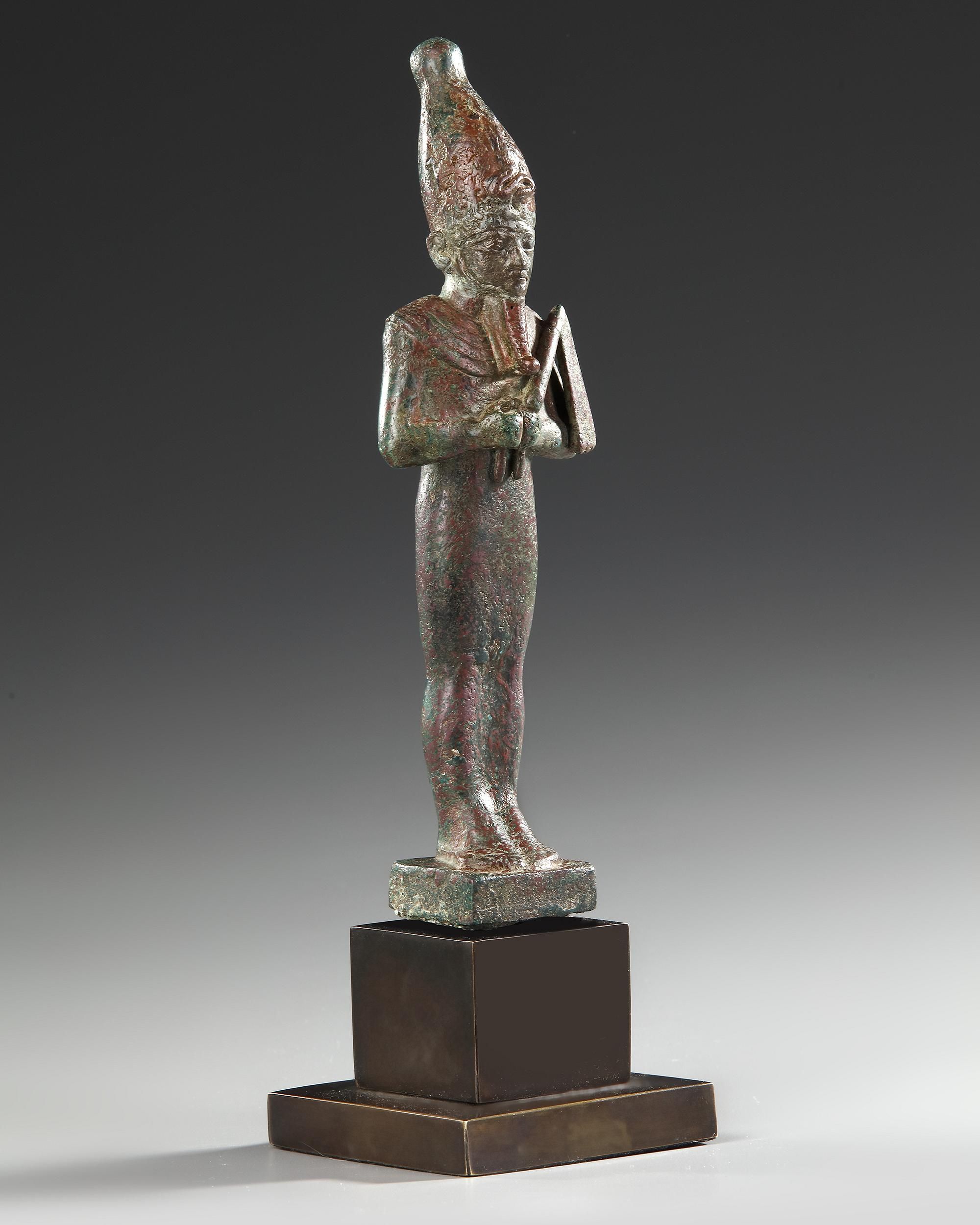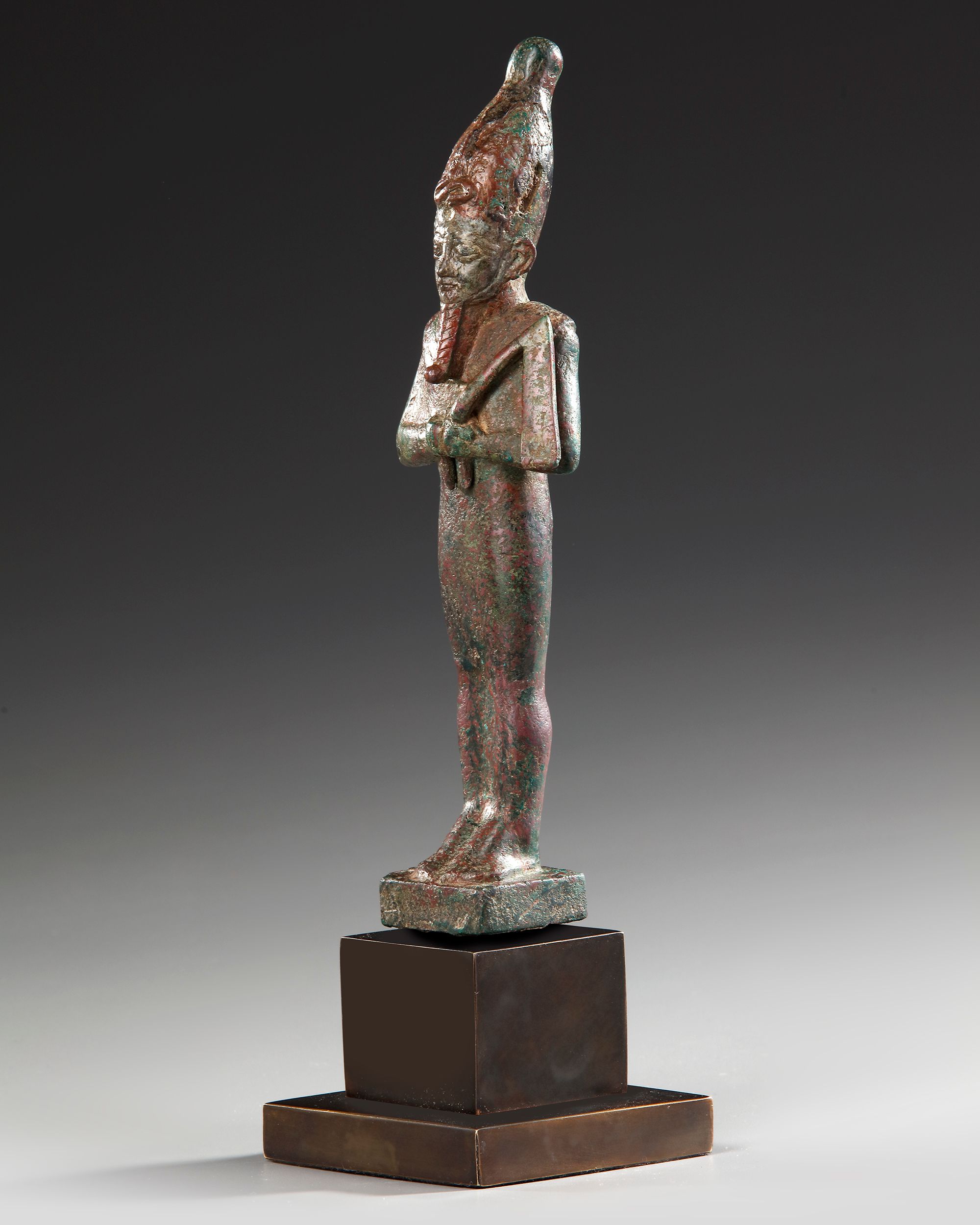 The standing statuette Osiris made from bronze, mummy, hands clasped on his chest, he holds the flagellum in his right hand. He is wearing the white crown and the Uraeus. He wears a fake beard, and is adorned with a Wesekh collar.