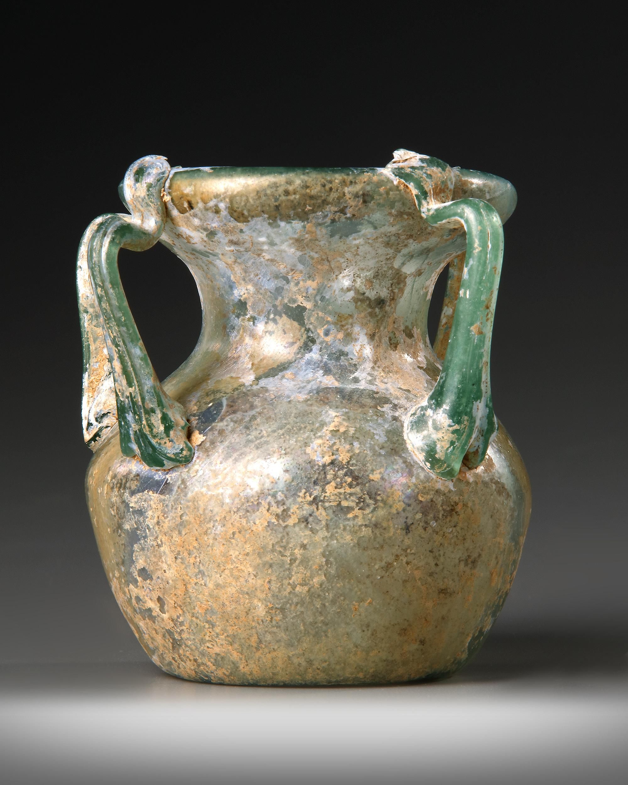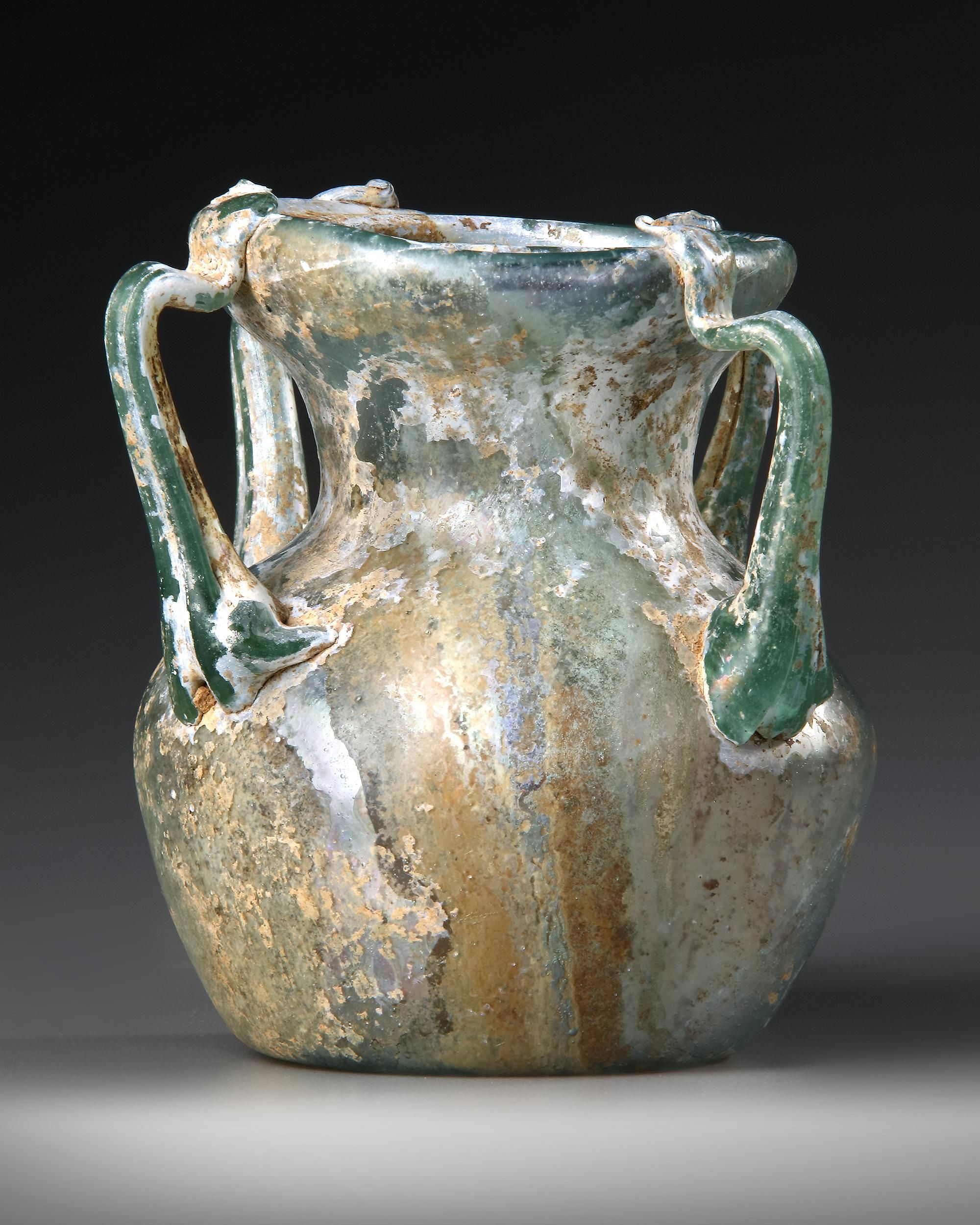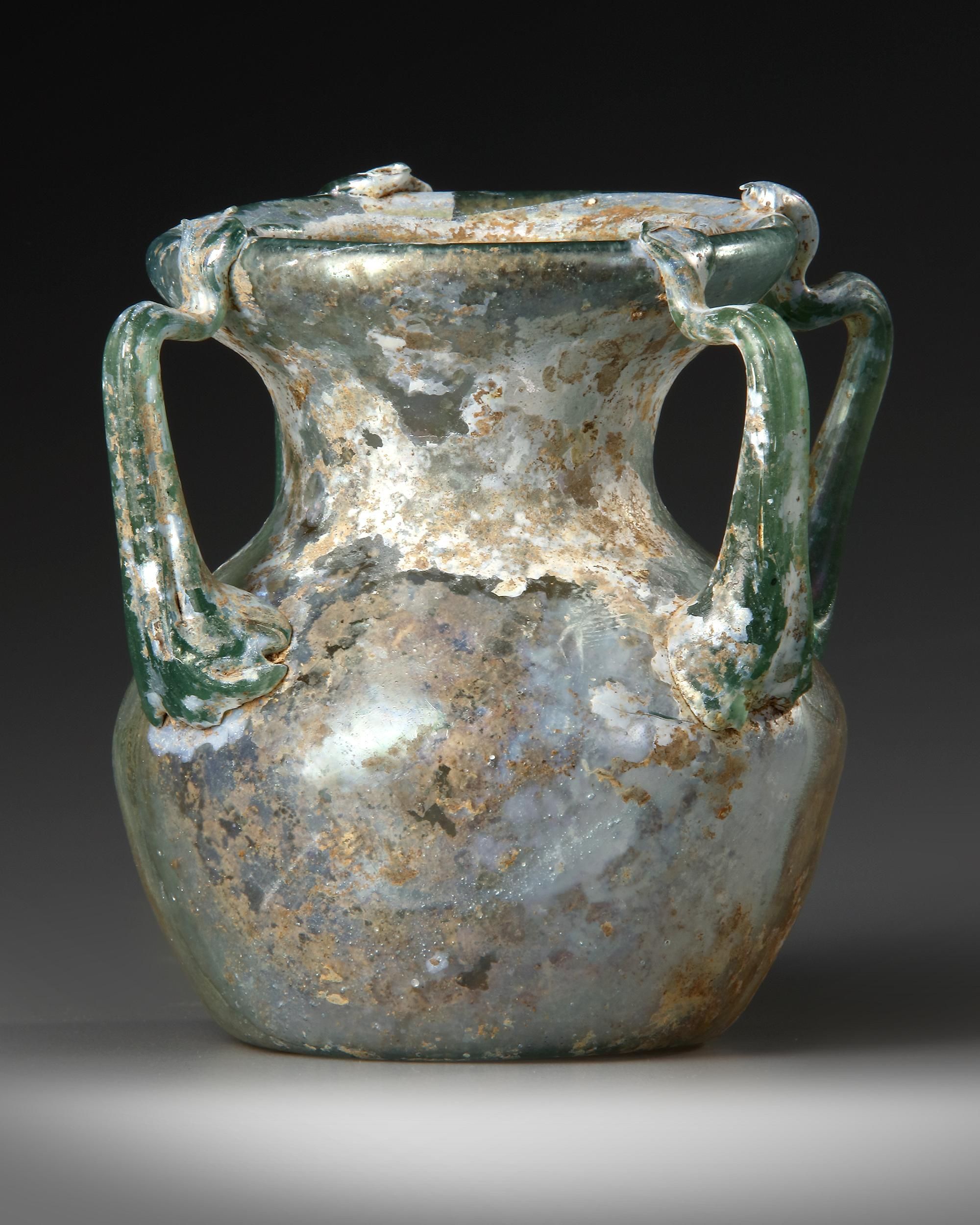 An intact collar-shaped neck and broad mouth, four trail handles extending from the rim to the shoulder of the bulbous shaped body, with a pushed-in conical base and some silver iridescence in the surface.