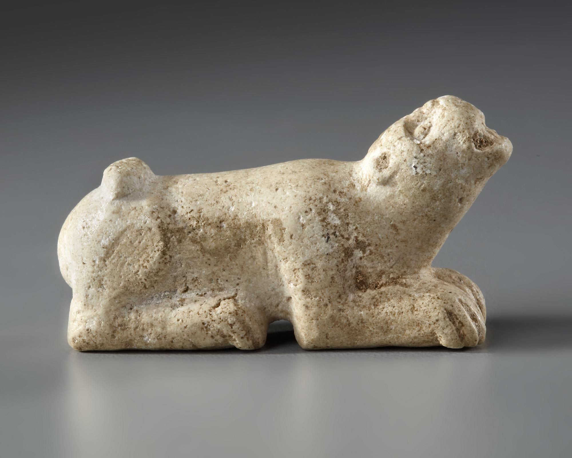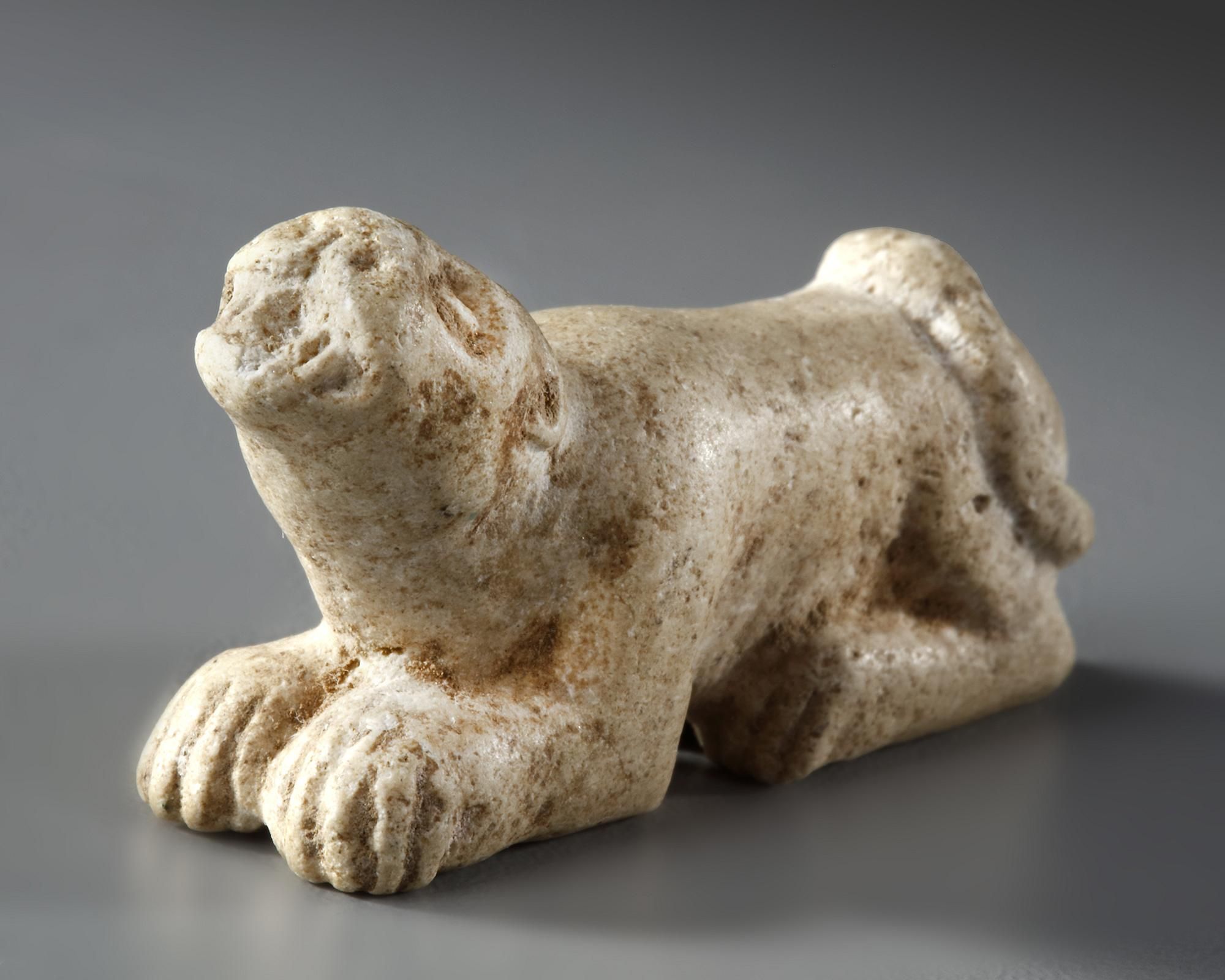 An Elamite amulet made from limestone in the form of a reclining mythical lion, with head facing upwards open mouth.