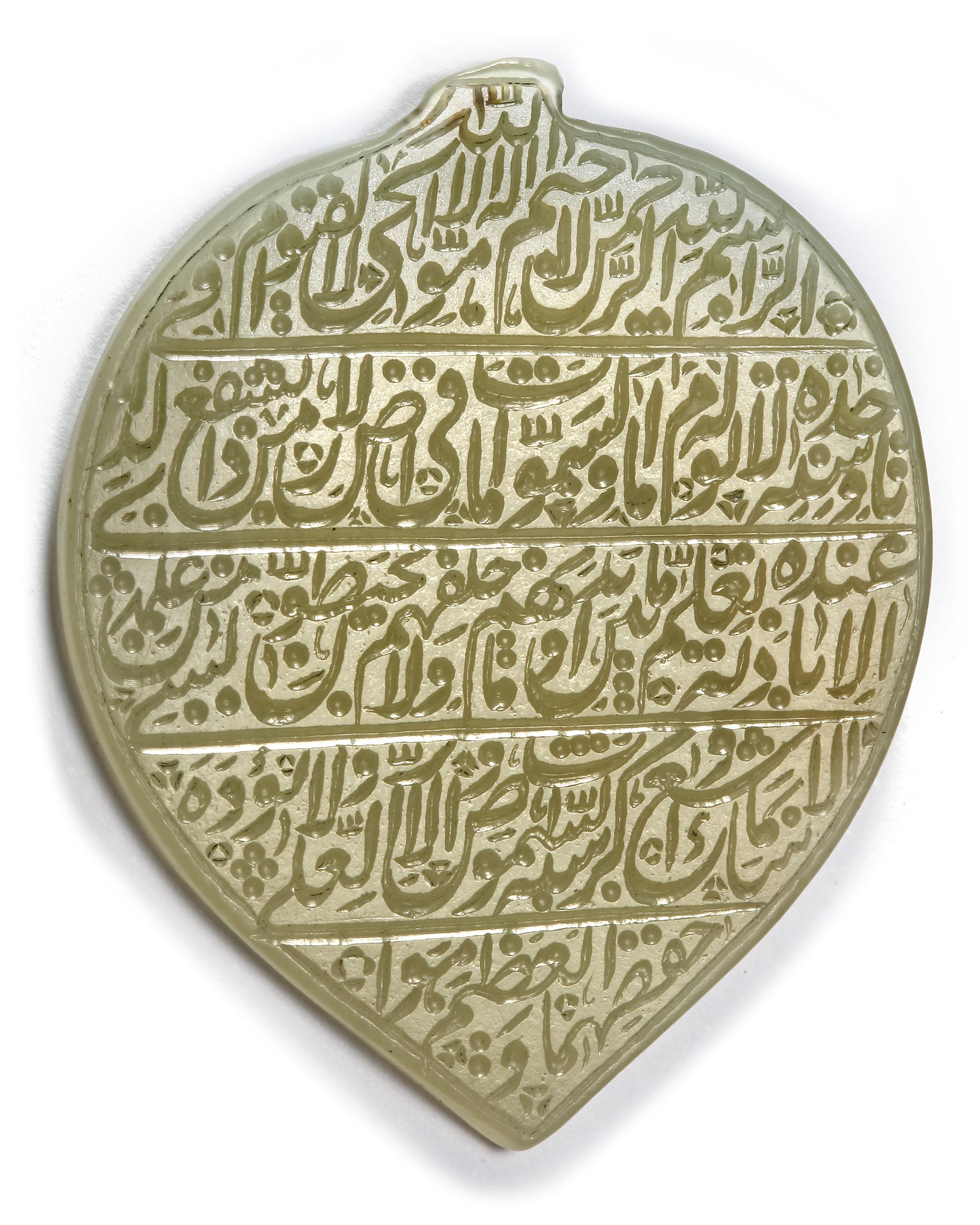 A jade pear-shaped pendant , engraved with the text " أية الكرسي من سورة البقرة, Ayat al-Kursi from Surah Al-Baqarah" in naskh script .