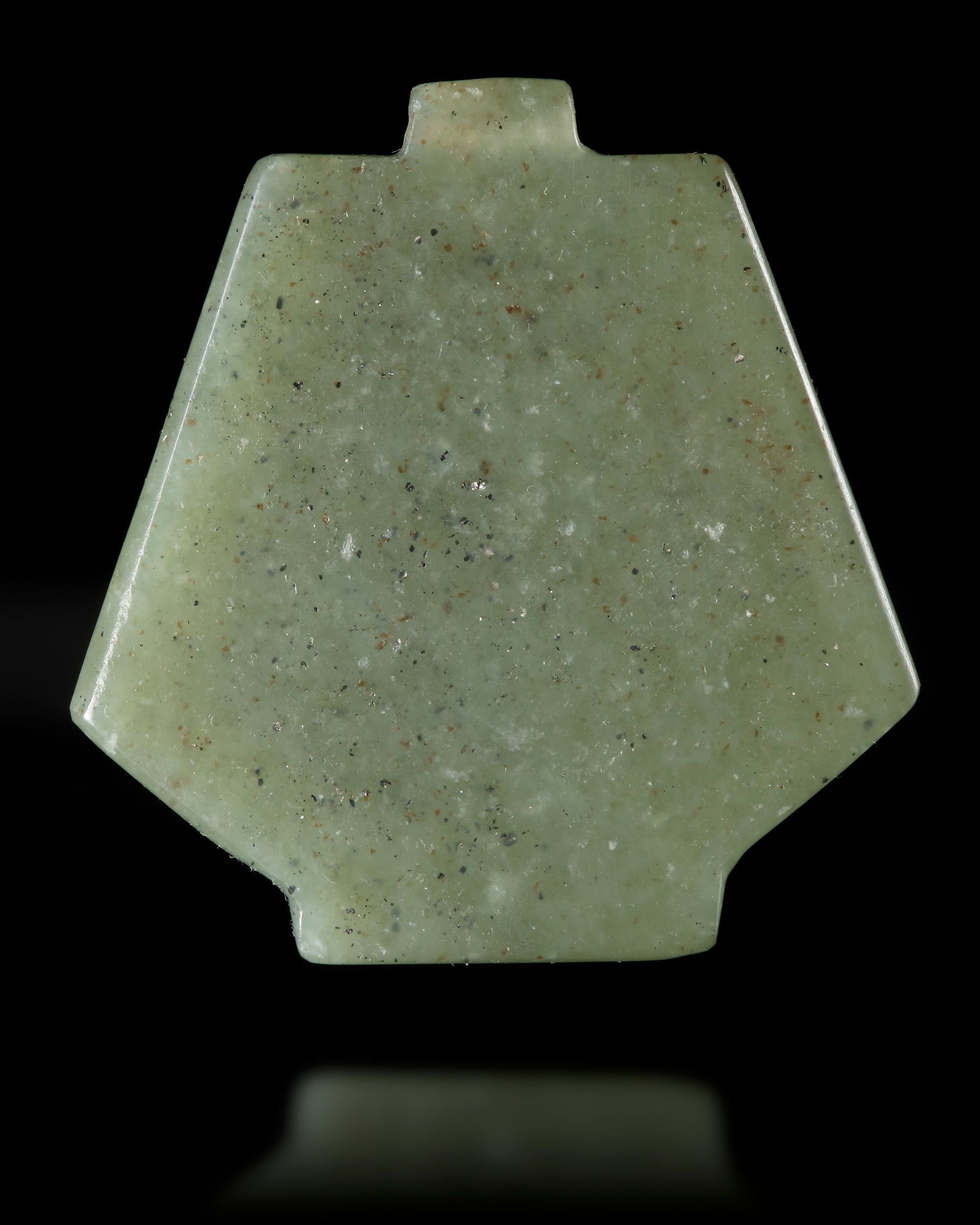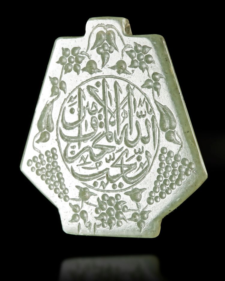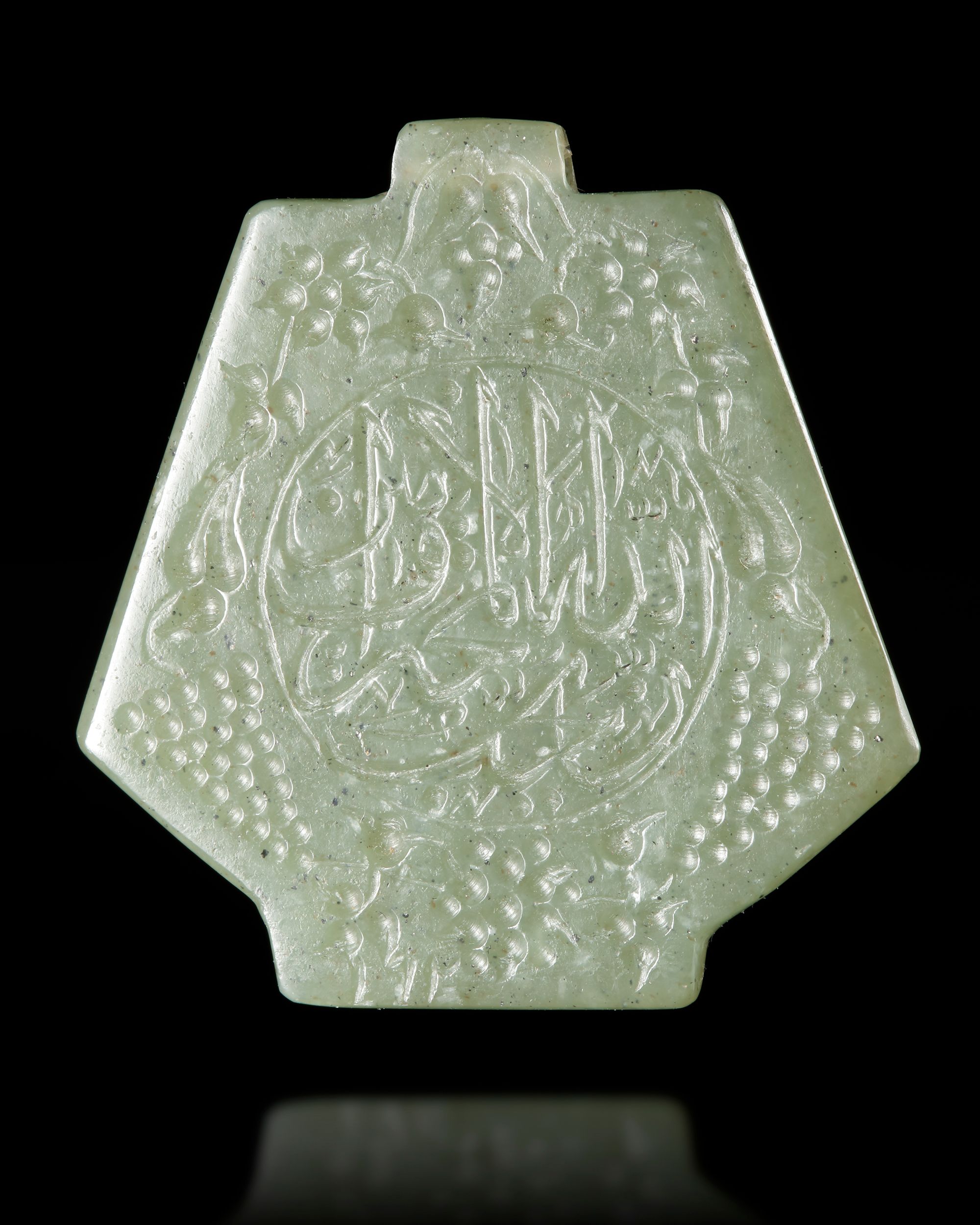 A jade pendant engraved on both sides with a central roundel enclosing the text " إن الله يحب المحترف الأمين, A Hadith" in large naskh script surrounded by grapes and floral motifs.