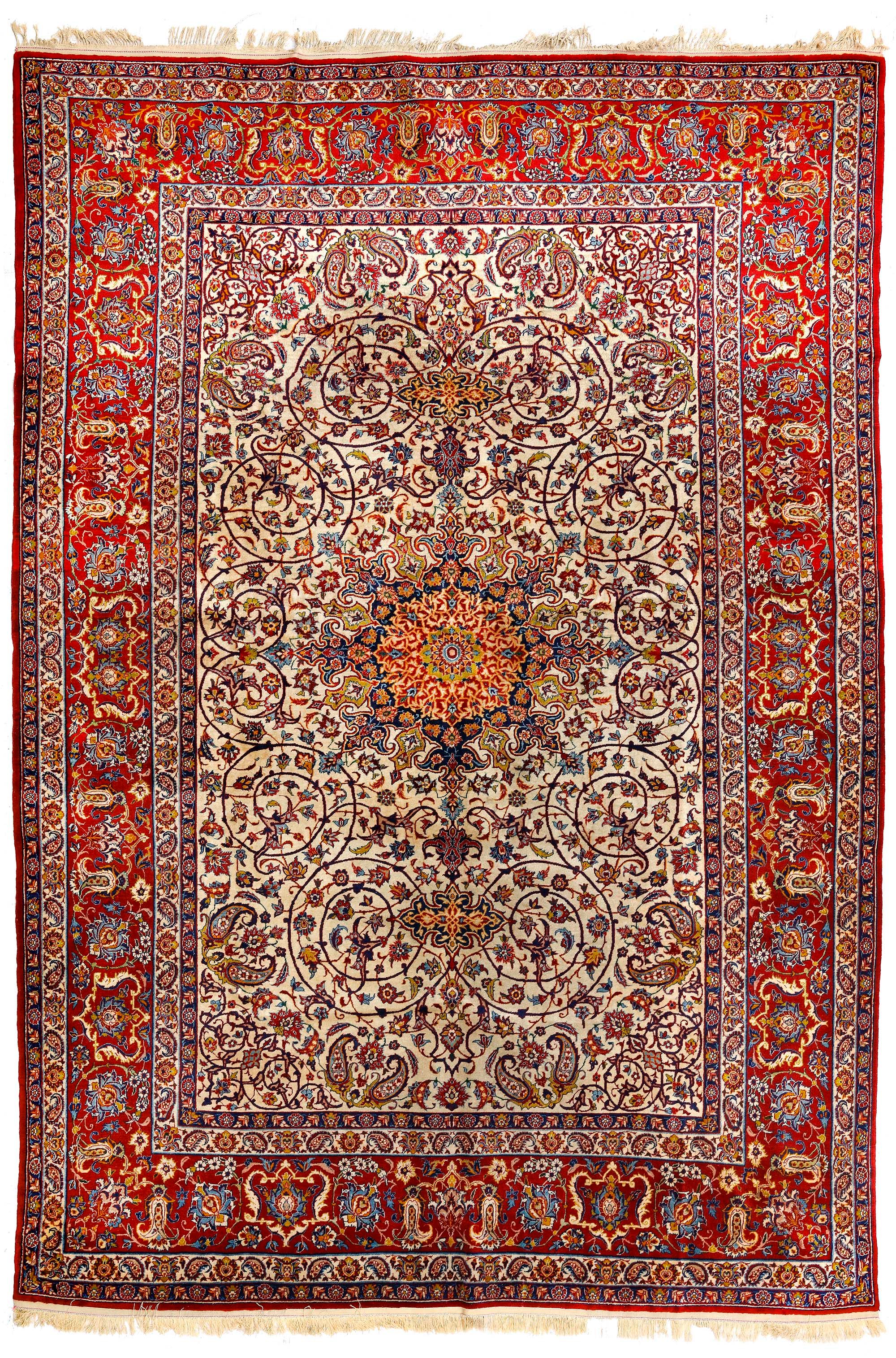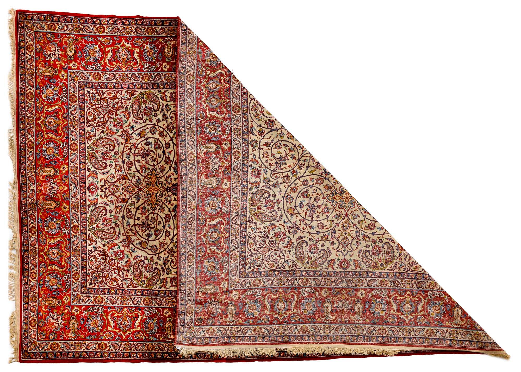 On silk foundation, original sides and fringes. A few stains but in an overall good condition. 310 by 215 cm.