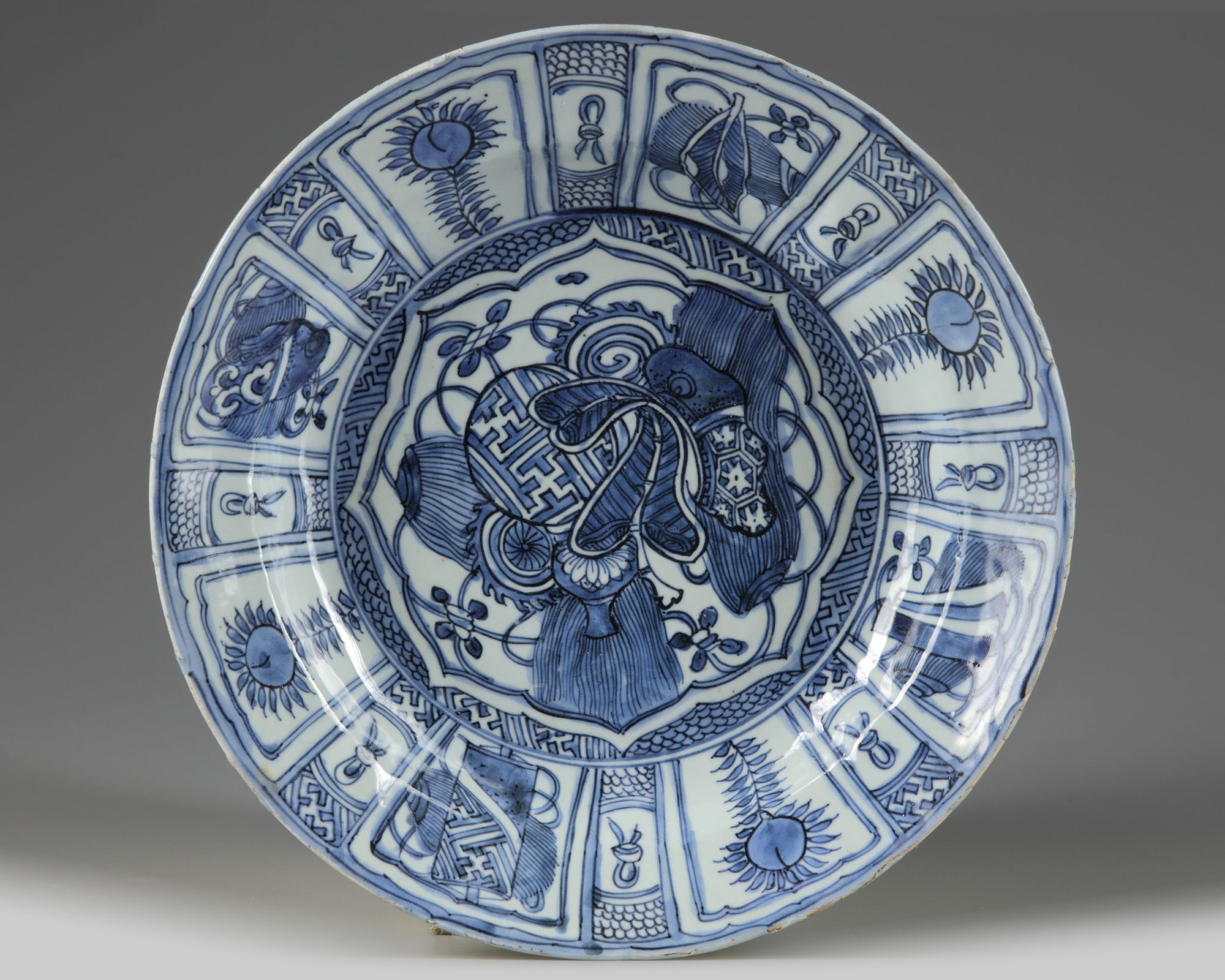 The dish is finely decorated to the centre with a star-shaped panel enclosing precious objects such as a fan, a double gourd, and tassels, all surrounded by further lappet-shaped panels enclosing alternating precious objects and flowers separated by brocade designs. Provenance: from a private Dutch collection