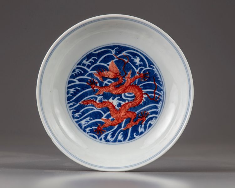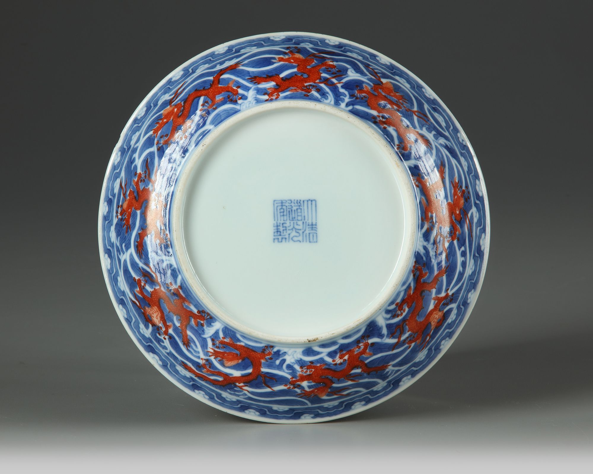The dish is finely decorated to the center with a roundel enclosing a writhing iron-red dragon on an underglaze blue ground of cresting waves. The exterior is decorated with nine further iron-red dragons in various positions on a similar ground below a band of demi-flower heads.