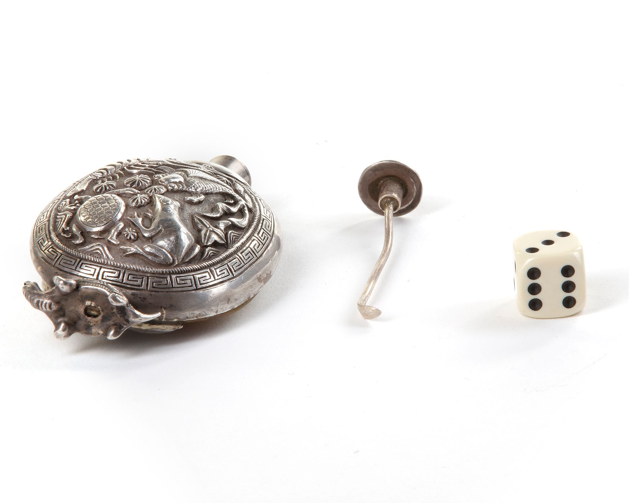 A russet jade snuff bottle mounted in a silver casing decorated with a frog, fishes and a lobster, all supported on a stand shaped as a turtle.