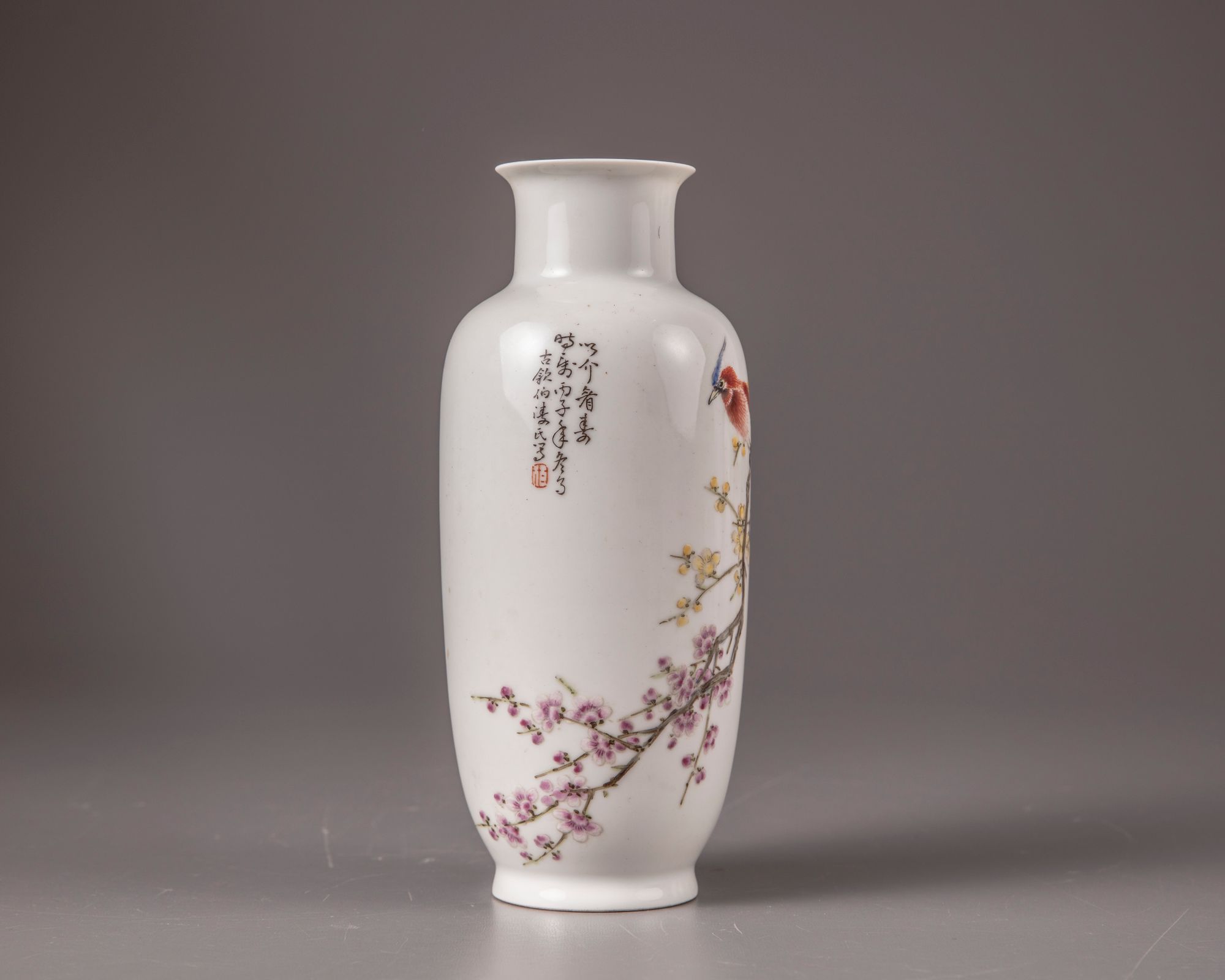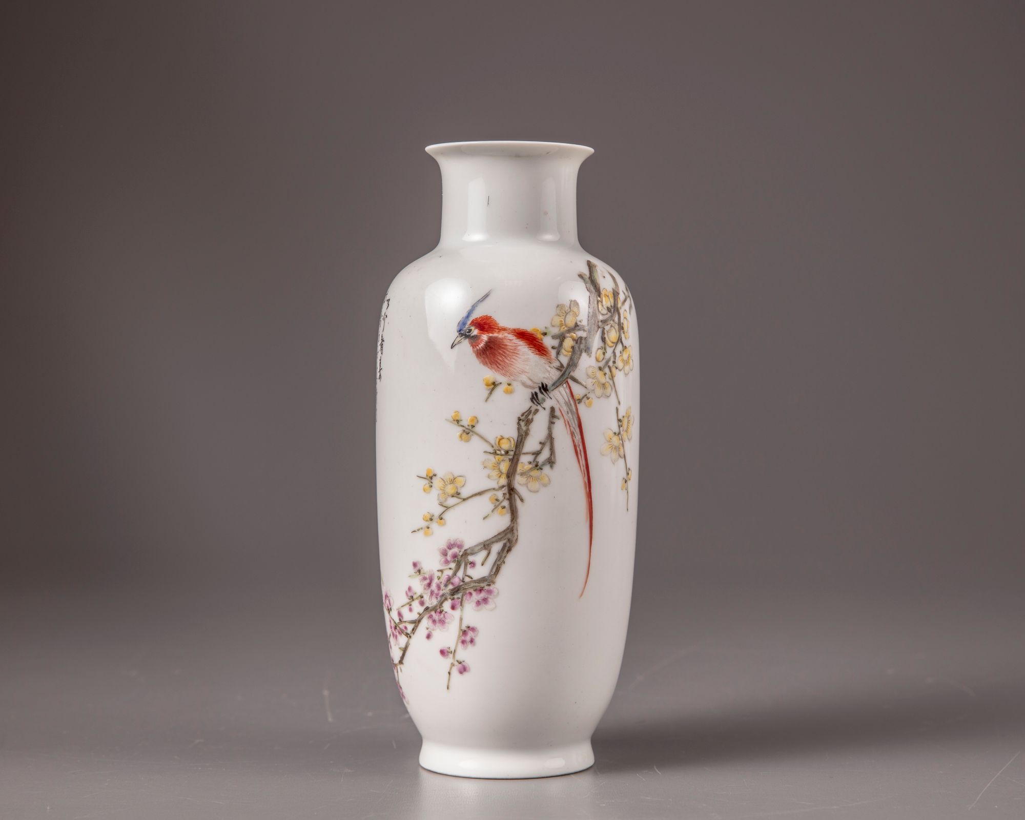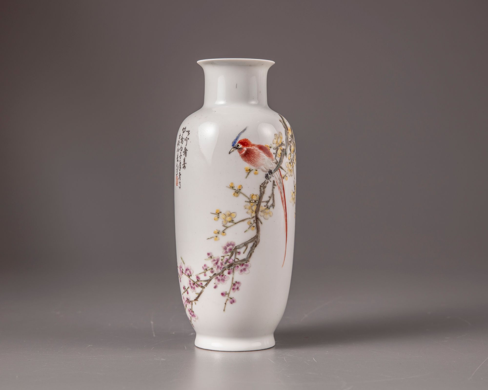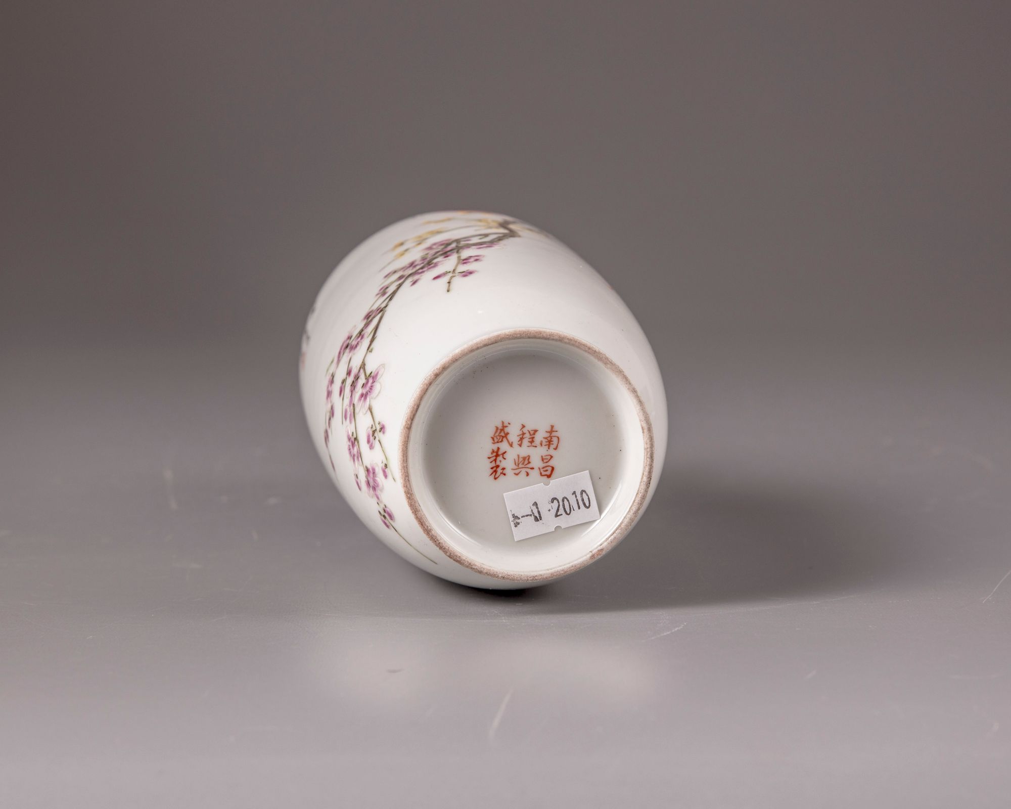 The vase is decorated with a bird perched on a flowering branch, the reverse is inscribed and signed Bi Botao, with one seal of the artist. The base is marked 'Nanchang cheng xing sheng zhi'.