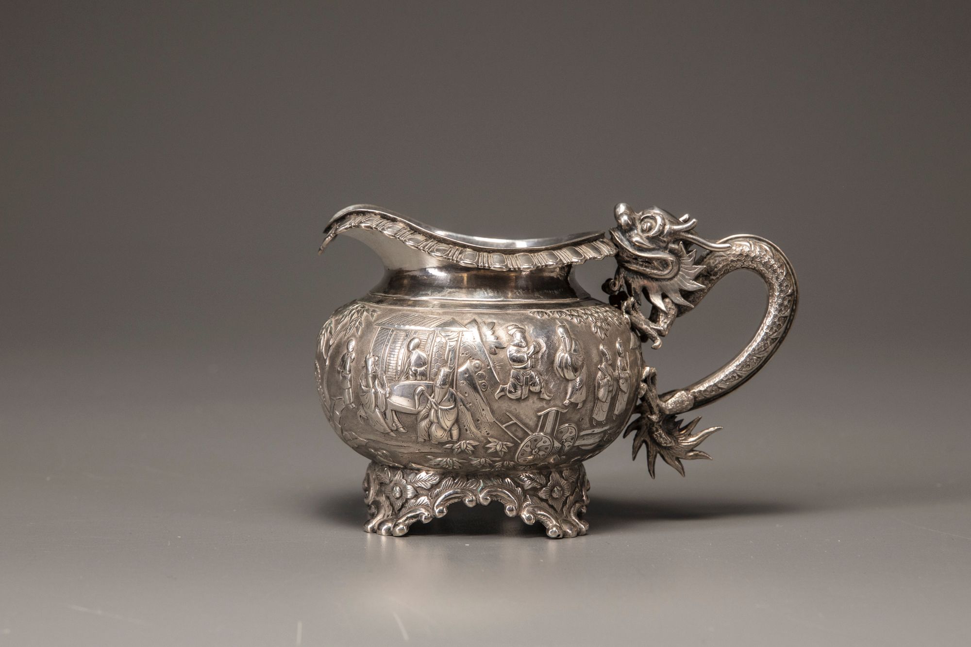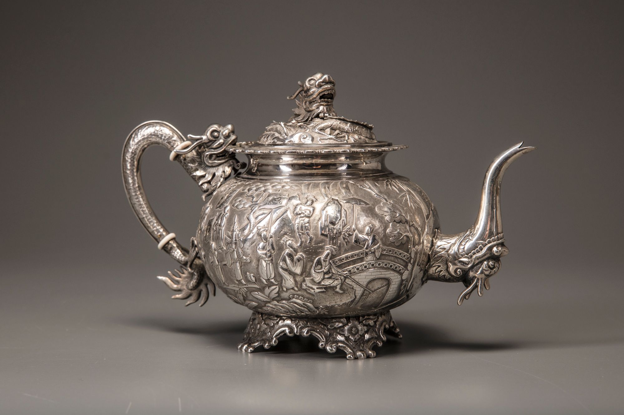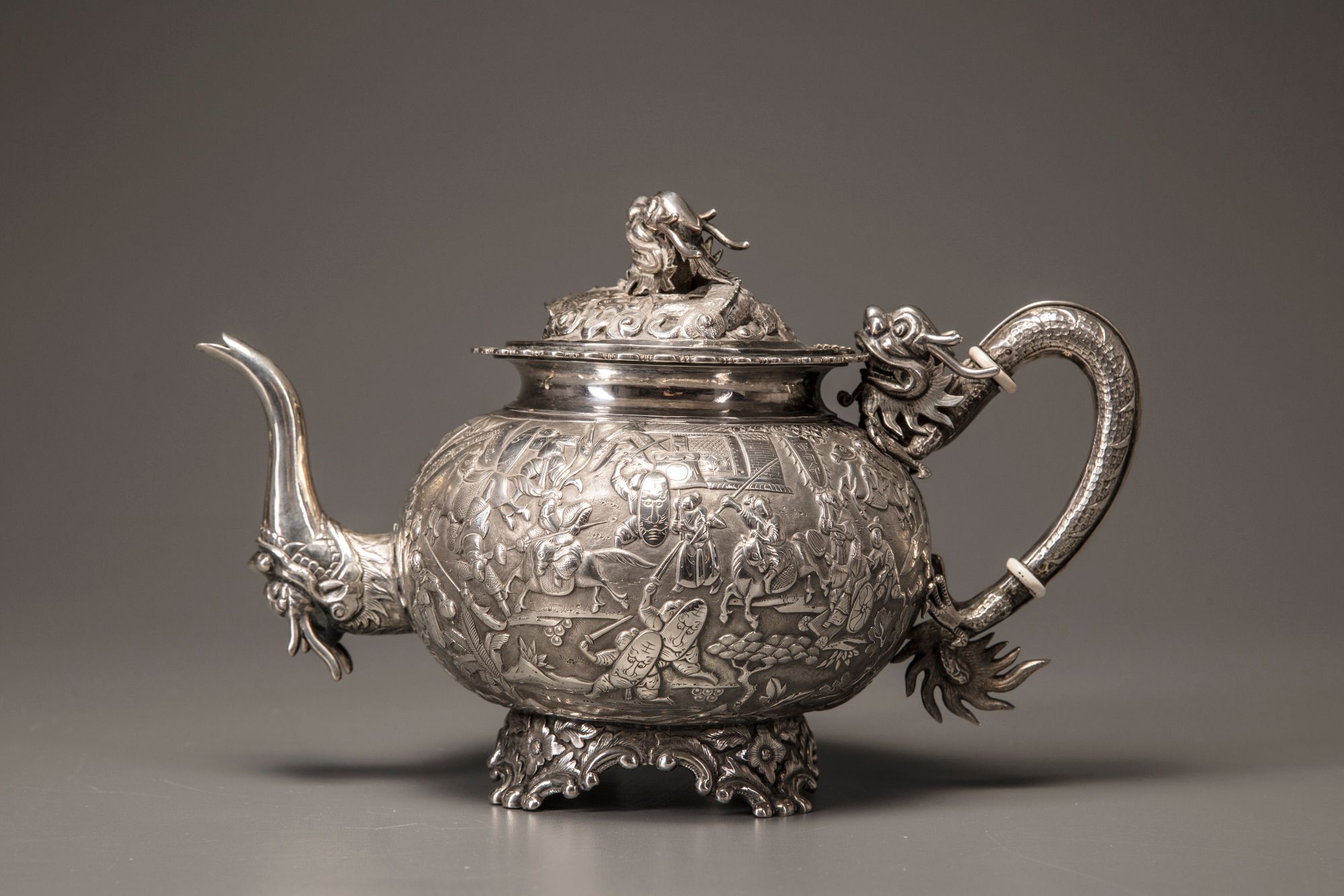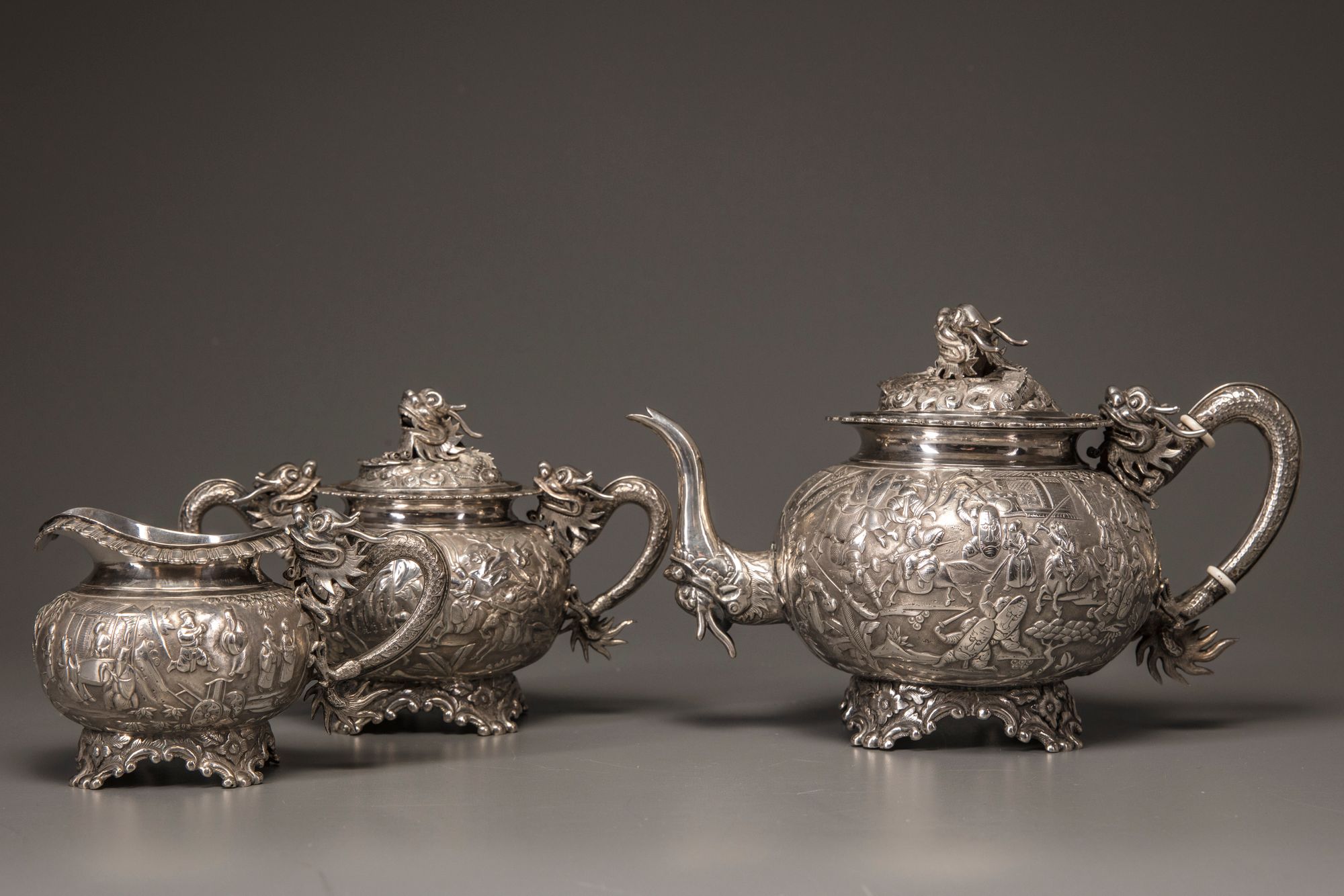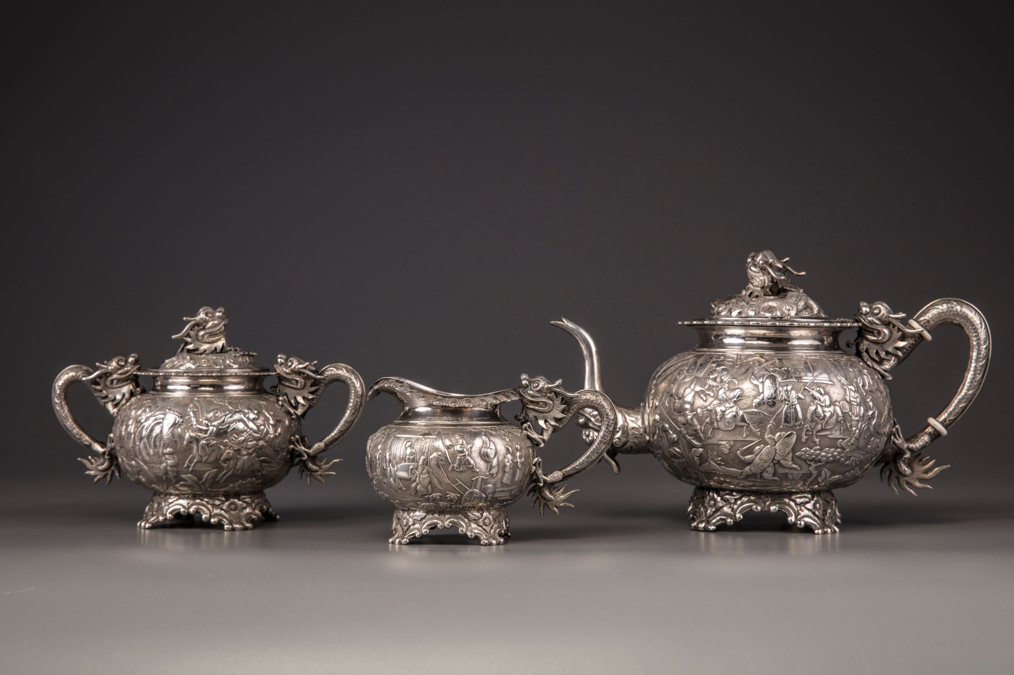 The set comprises a teapot, a two-handled sugar bowl and cover, and a milk jug. Each piece is fashioned with finely-modelled dragon handles with coiled beards and chased scales. The teapot with a dragon handle with ivory insulators and a dragon-head spout, each piece is decorated in repoussé with narrative scenes from the epic tale, The Water Margin. The domed covers are similarly decorated and surmounted by a coiled dragon amongst clouds. Each vessels stands on four floral and acanthus feet. Each piece is marked 'WH', '90', the silversmith's mark 'Heng you', and a European 'J' mark.