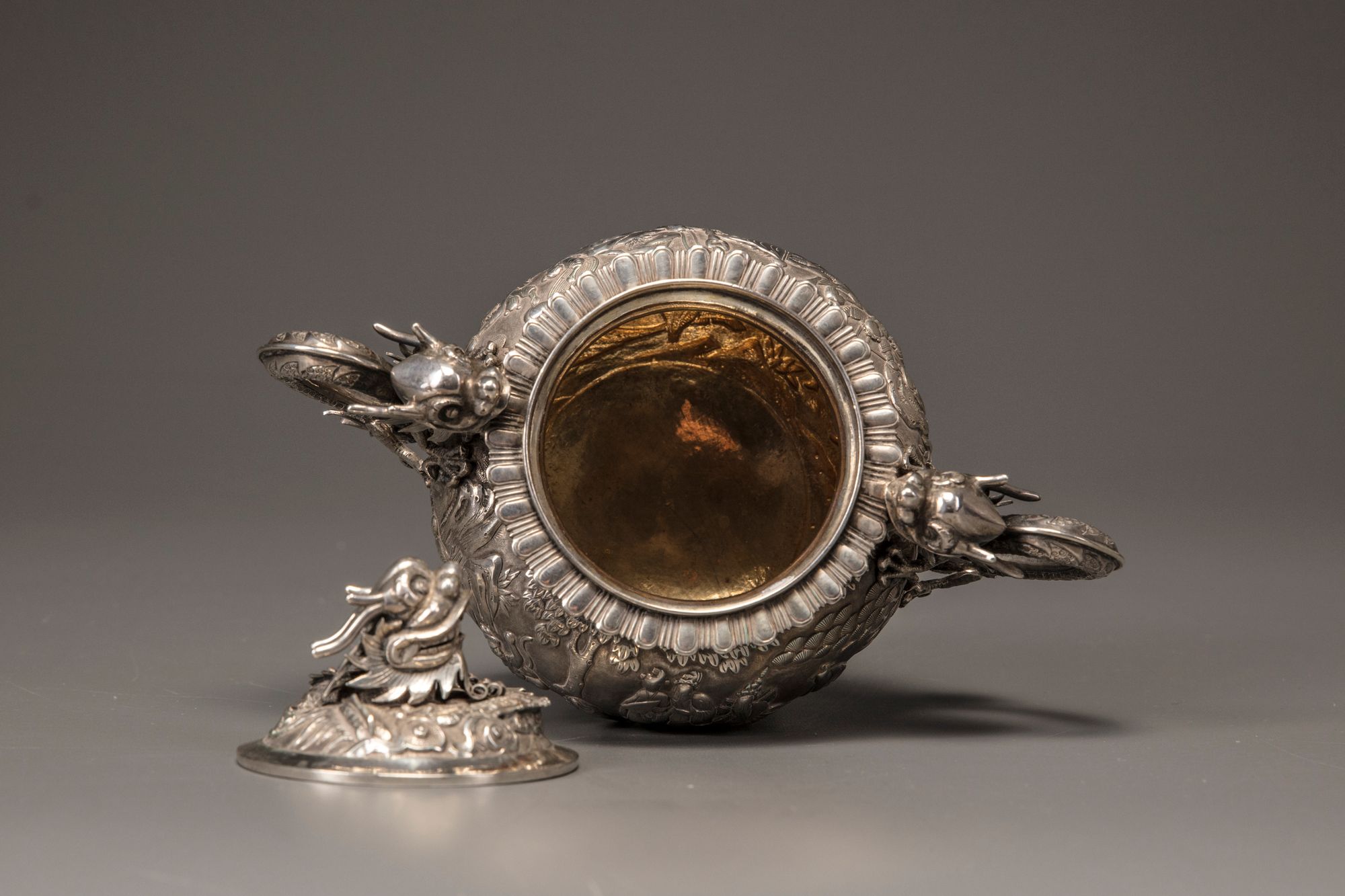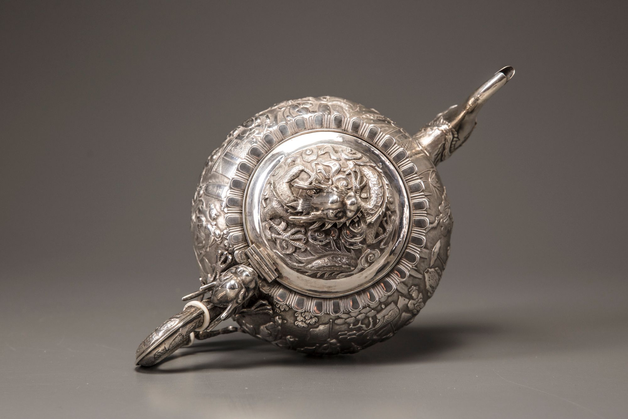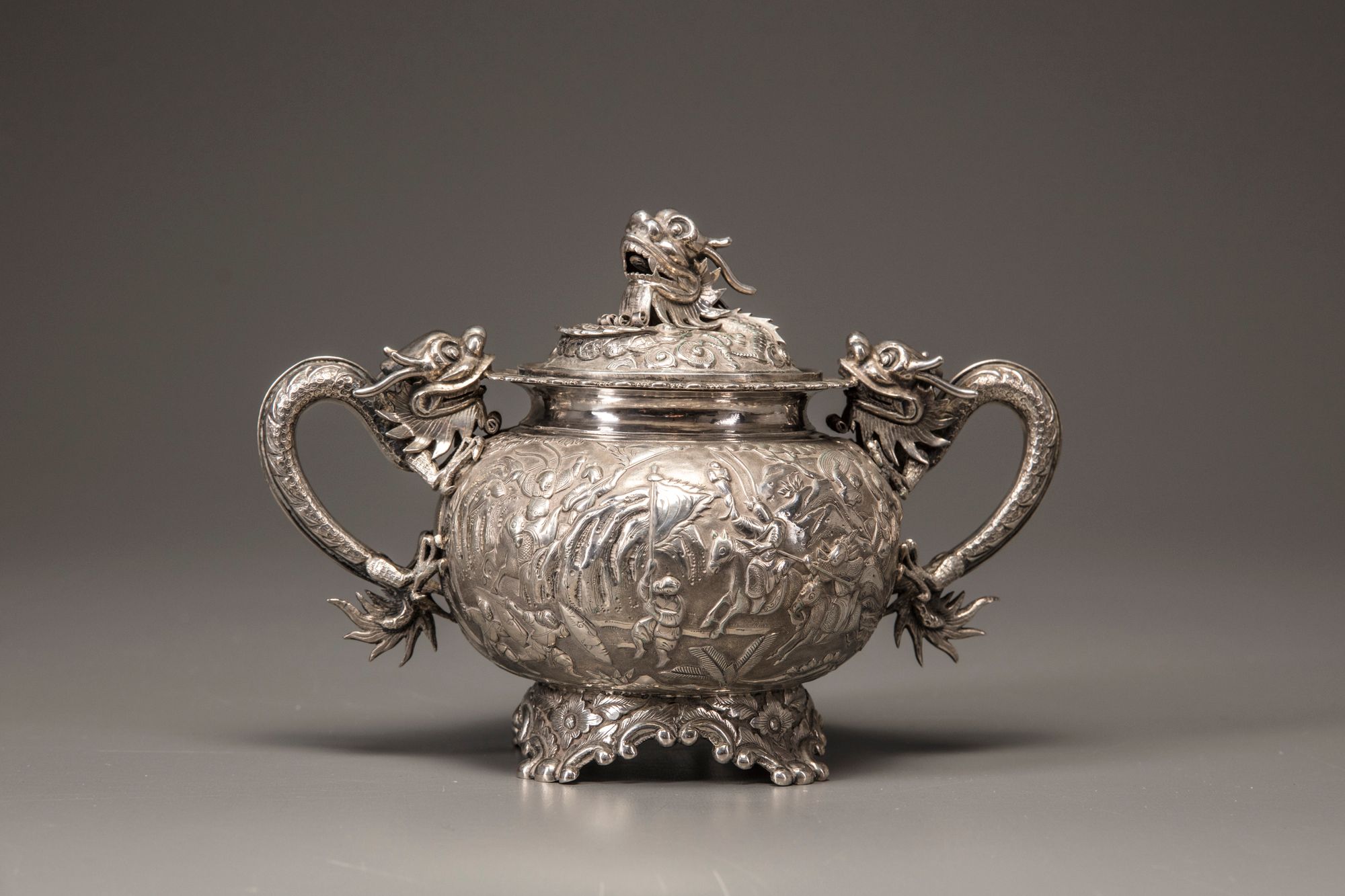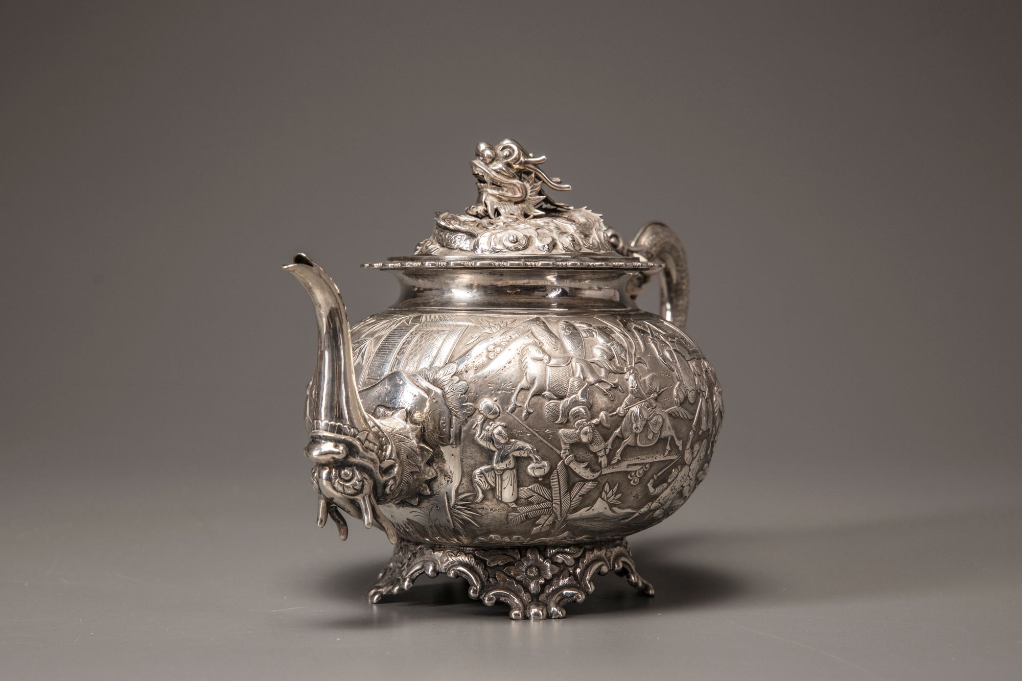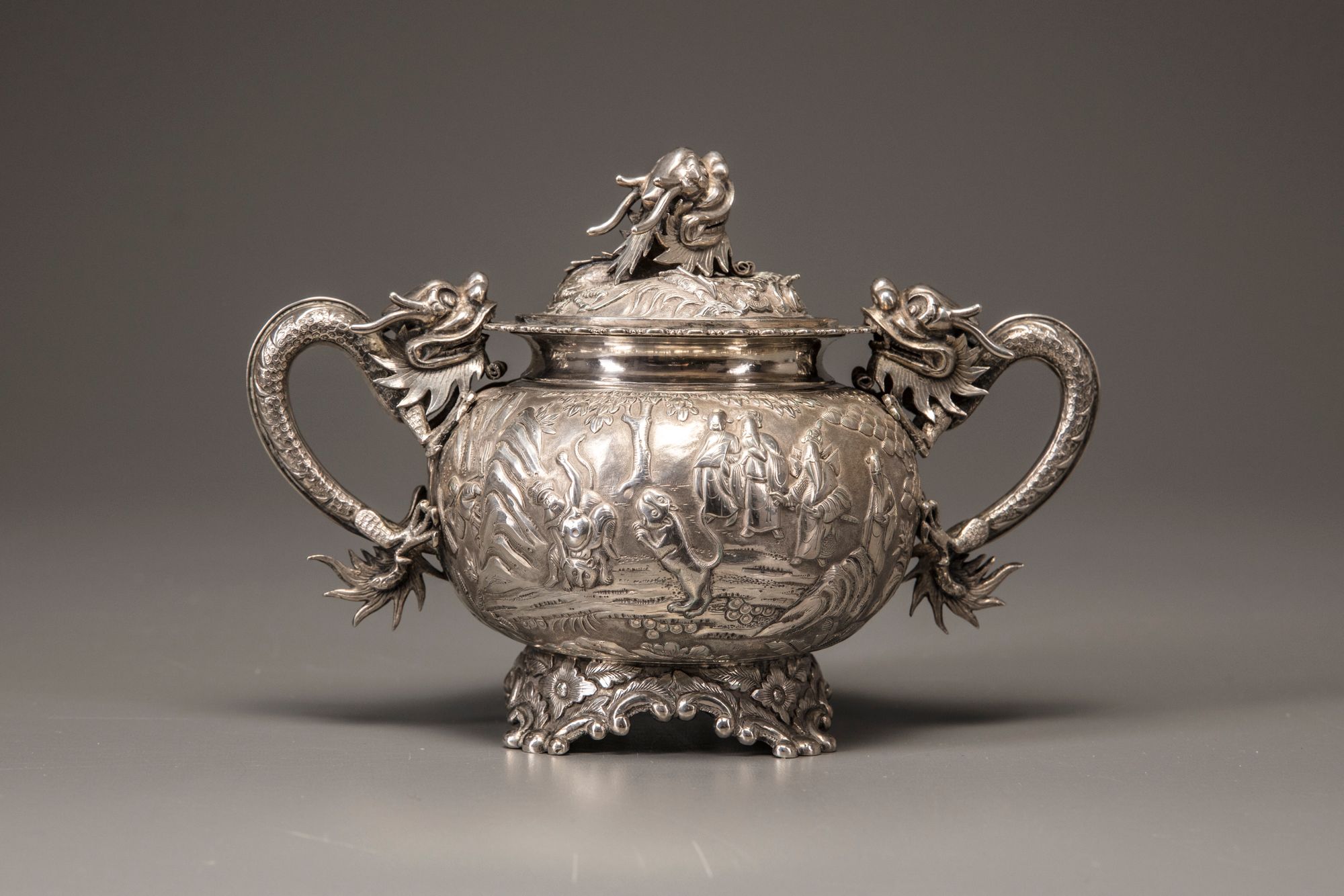 The set comprises a teapot, a two-handled sugar bowl and cover, and a milk jug. Each piece is fashioned with finely-modelled dragon handles with coiled beards and chased scales. The teapot with a dragon handle with ivory insulators and a dragon-head spout, each piece is decorated in repoussé with narrative scenes from the epic tale, The Water Margin. The domed covers are similarly decorated and surmounted by a coiled dragon amongst clouds. Each vessels stands on four floral and acanthus feet. Each piece is marked 'WH', '90', the silversmith's mark 'Heng you', and a European 'J' mark.