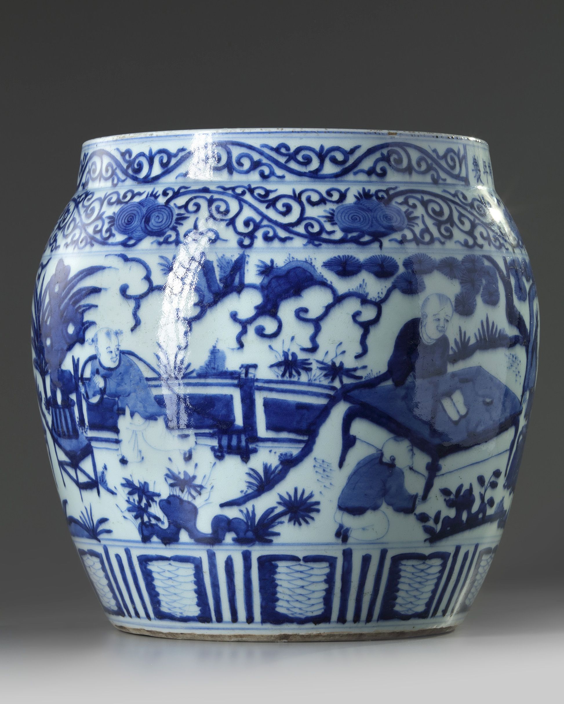 The jar is decorated in washed cobalt blue tones with a continuous scene of boys at play in a fenced garden amongst rocks and pine trees, all above a lappet band at the rim. The shoulder is decorated with a scrolling lingzhi band below a classic scroll band which also bears an apocryphal Jiajing mark.