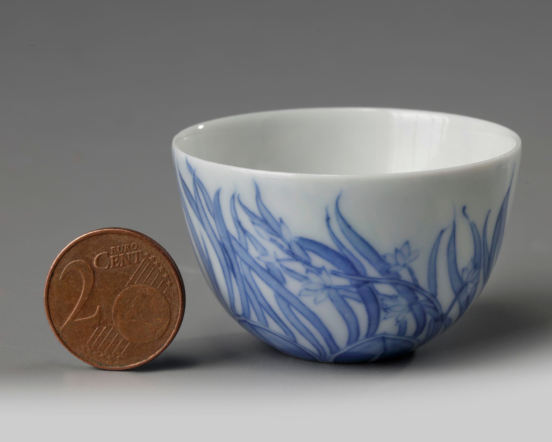 The cup is delicately decorated with orchids and leaves swaying in the wind, the recessed foot is surrounded by a band of petals. The base bears a Kangxi six-character mark within a double circle.