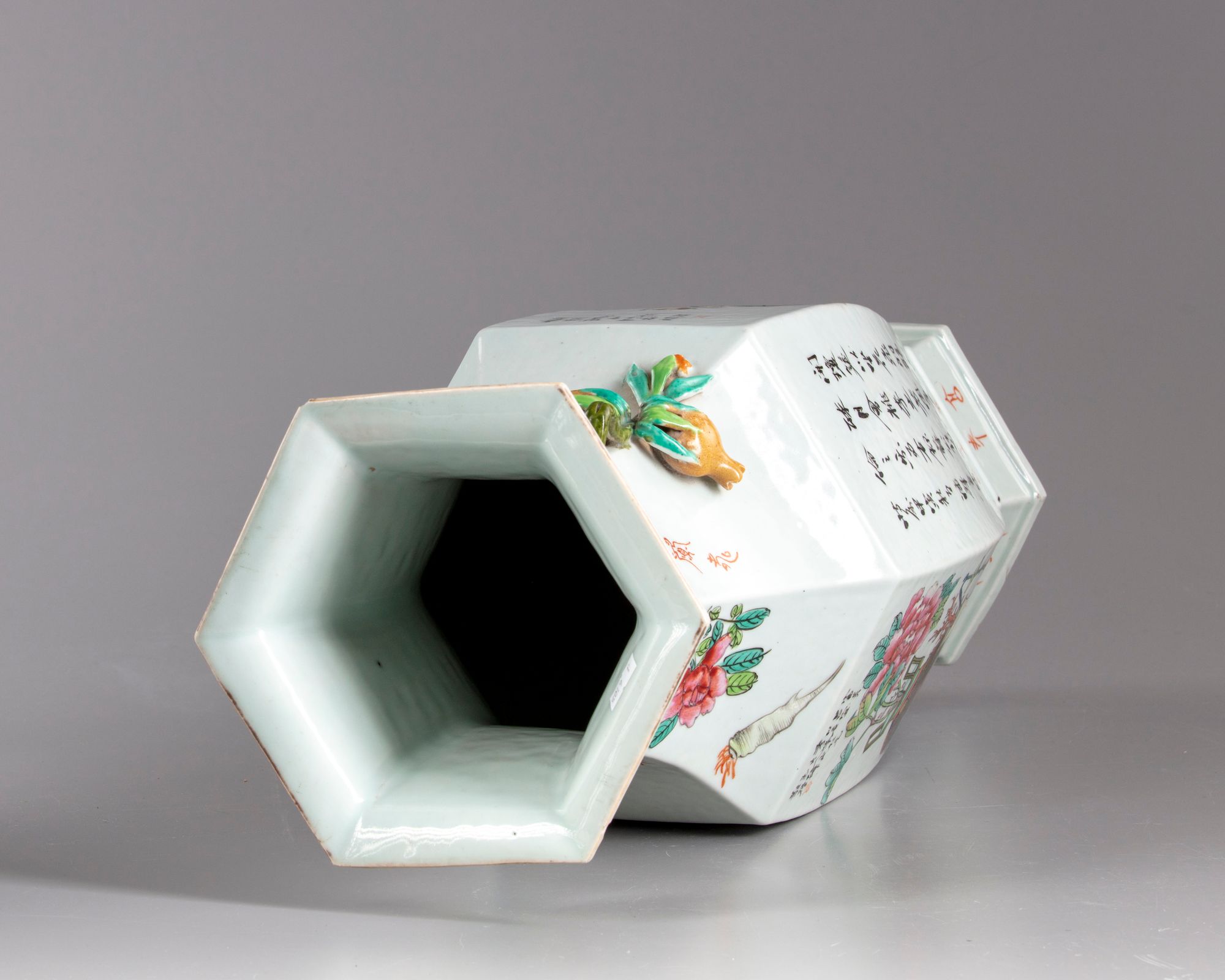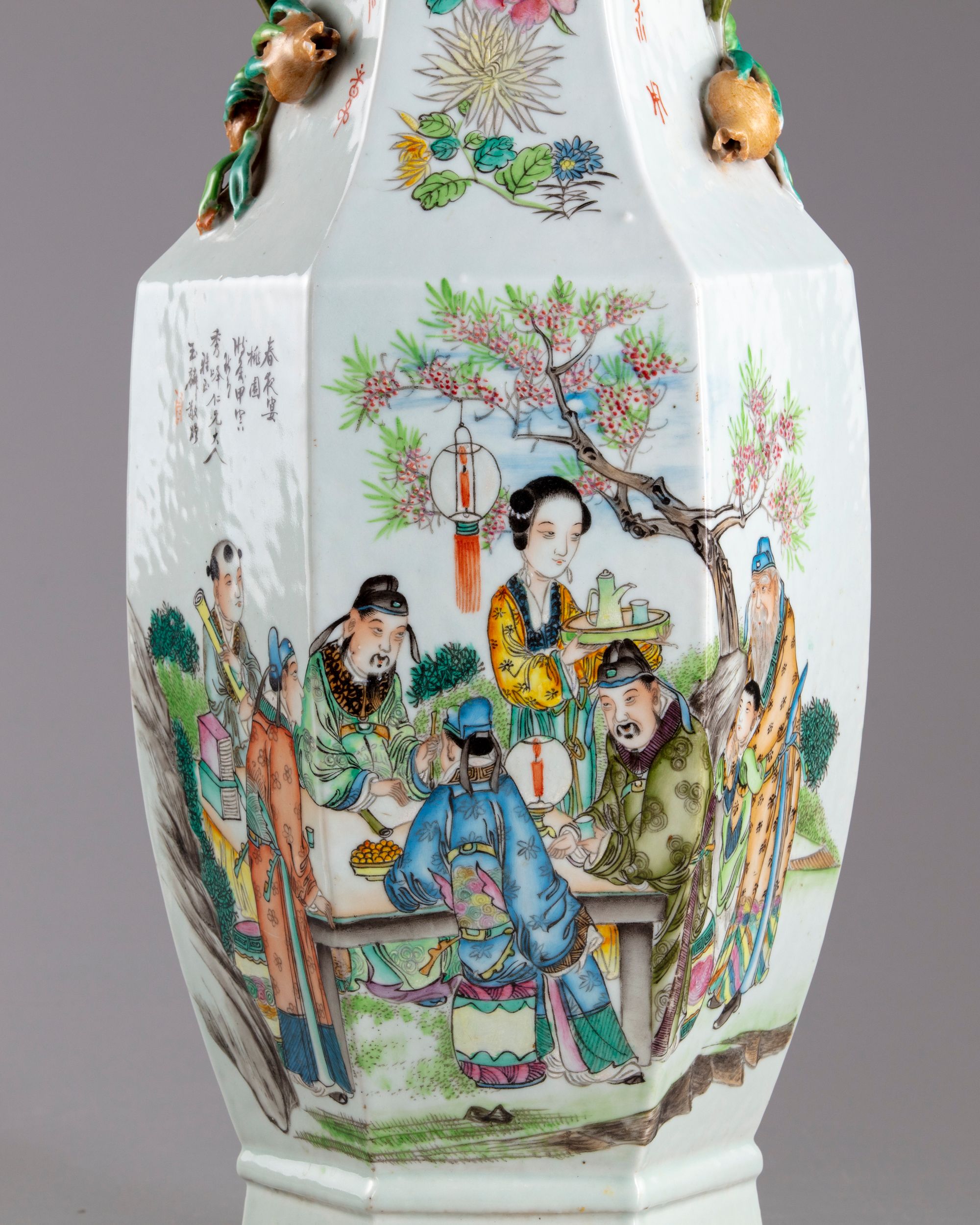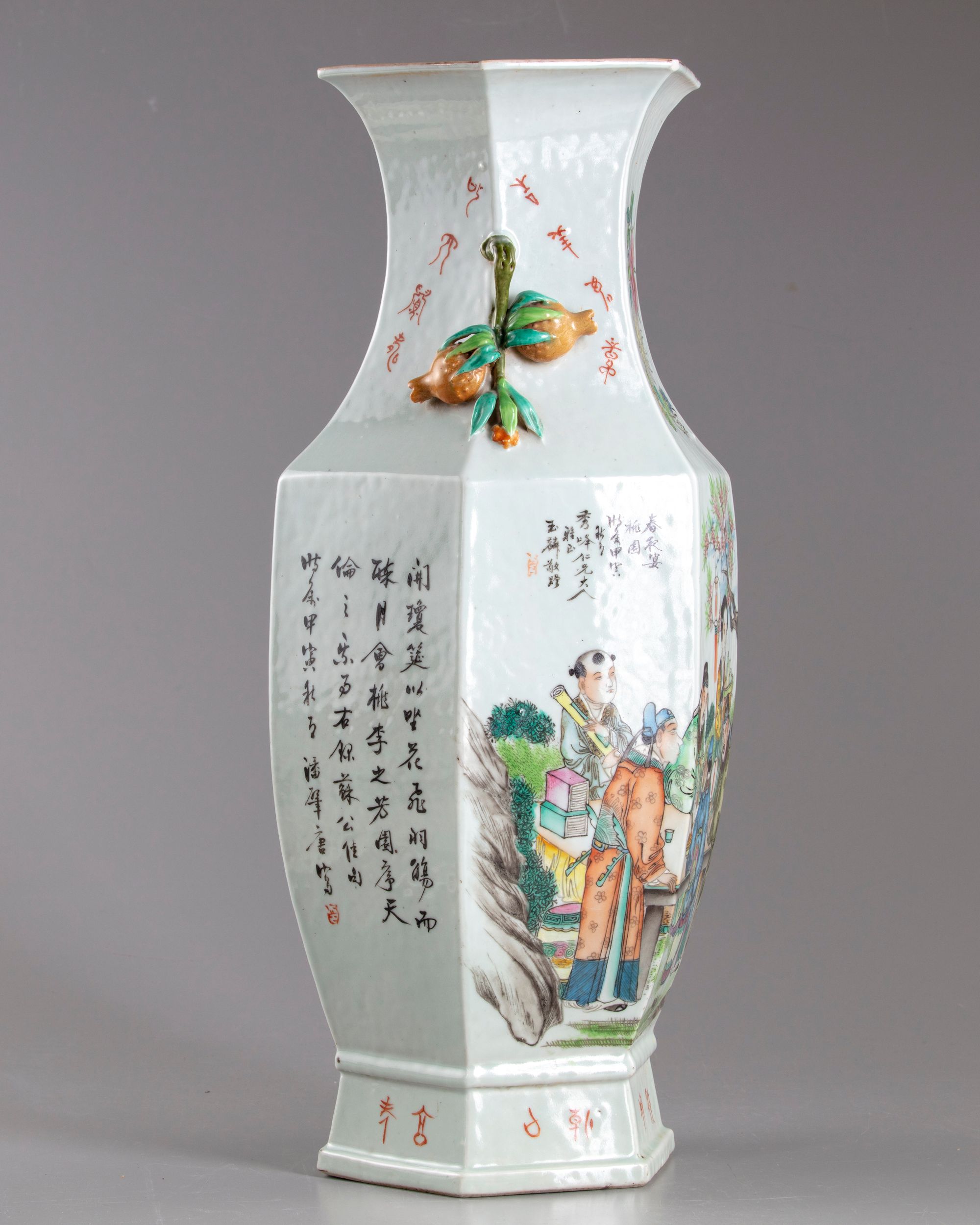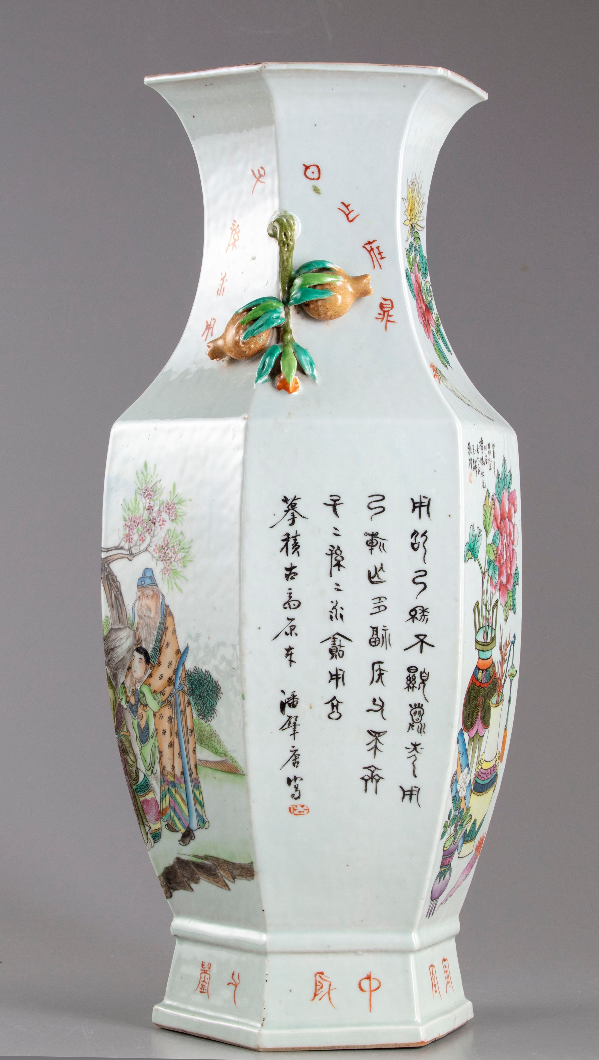 A Chinese porcelain hexagonal vase stylised with two pomegranates shaped handles, decorated around the sides with three scholars with kids and servants in a landscape with Chinese inscription.