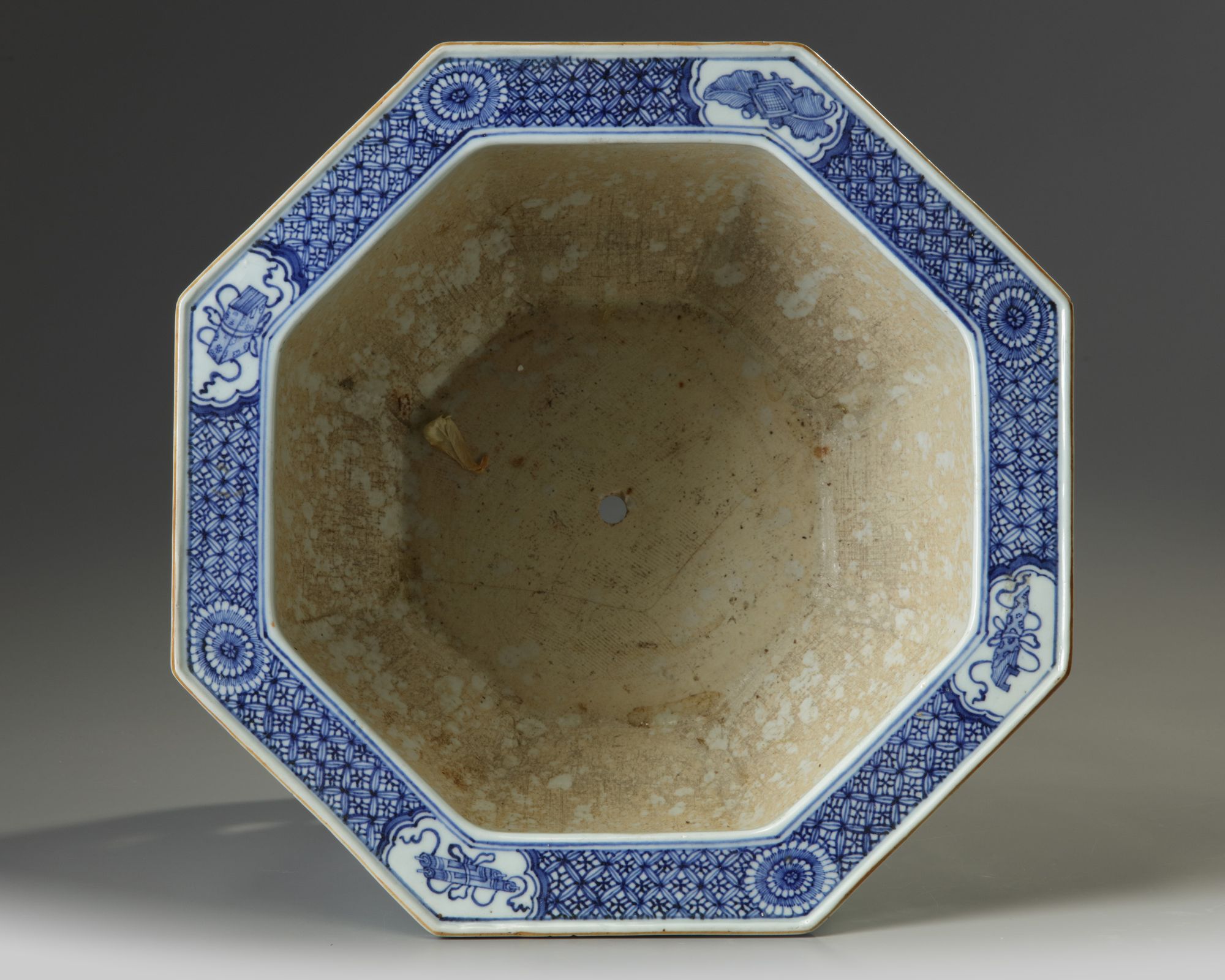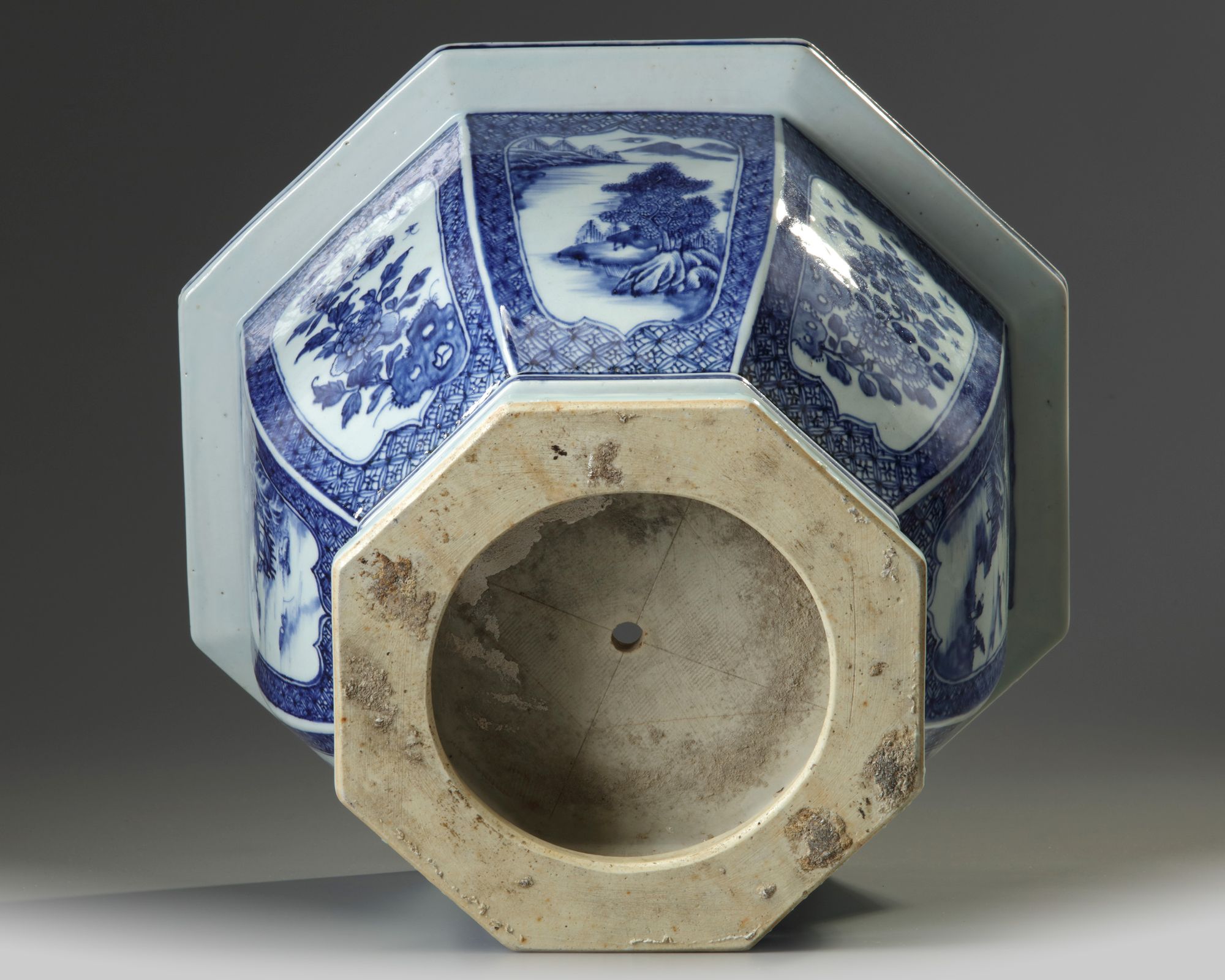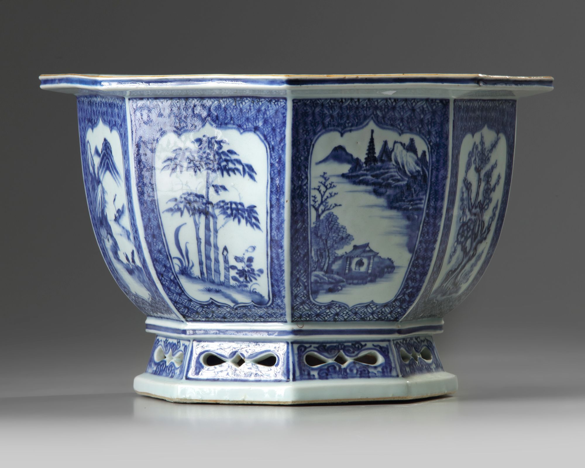 The rim decorated with cartouches enclosing precious objects and chrysanthemum heads, all reserved on a trellis band. Each side is decorated with a shaped panel is enclosing a landscape scene alternating with bamboo, prunus, peony and chrysanthemum, all surrounded by further trellis band. The openwork foot is decorated with a pierced design surrounded by scrolls.