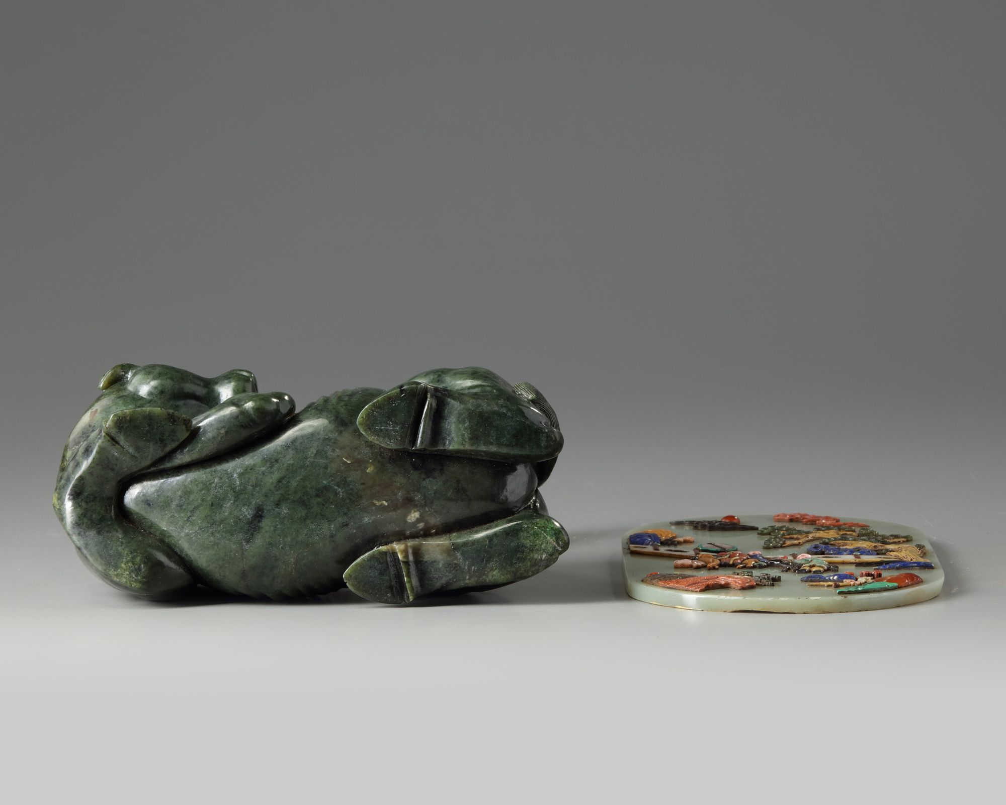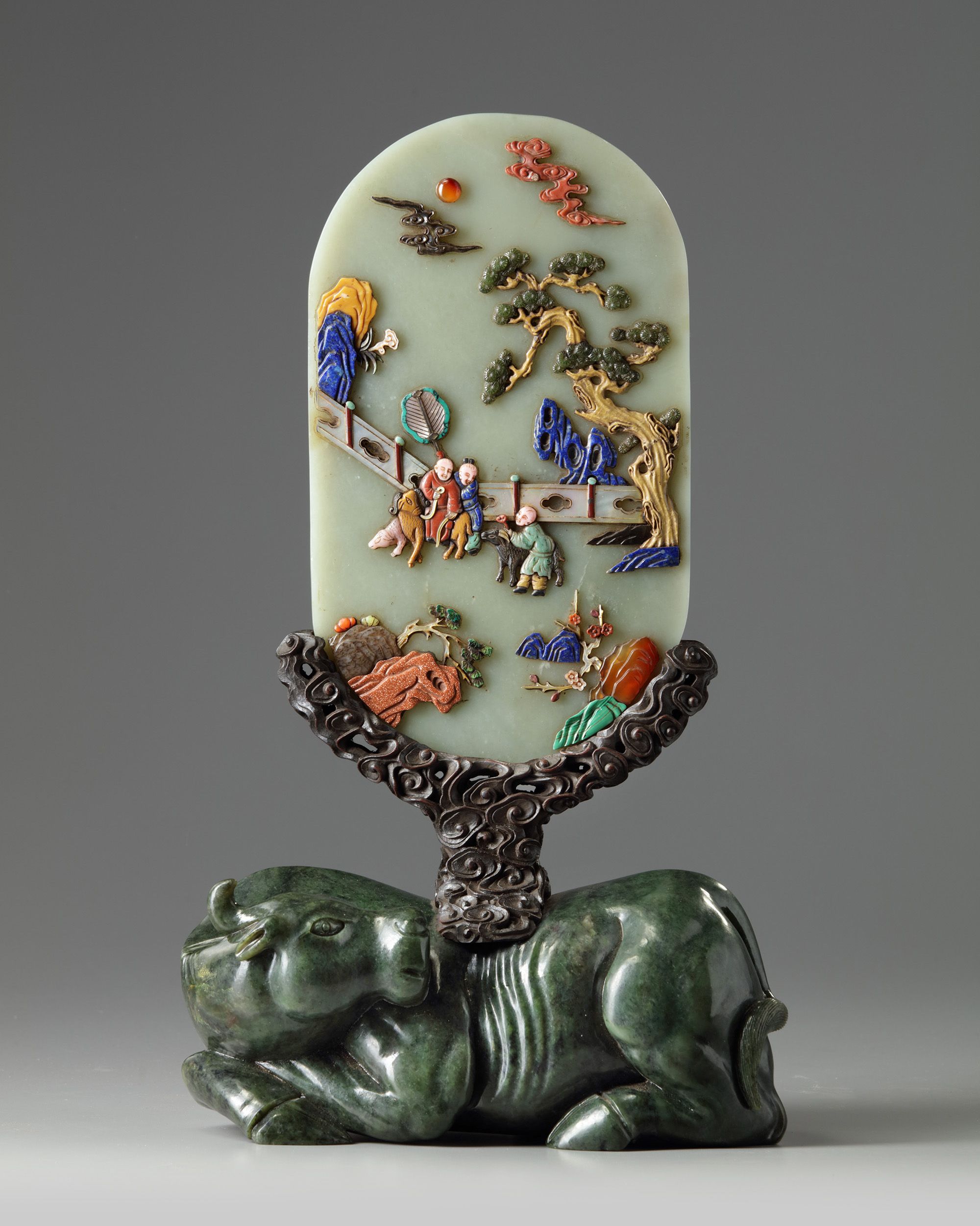 The jade plaque is delicately inlaid with mother of pearl and other hardstones depicting three boys at play amongst trees in a fenced garden, the reverse is decorated with gilt of a scene of scholar in a mountainous landscape. The plaque fits on an intricately carved wood stand which is supported by a large recumbent spinach-jade buffalo.