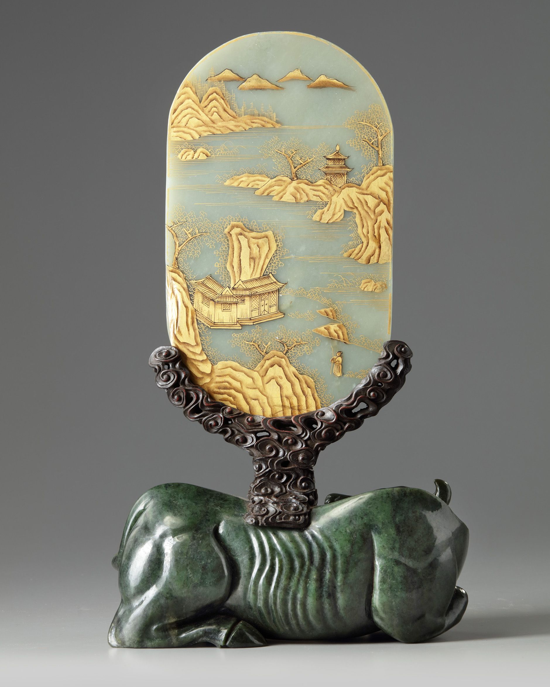 Overall height: 38 cm. high The jade screen: 24.5 cm. high, 15 cm. wide The bull: 22 cm. wide