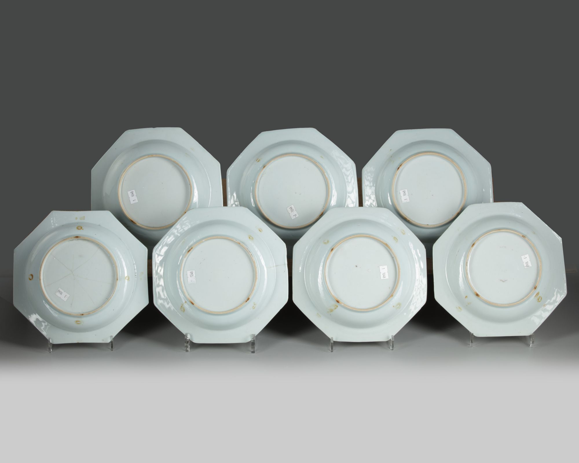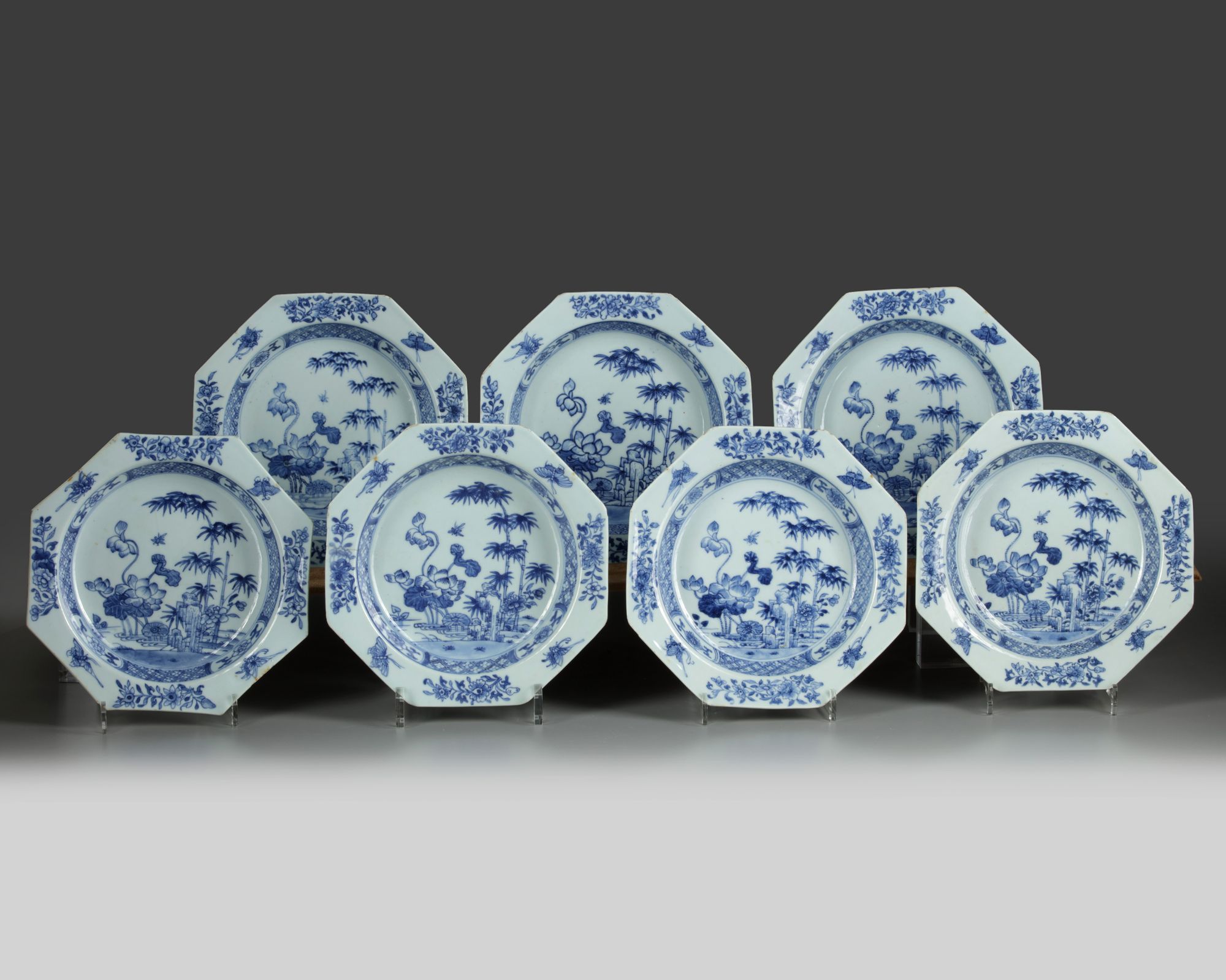 Each dish is decorated with a circular panel with a lotus pond next to bamboo and peony amongst rocks, the panel is encircled by a diaper band with floral cartouches.