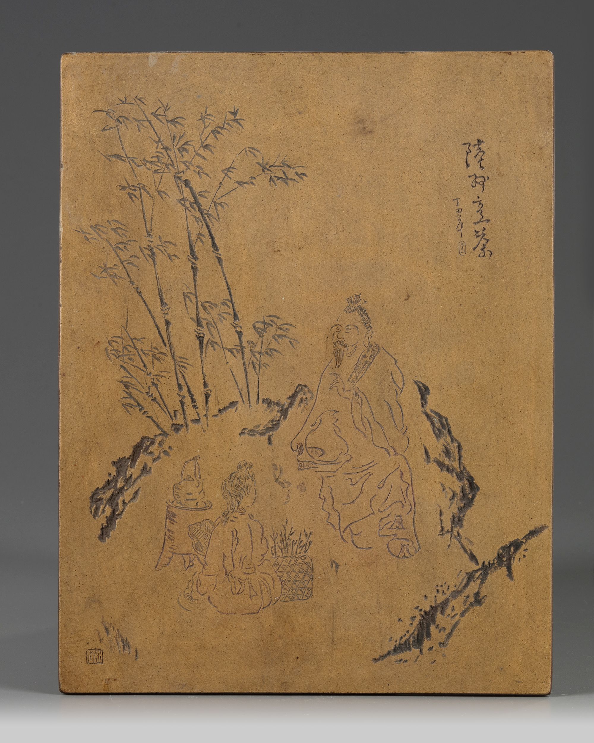 The plaque is depicting a scholar and an attendant, the scene inscribed and dated, the lower corner with a seal.